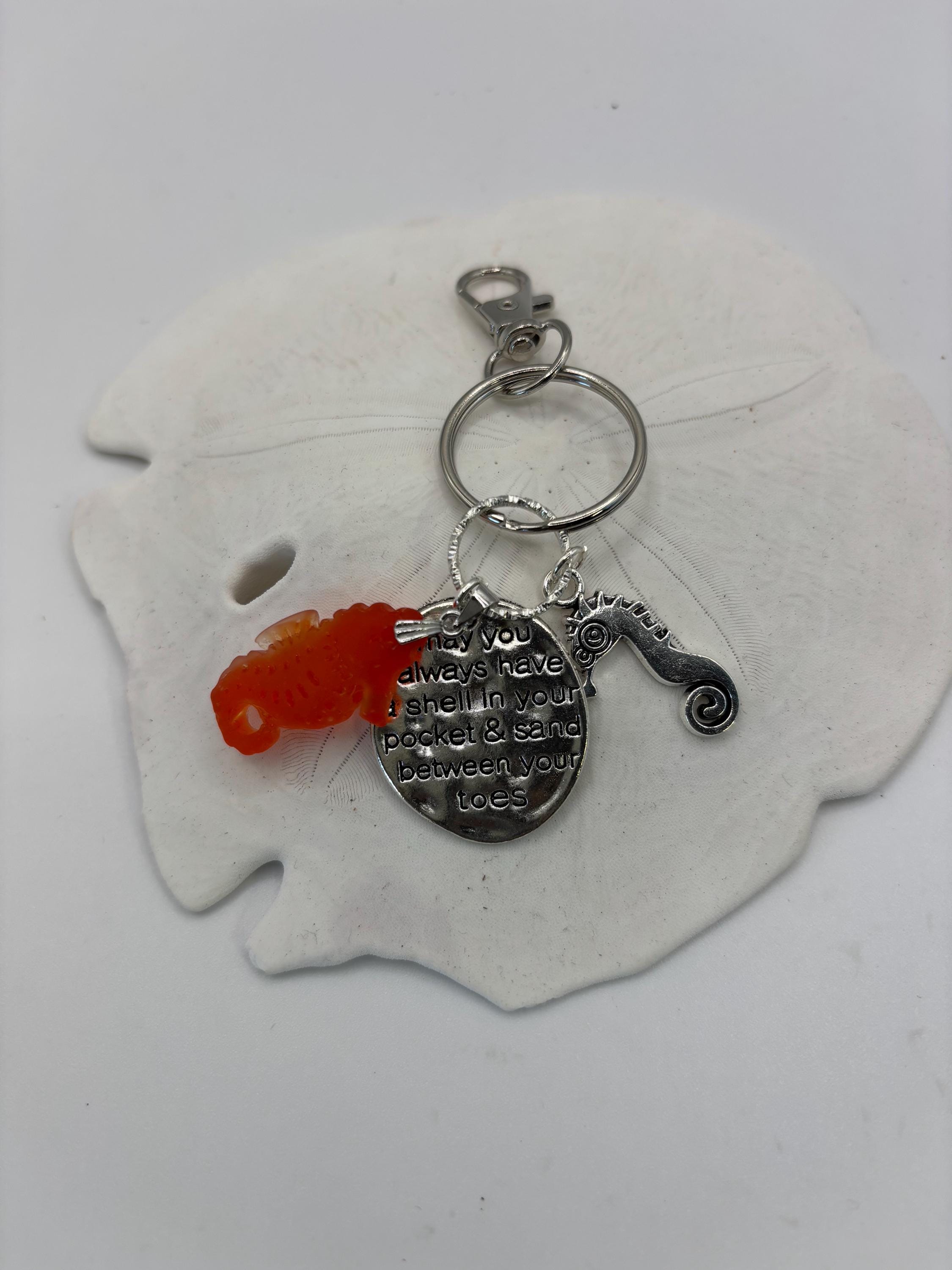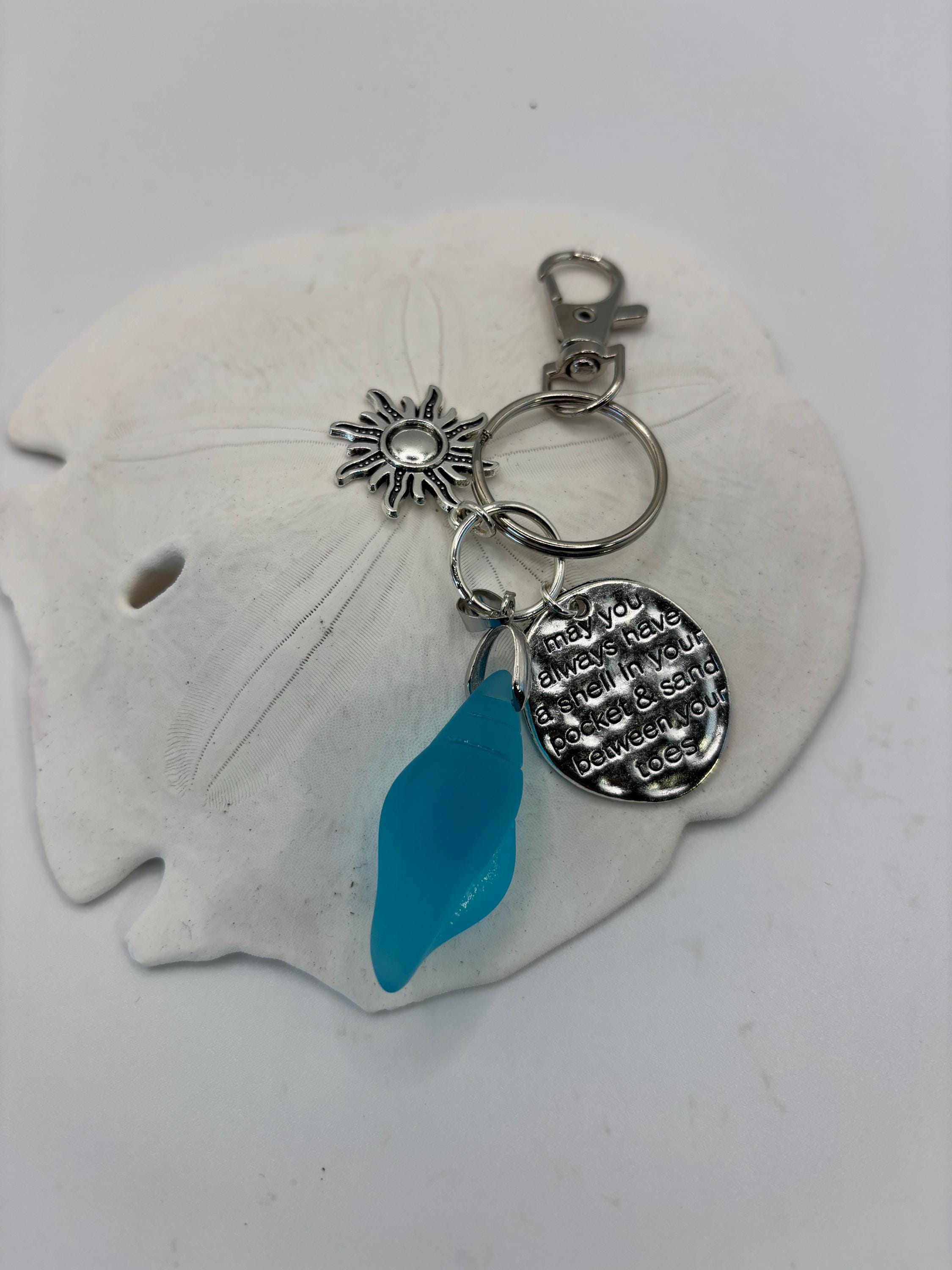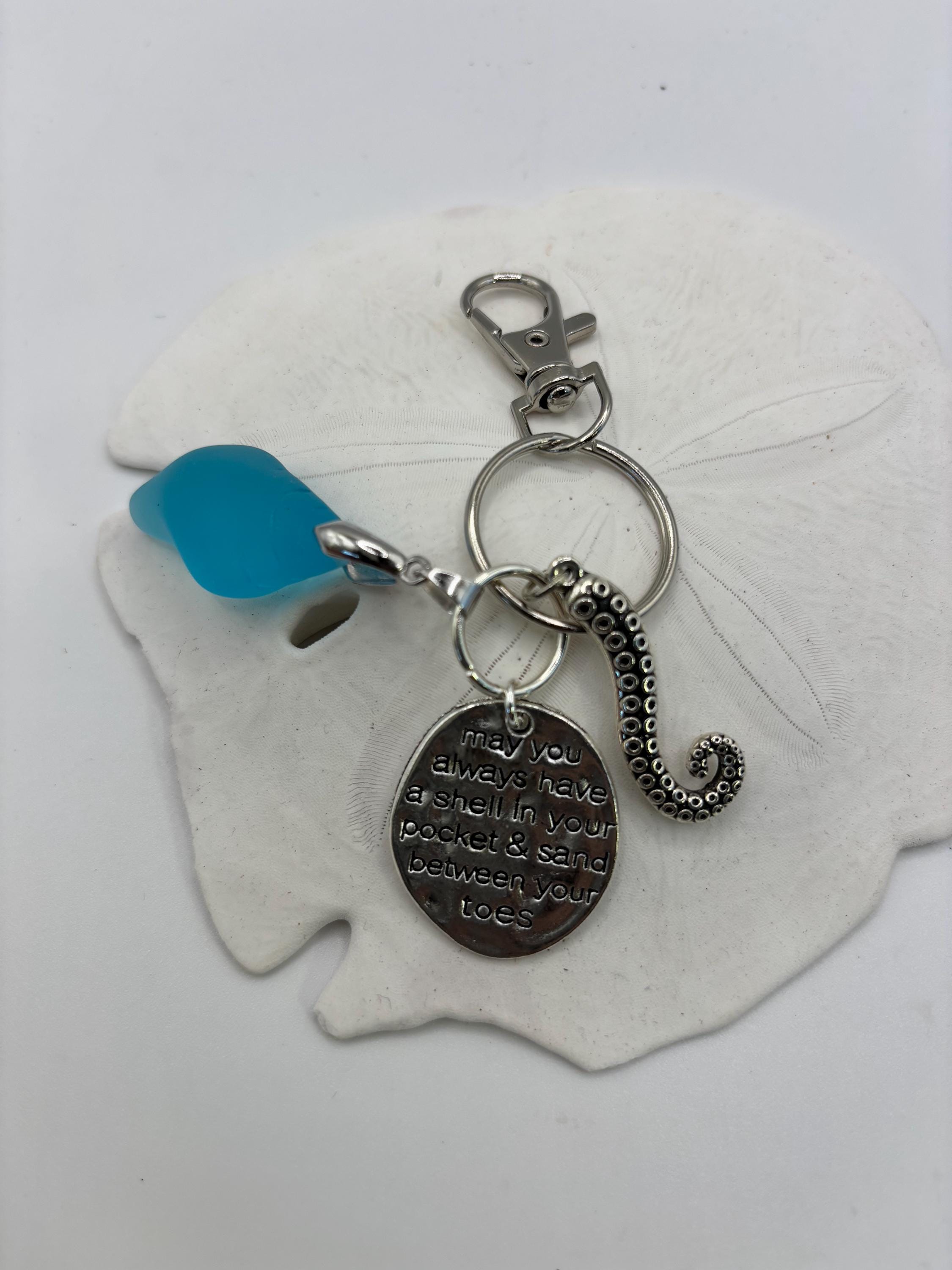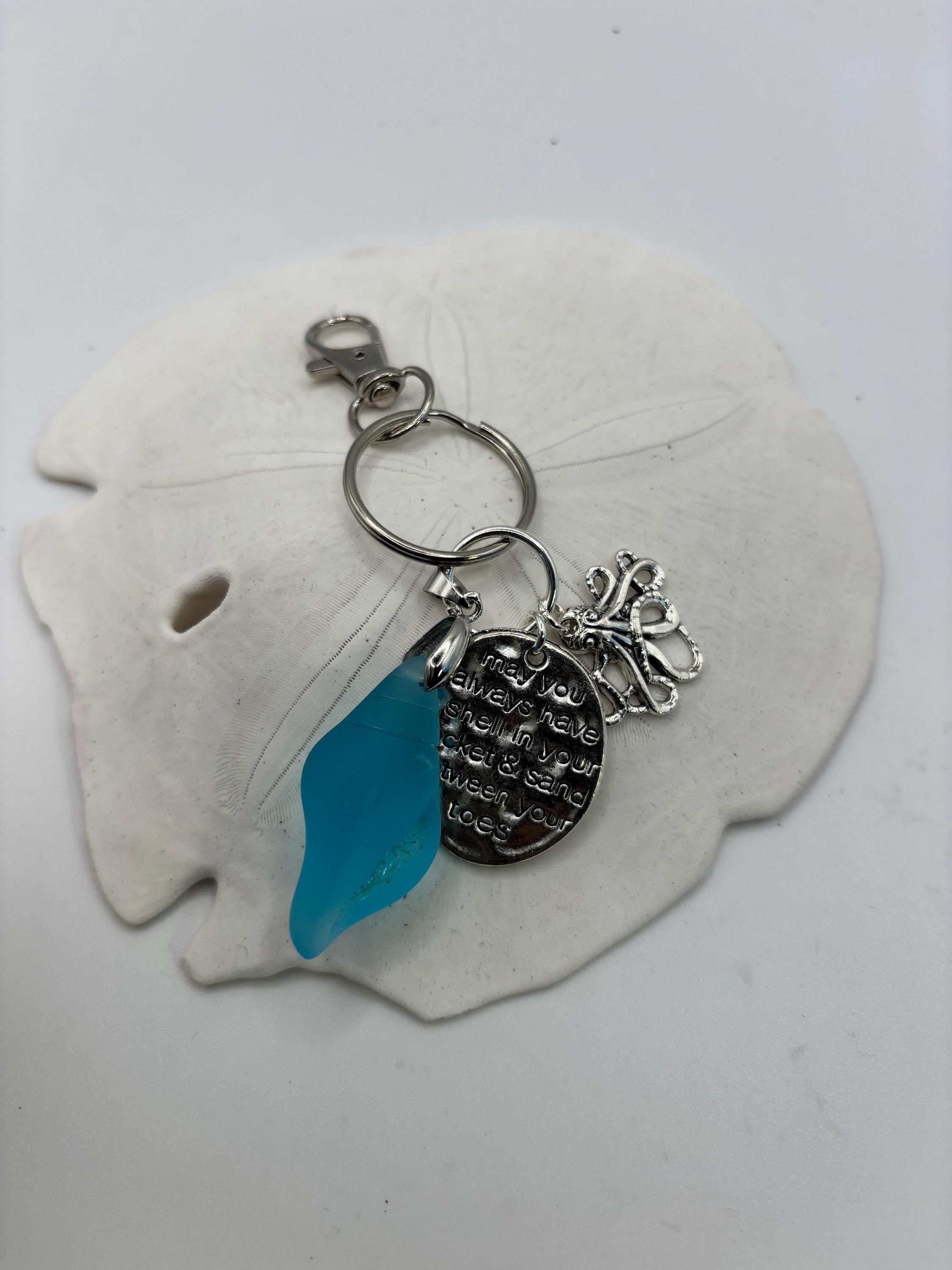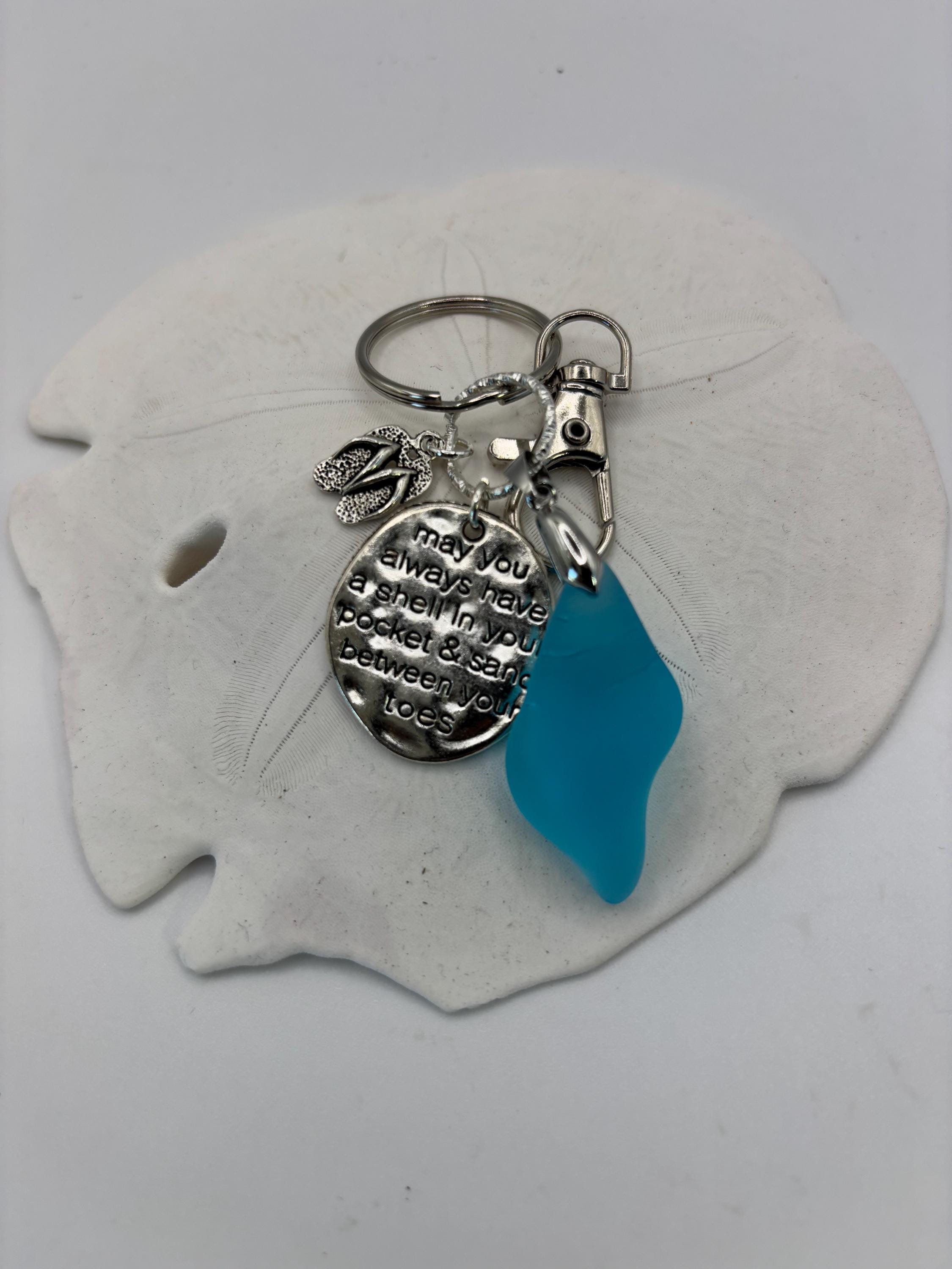 These pretty Seaglass keychains are a great gift for yourself or someone else ! Coastal Fun with a salt water charm, Seaglass and the quote charm “ May you always have a shell In your pocket and sand between your toes”.