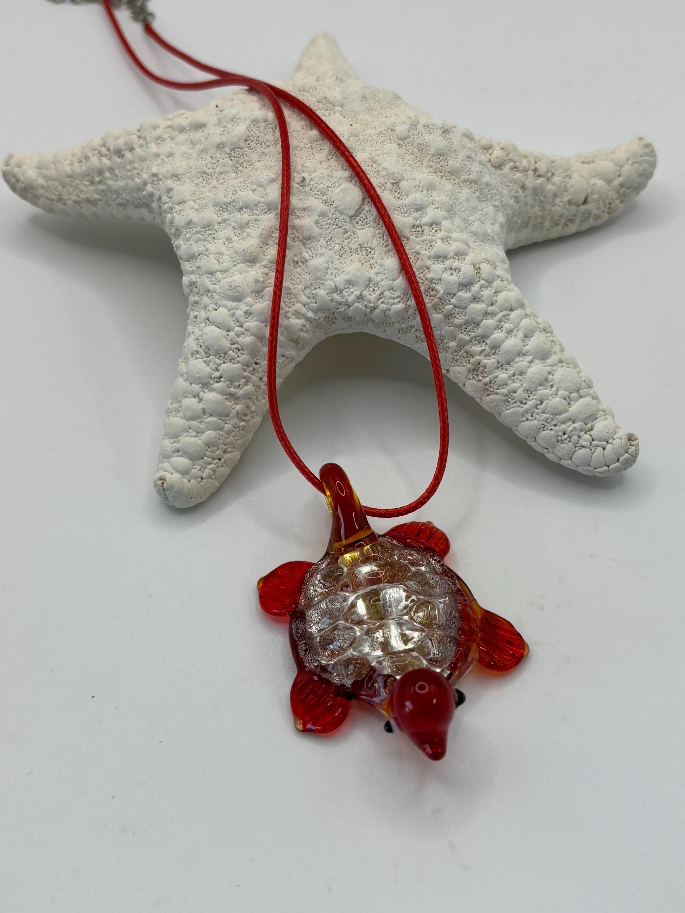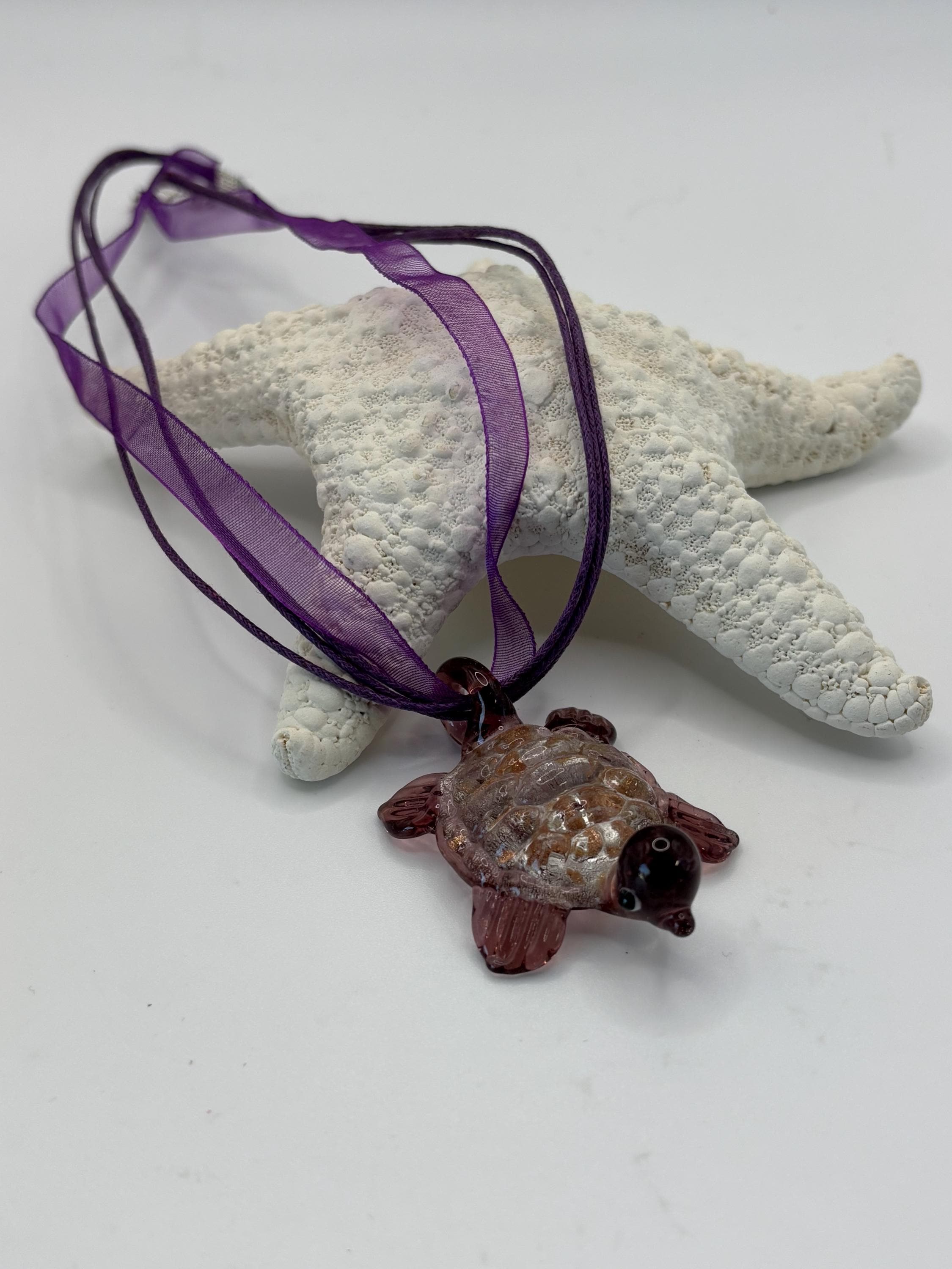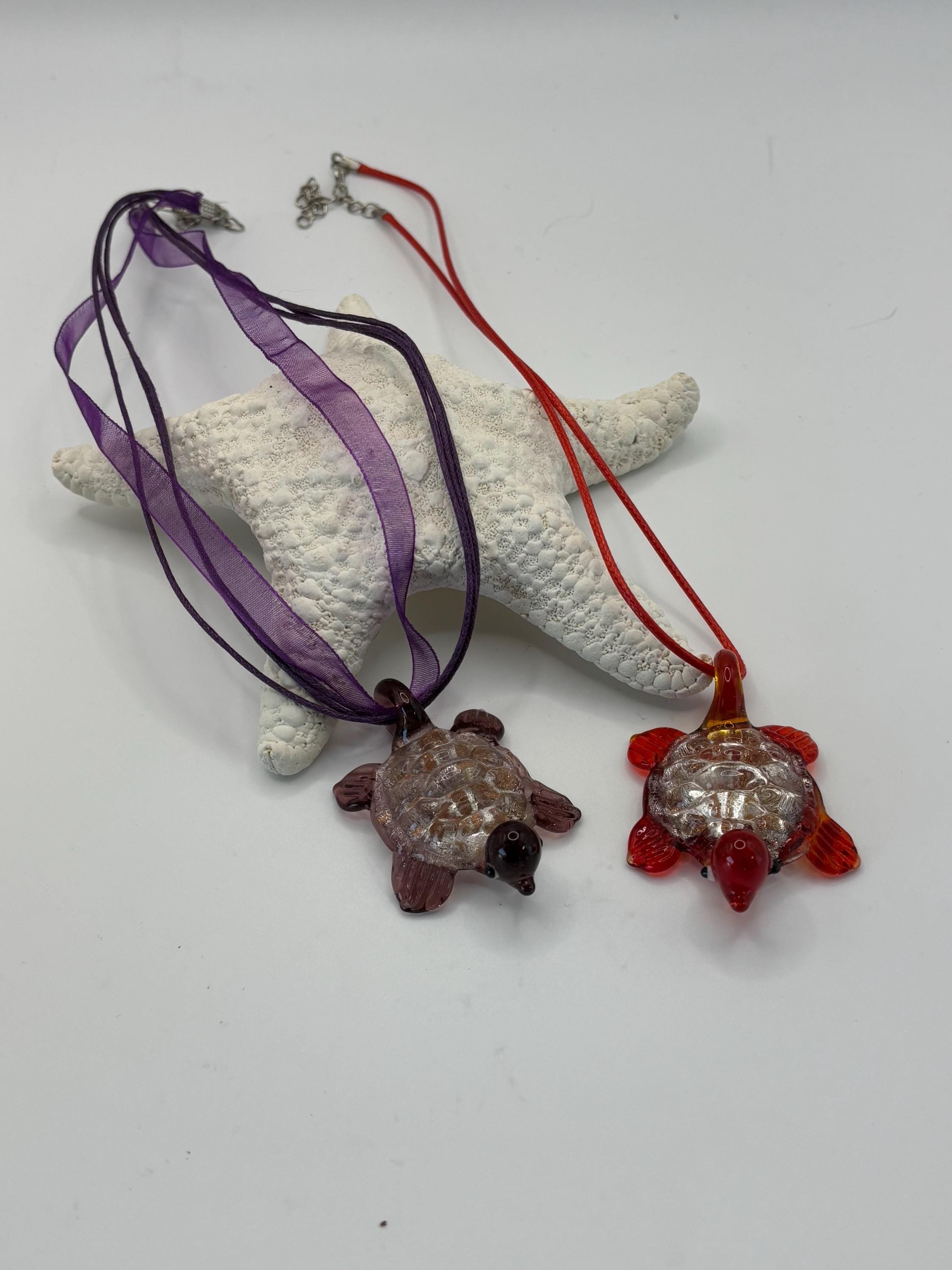 These necklaces are a Murano inspired glass turtles and are purple or red in color.