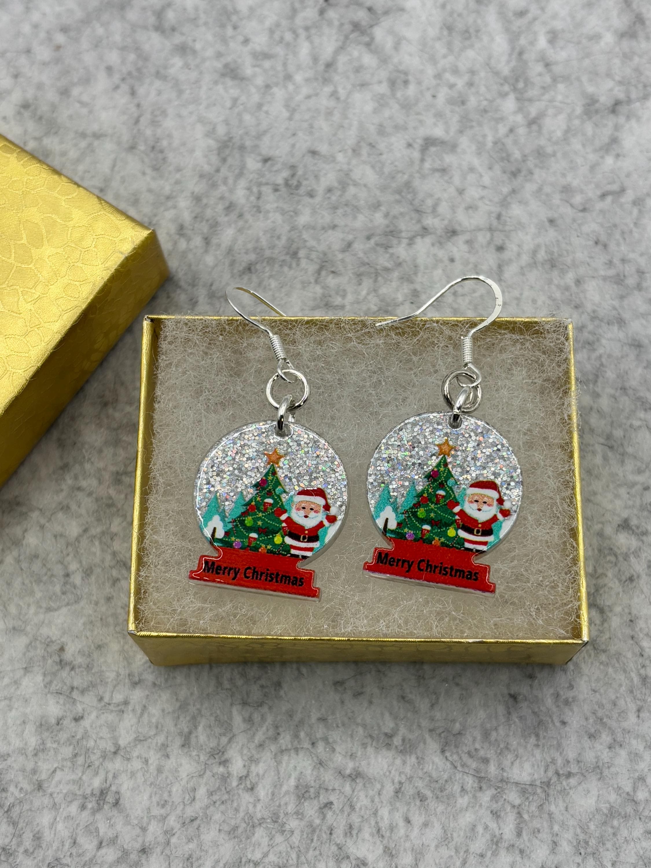 These light weight Christmas snow globe earrings are acrylic and will be the perfect accessory for Christmas.
