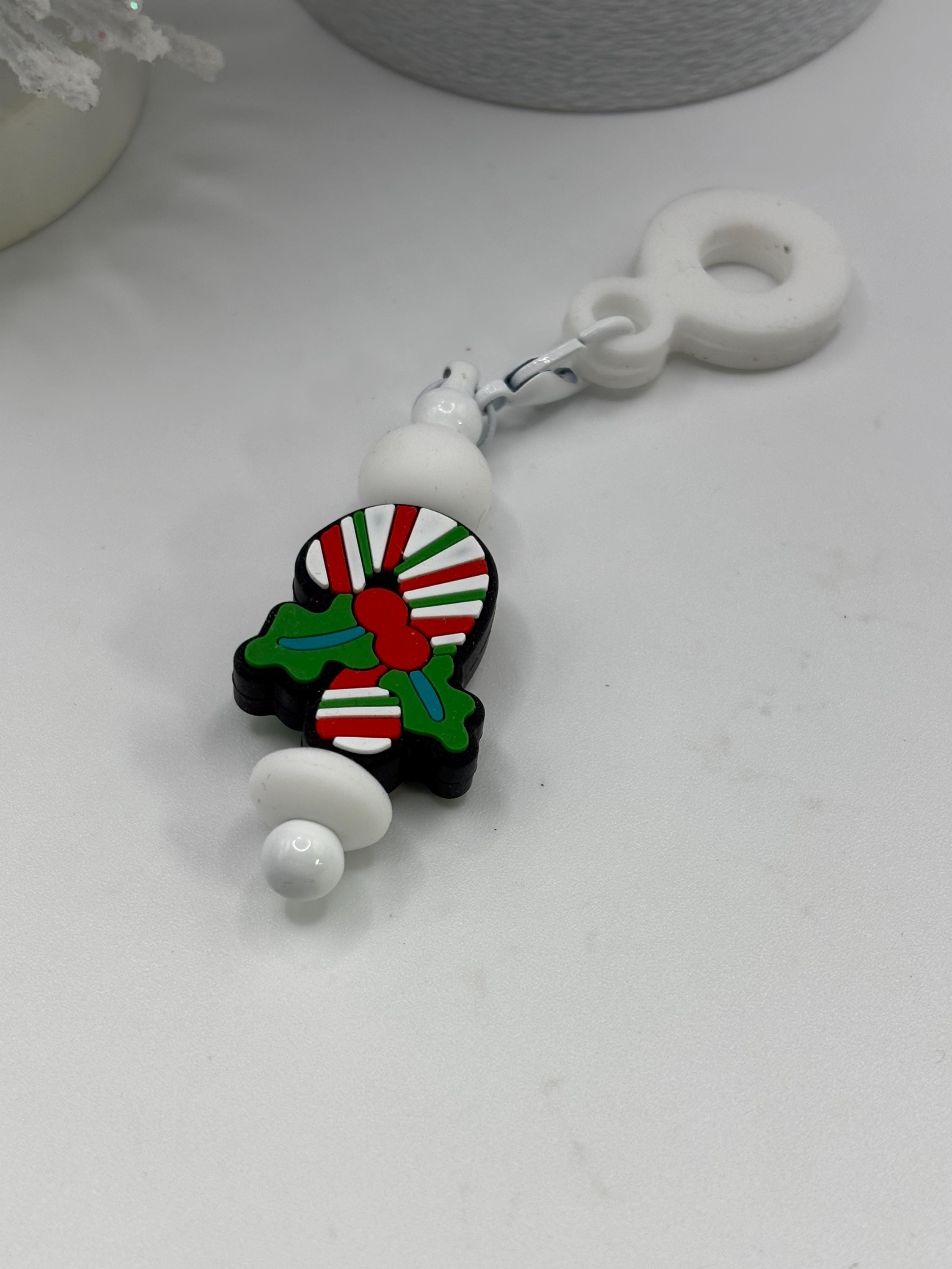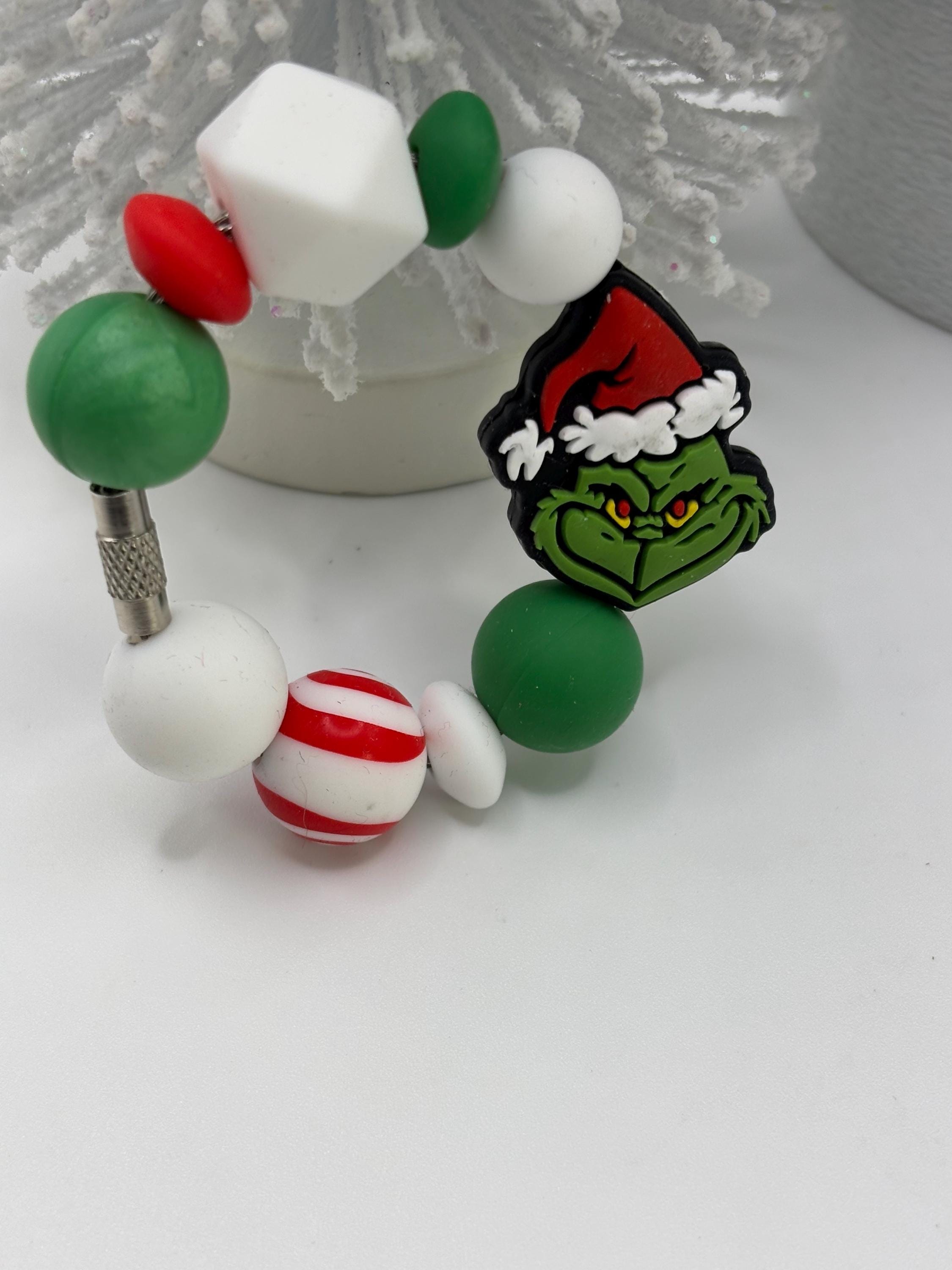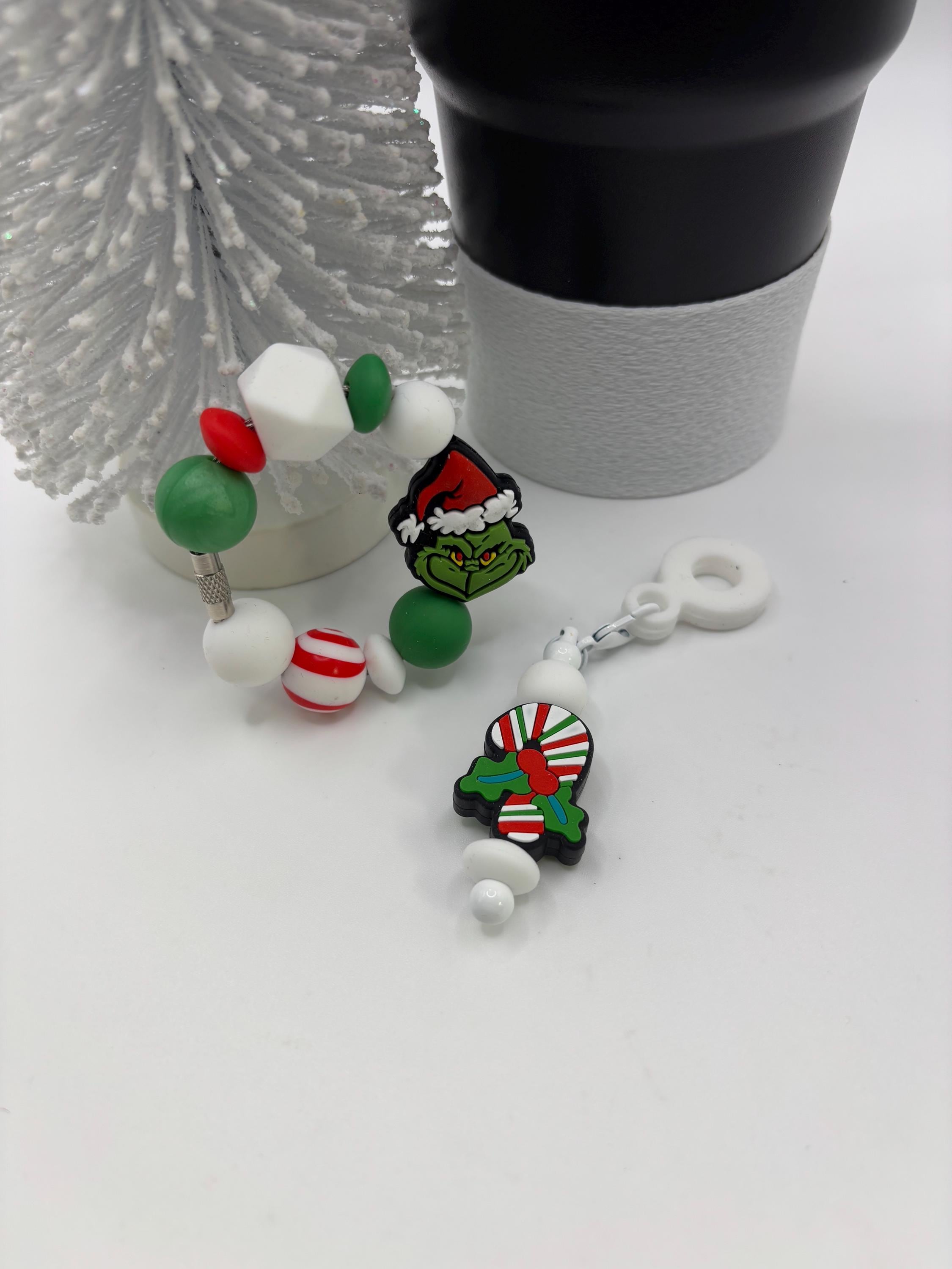 These holiday handle bracelets and straw charms are made for your Tumbler and are shown on a 30 Ounce Stanley. They will fit any tumbler with a handle and or straw.