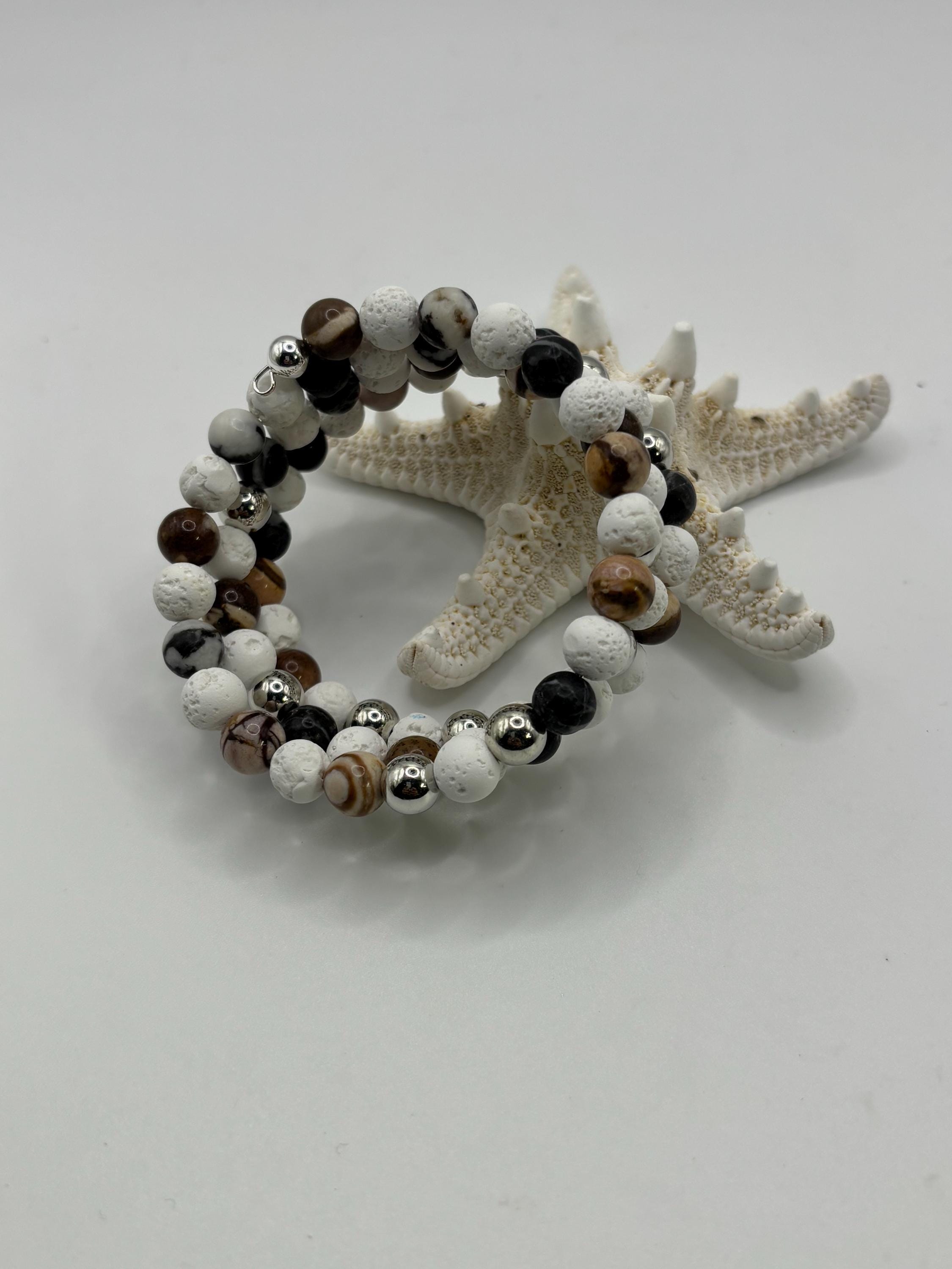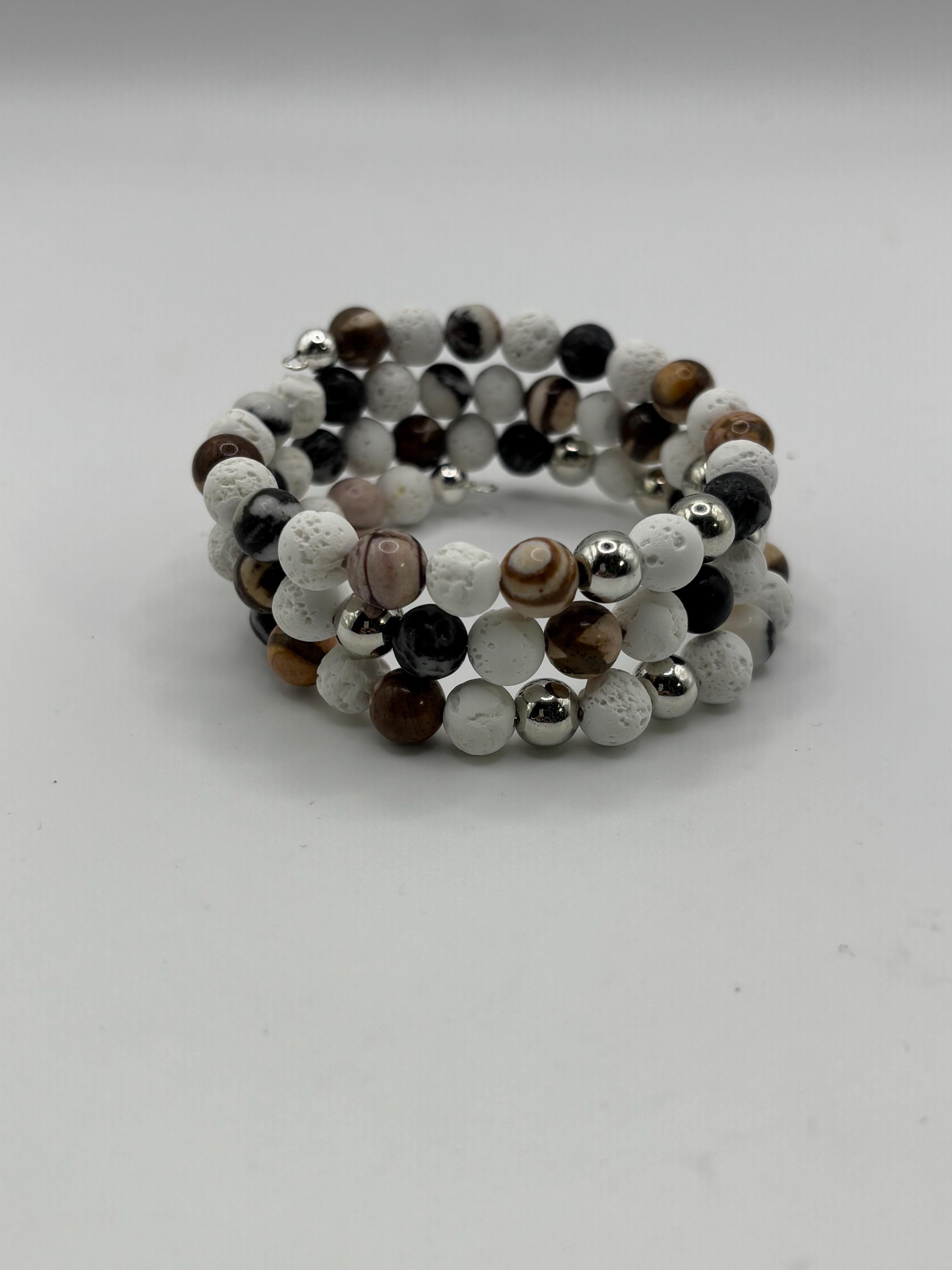 Add a touch of sophistication to your style with our elegant memory wire multistrand bracelet, made with Zebra Jasper in both black and brown colors gemstones and White Lava gemstones with silver accent metal beads.