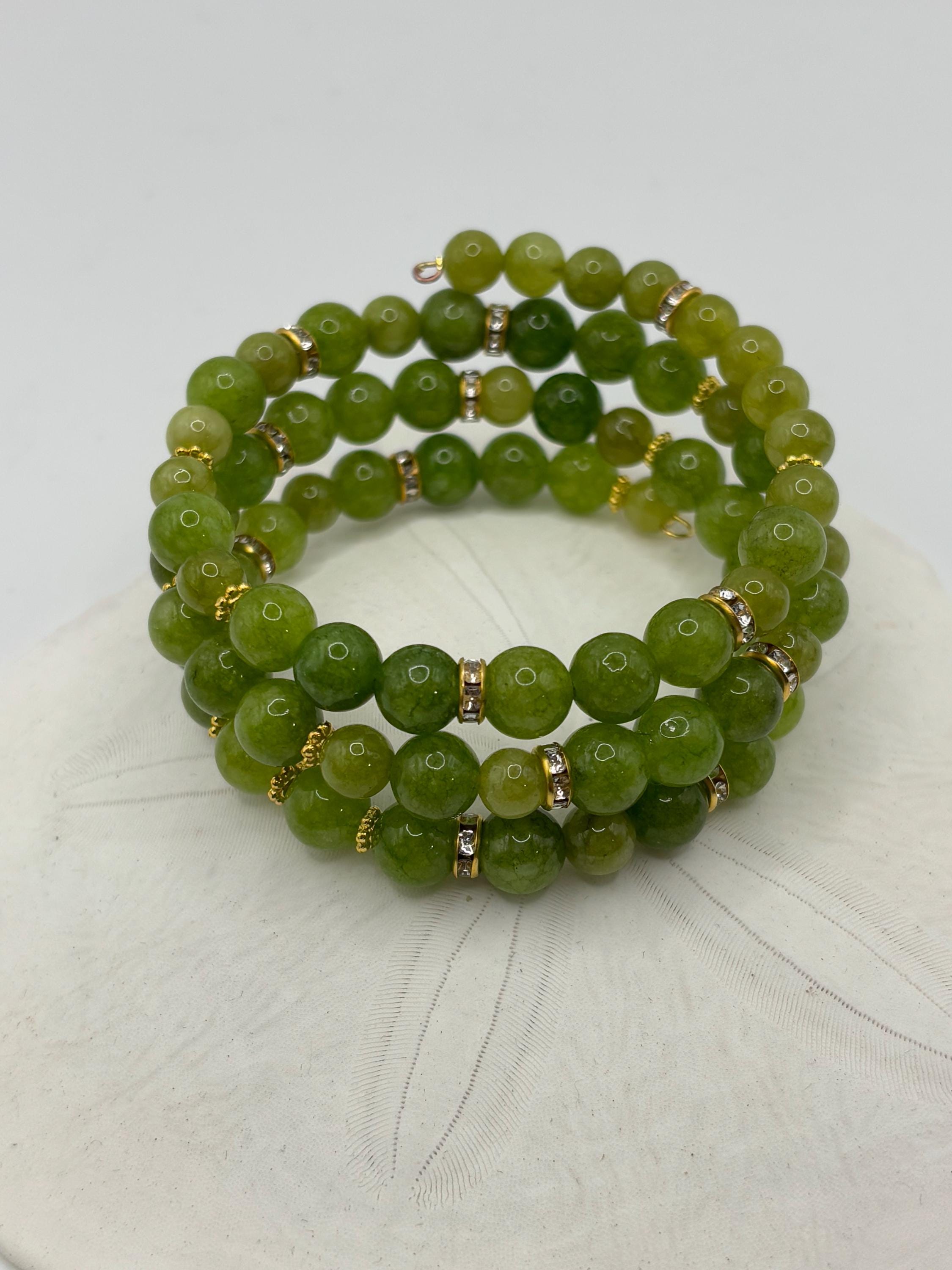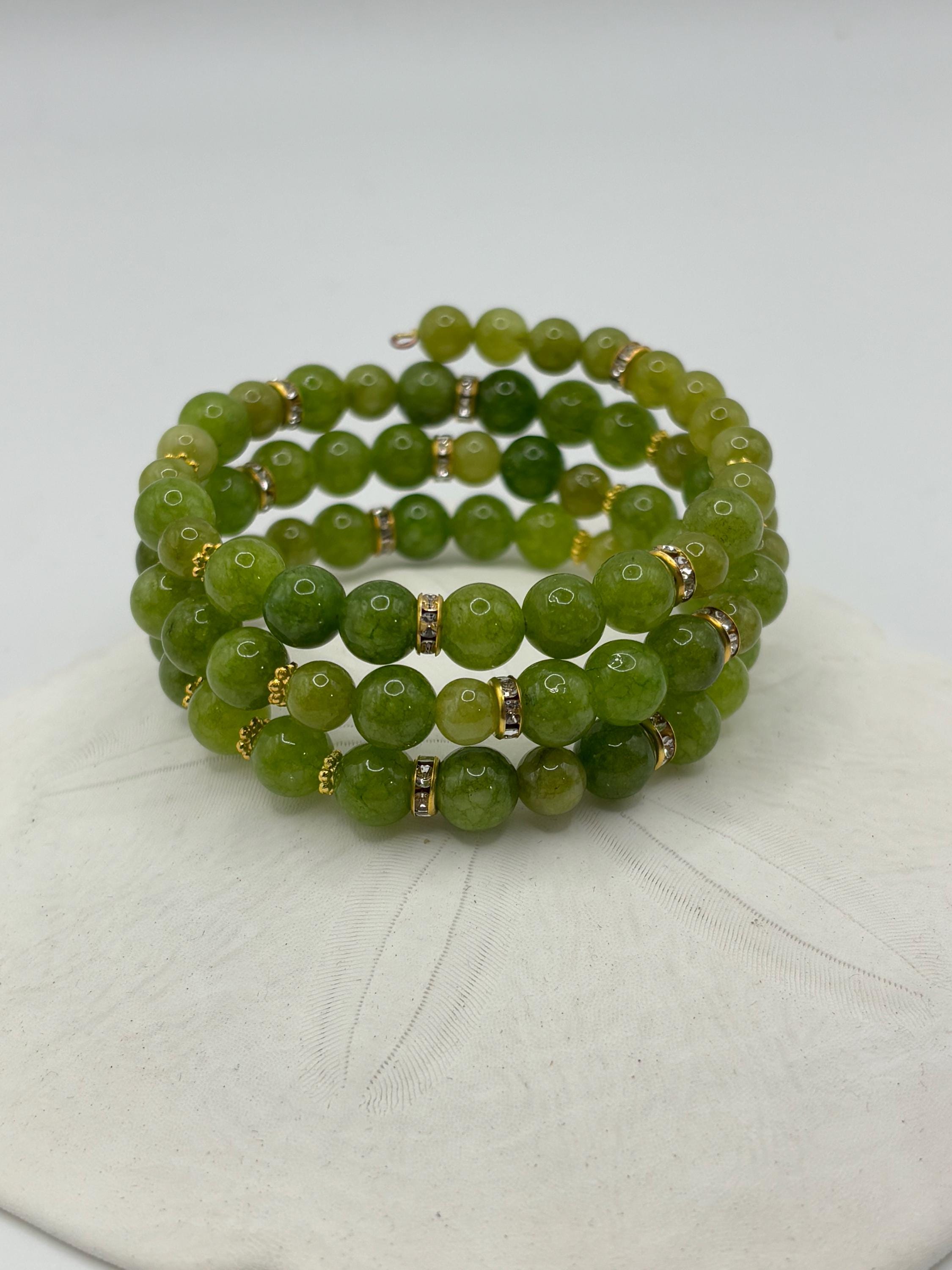 Add a touch of sophistication to your style with our elegant memory wire multistrand bracelet, made with Natural Peridot gemstones with gold accent metal beads. Peridot stones are olive green in color.