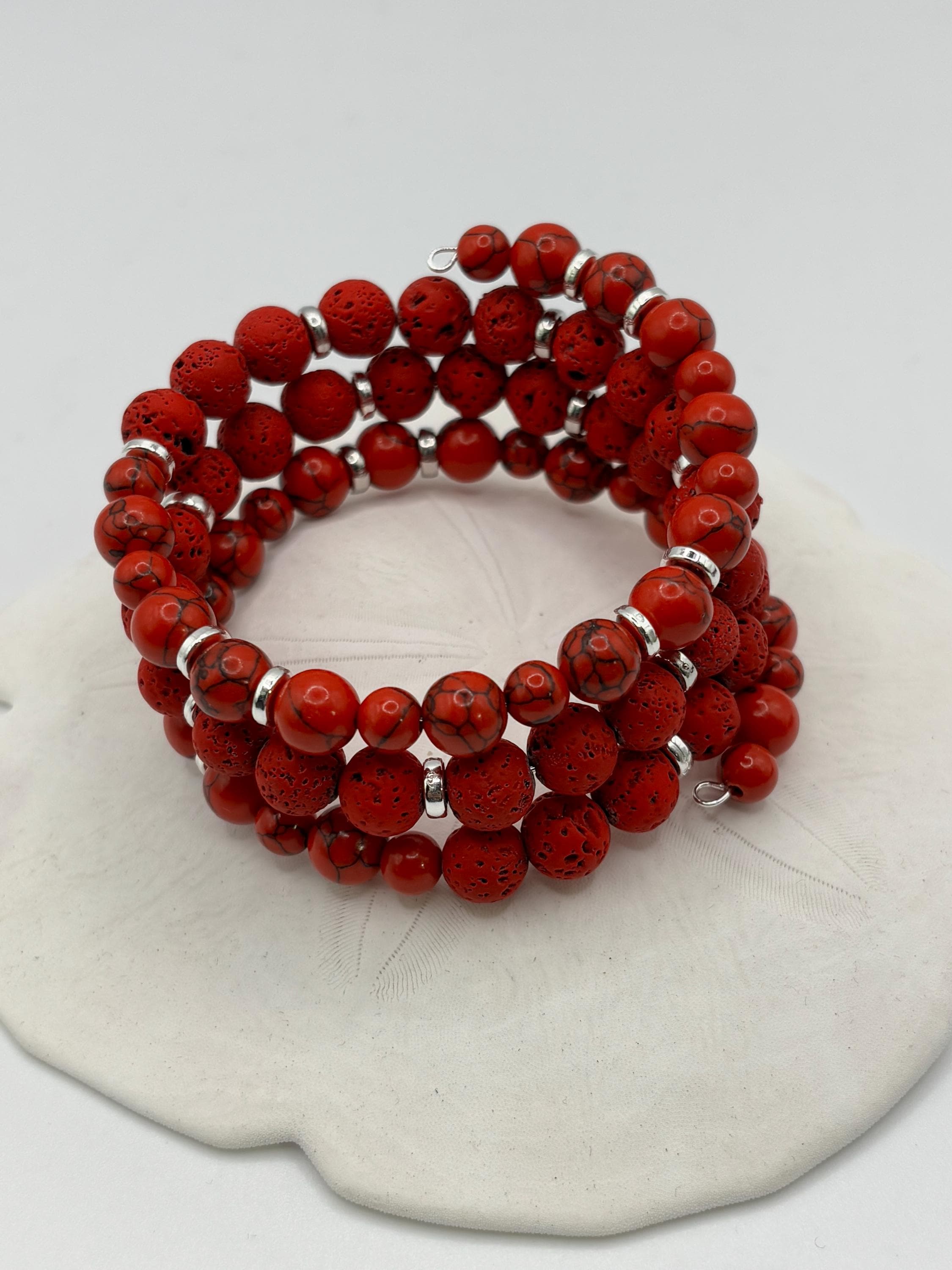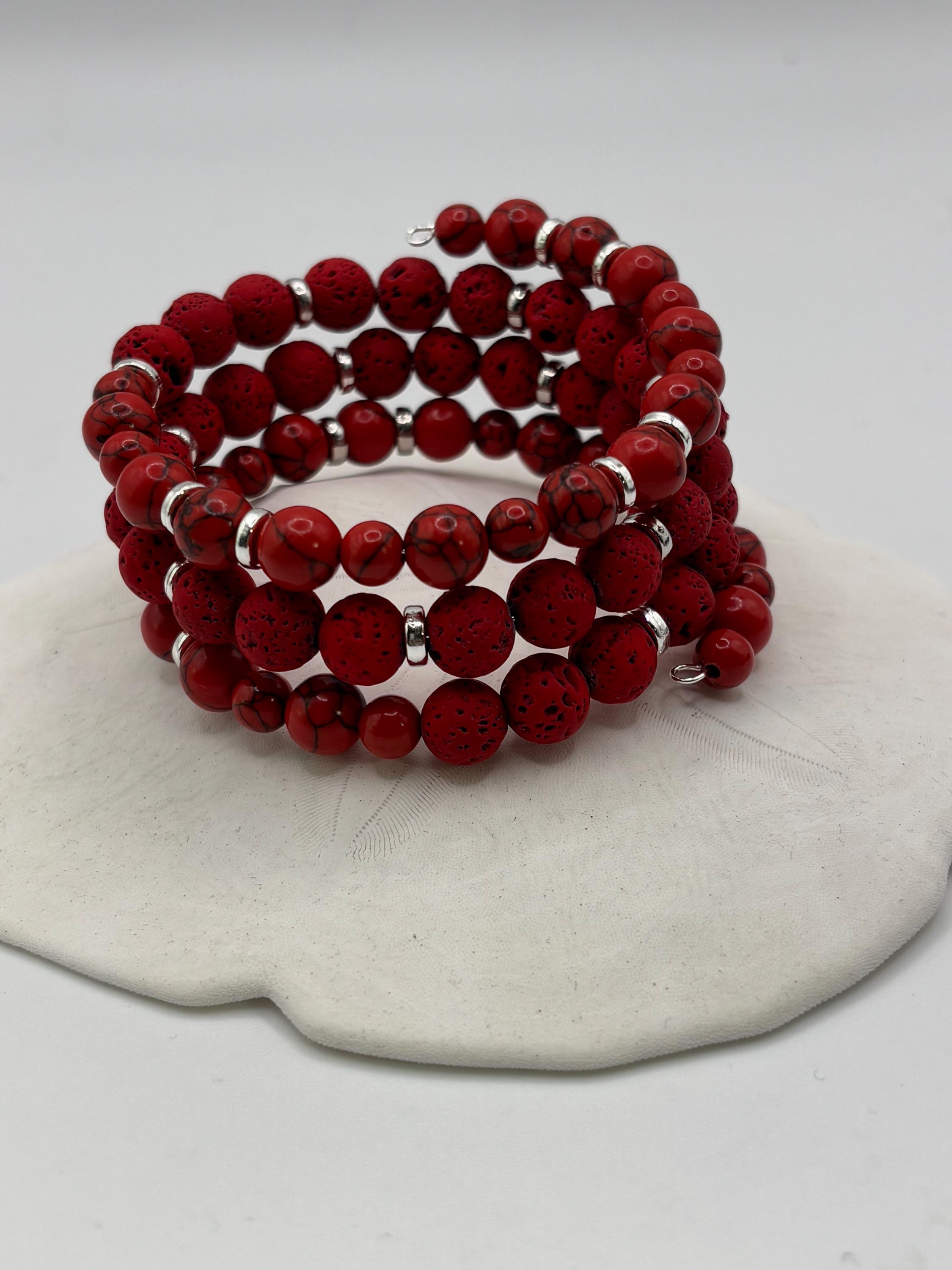 This is a red turquoise Howlite gemstone memory wire multistrand bracelet made with Red Turquoise Howlite gemstones Red Lava rock and silver accent metal beads.