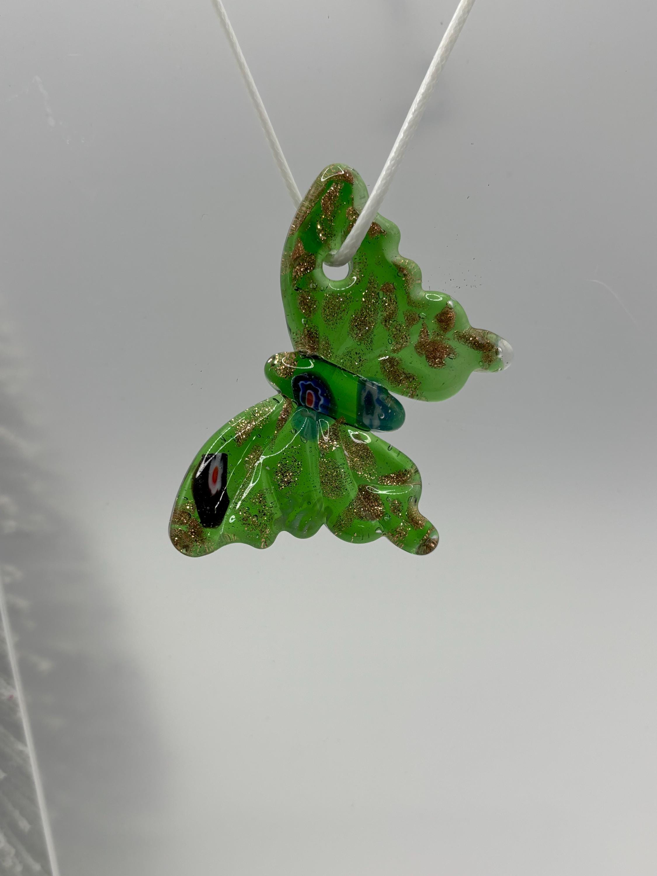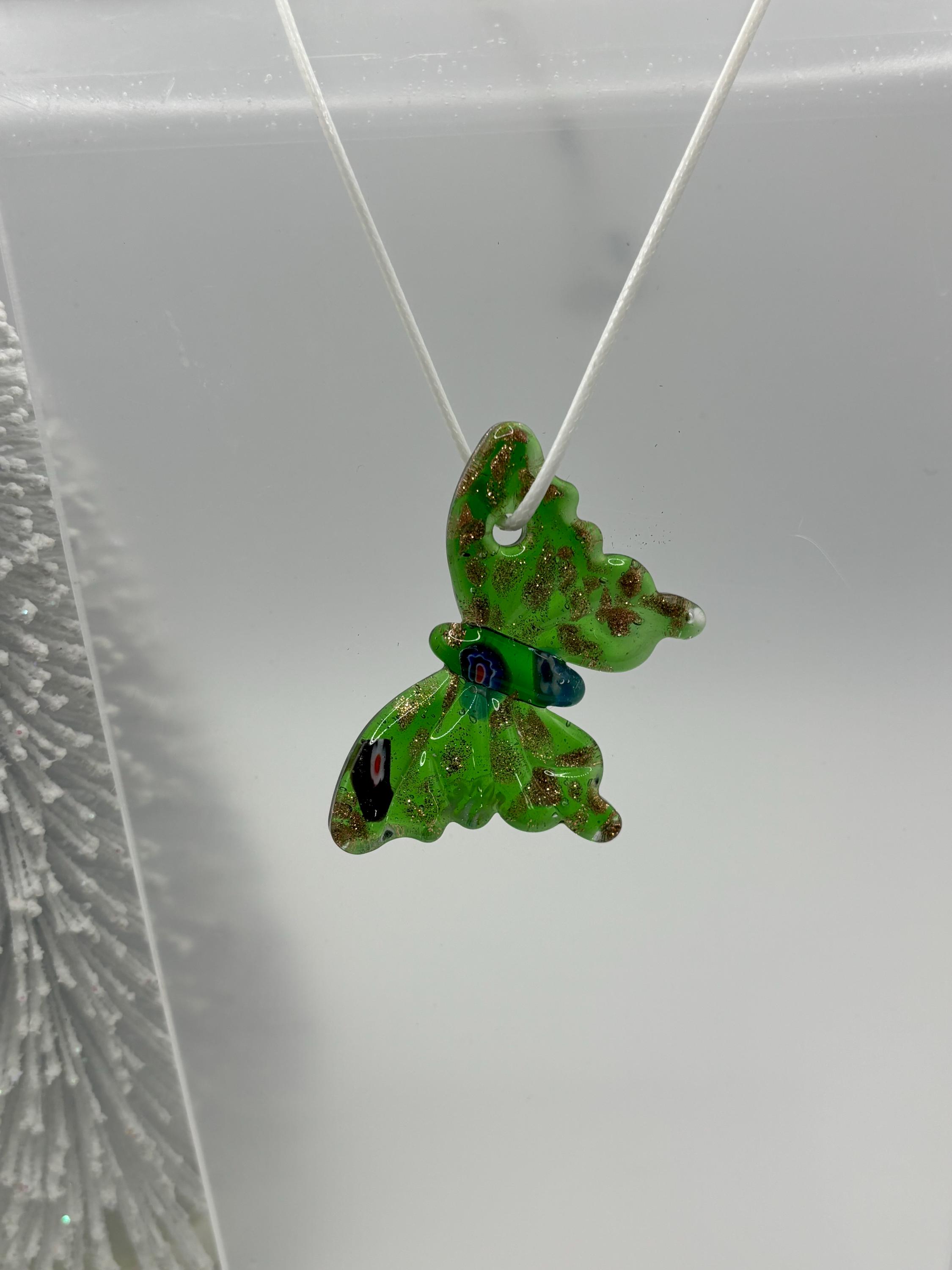This is a Glass Lampwork Butterfly pendant necklace, Murano inspired with Christmas vibes and Holiday colors. Millefiori Lampwork