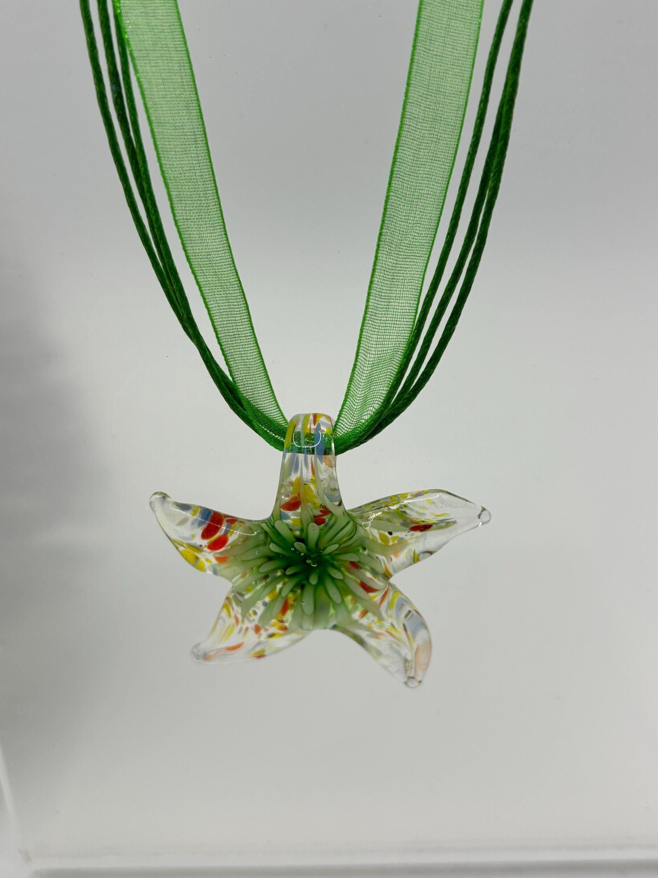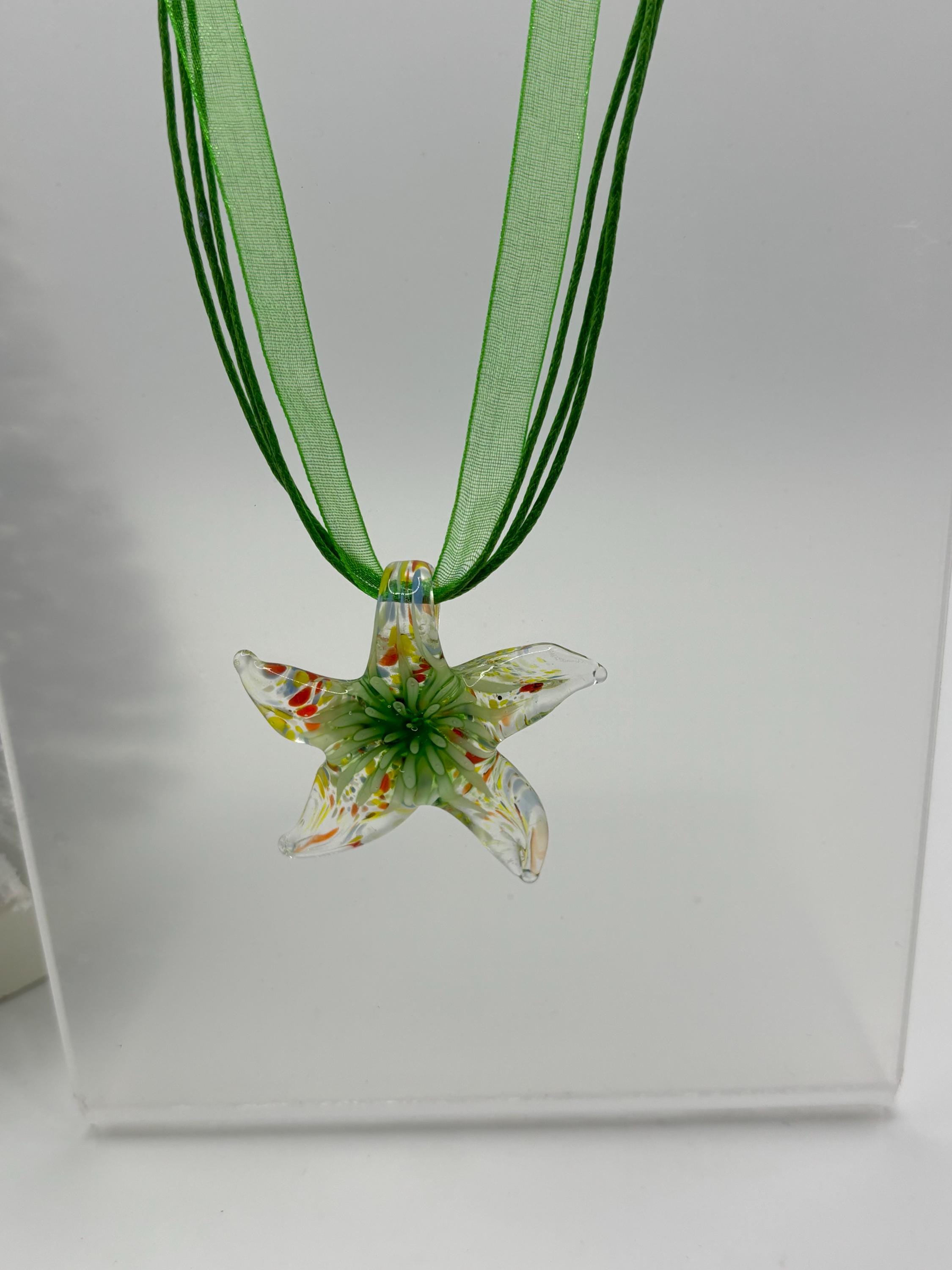 This is a Glass Lampwork Starfish pendant necklace, Murano inspired with Christmas vibes and Holiday colors.