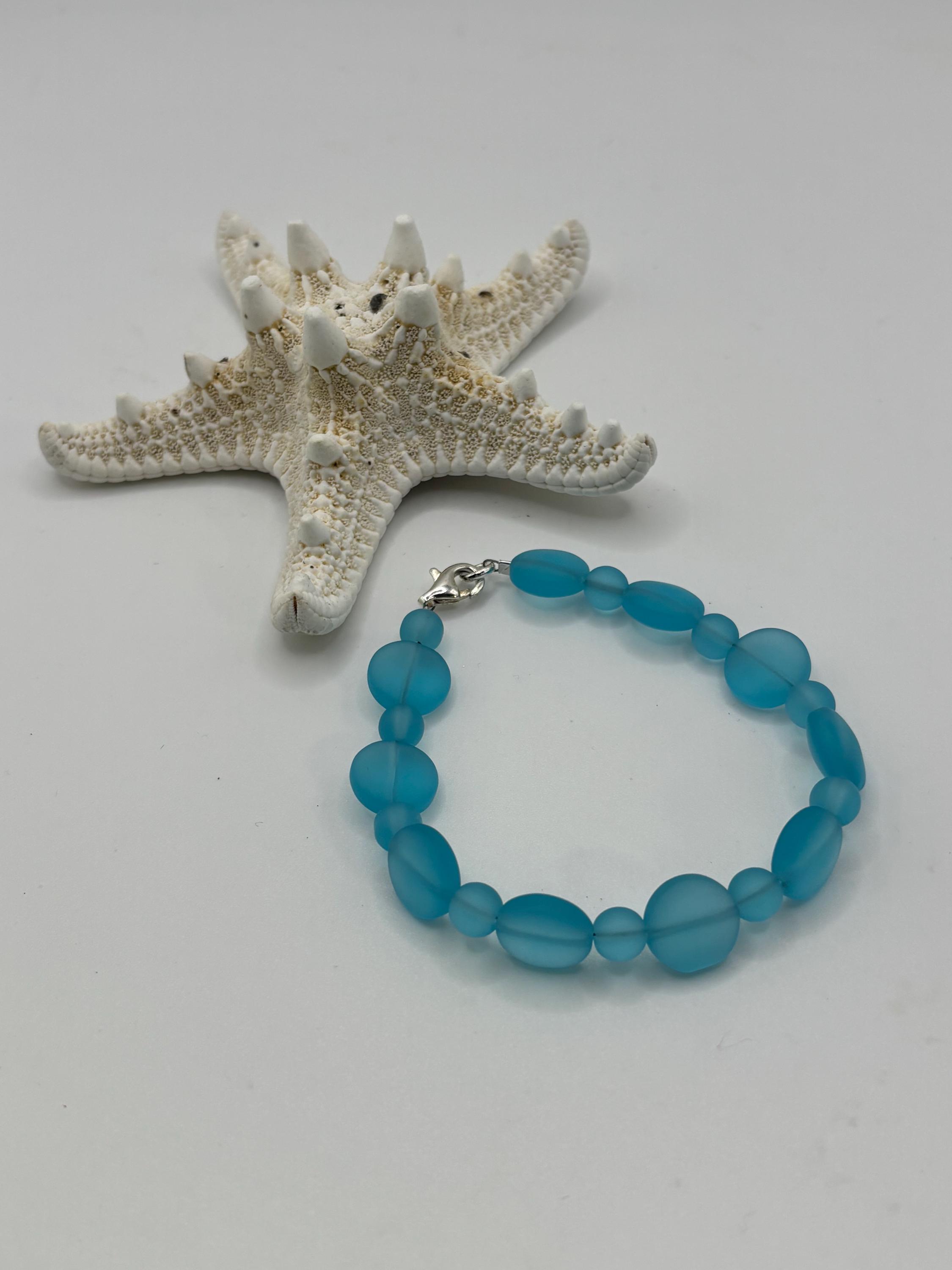 This beautiful Seaglass bracelets is made with Turquoise blue Colored Seaglass in both round and puffed coin shapes.