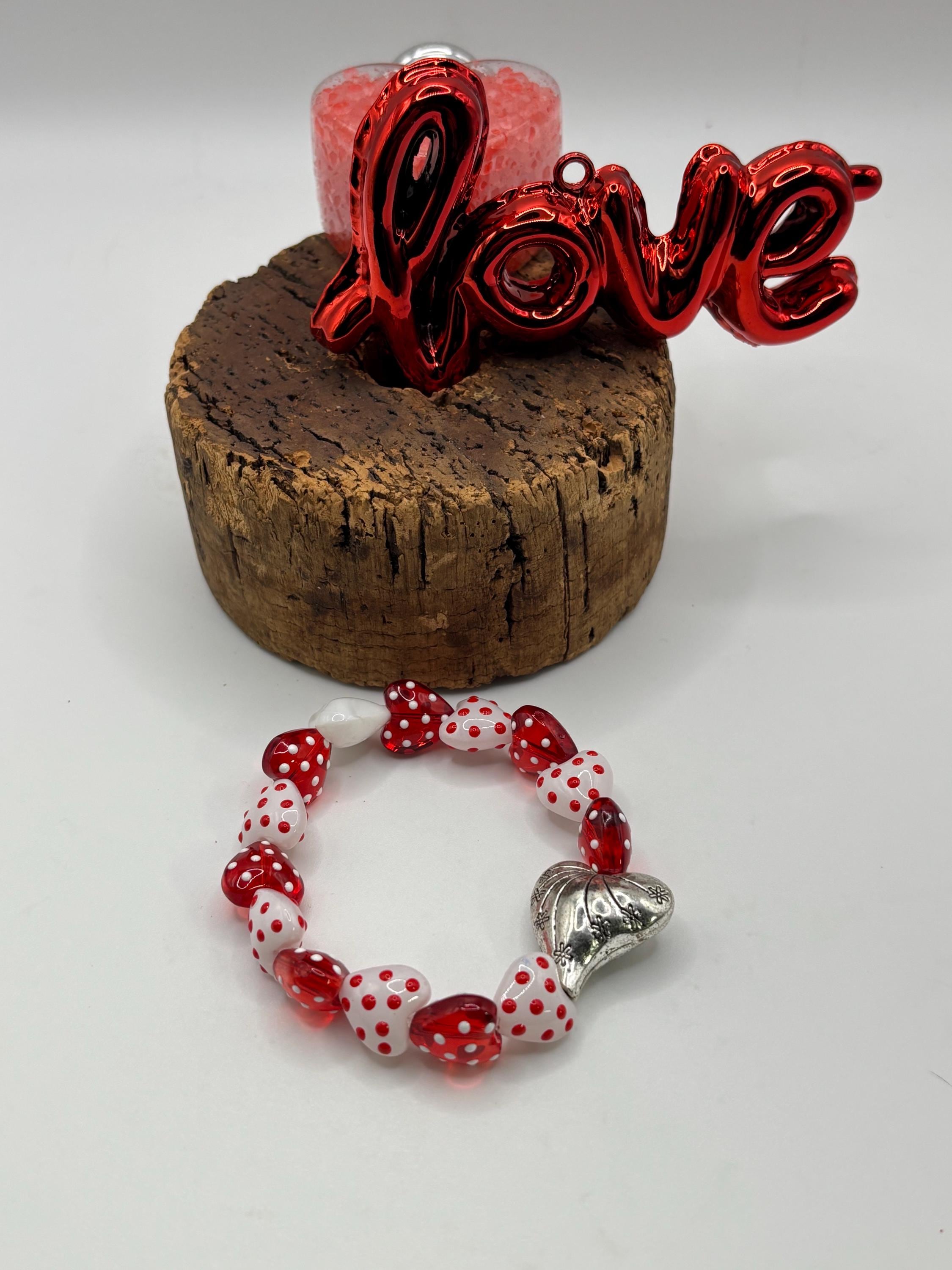 This is a lamp work glass bracelet , single strand stretch bracelet. Its giving Valentine vibes and is full of heart!