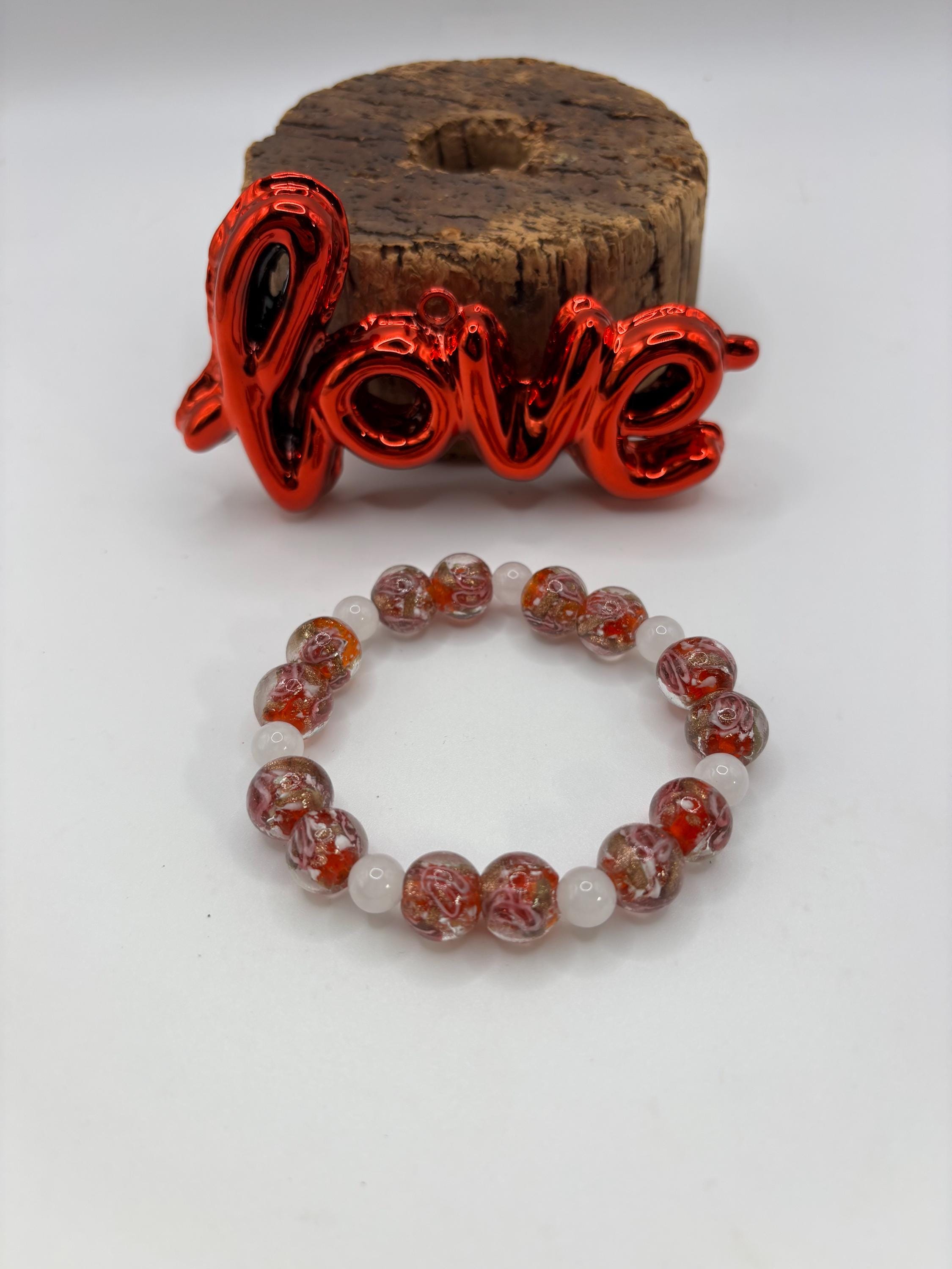 This is a lamp work glass bracelet , single strand stretch bracelet. Its giving Valentine vibes and is full of heart!