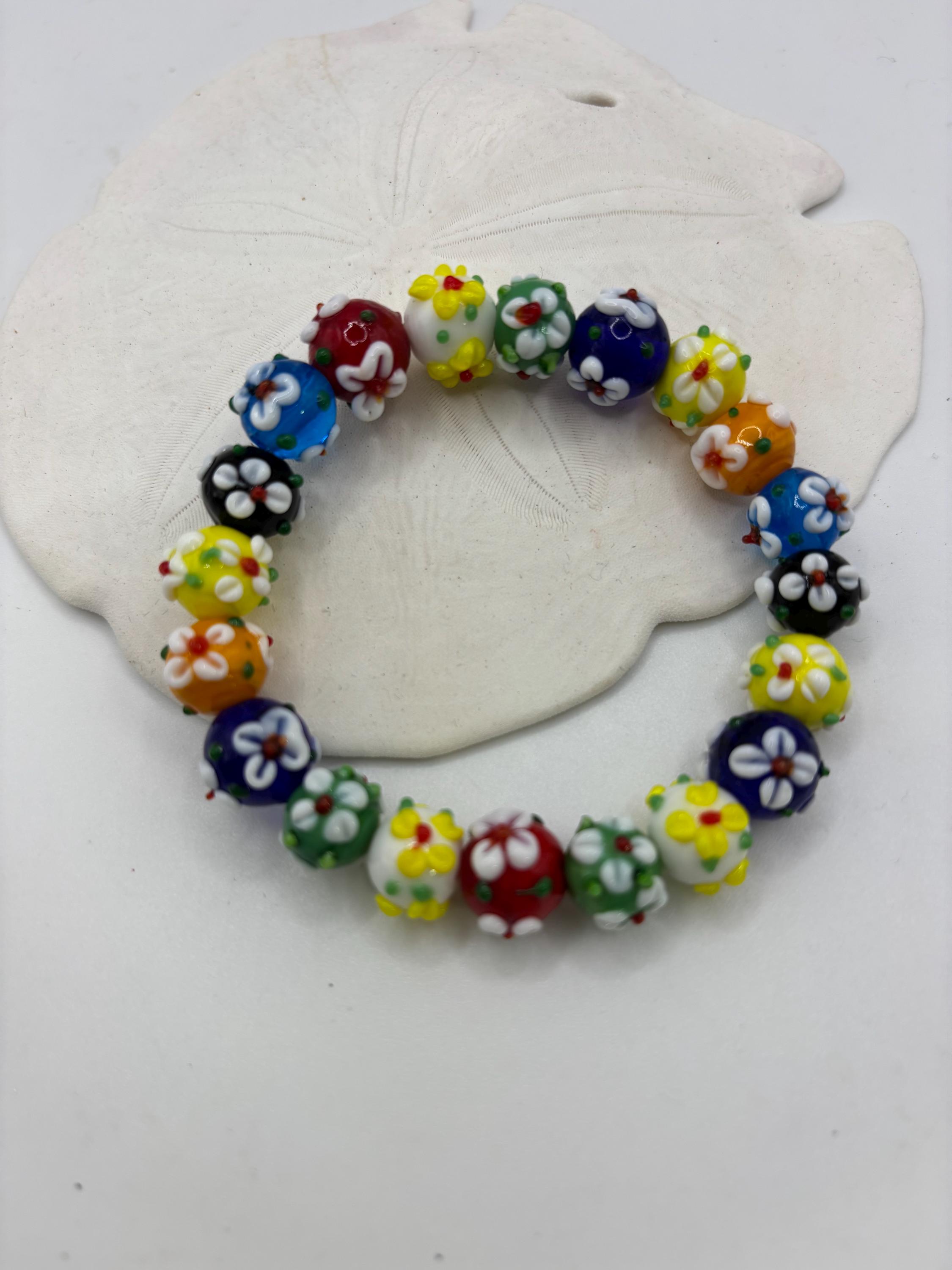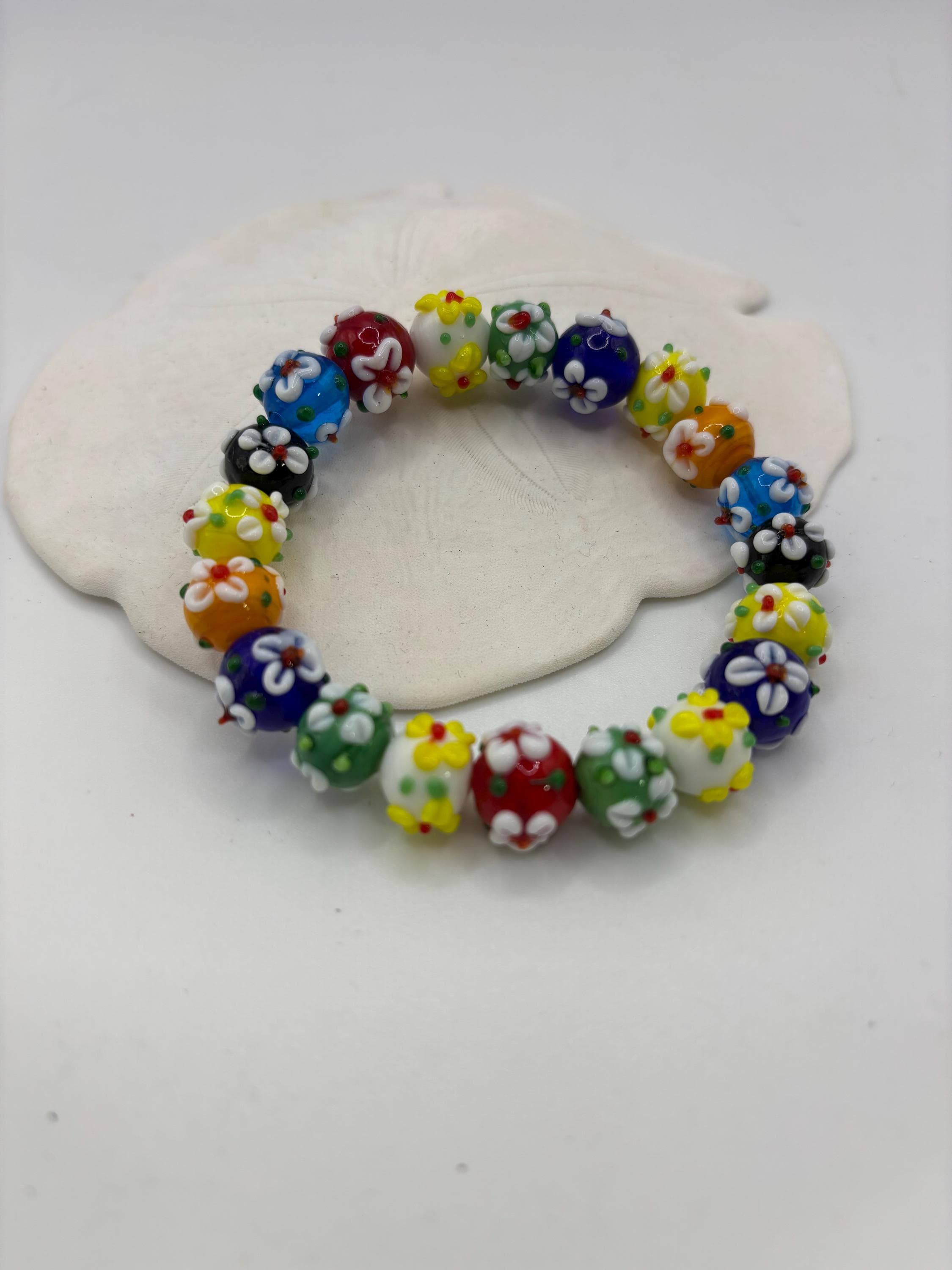 This is a lamp work glass bracelet , single strand stretch bracelet. Its giving springtime vibes and is full of glass lampwork flowers.