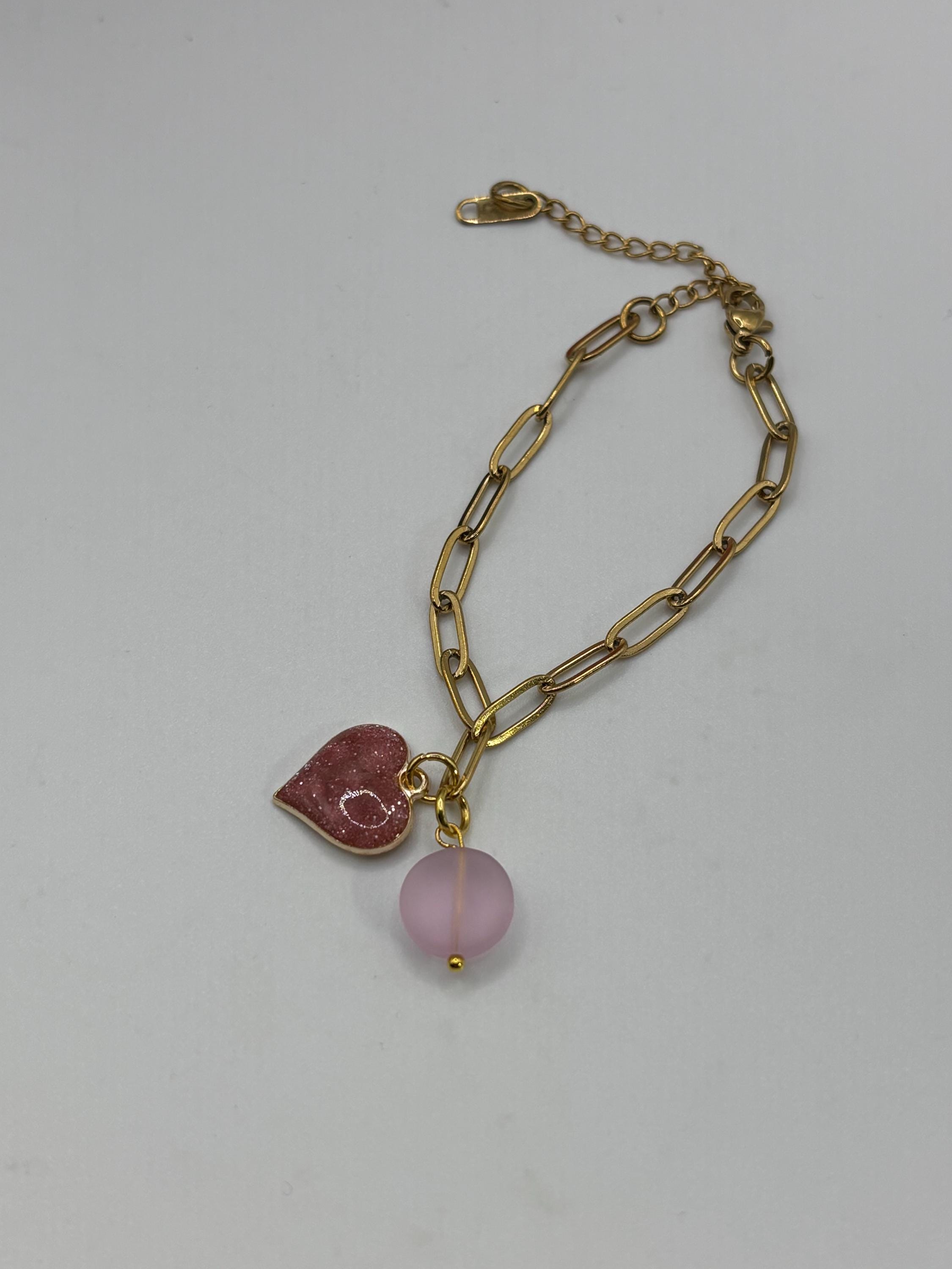 This is a stainless steel gold colored bracelet , single stran. Its giving Valentine vibes and is full of heart! It has a charm and a seaglass drop.