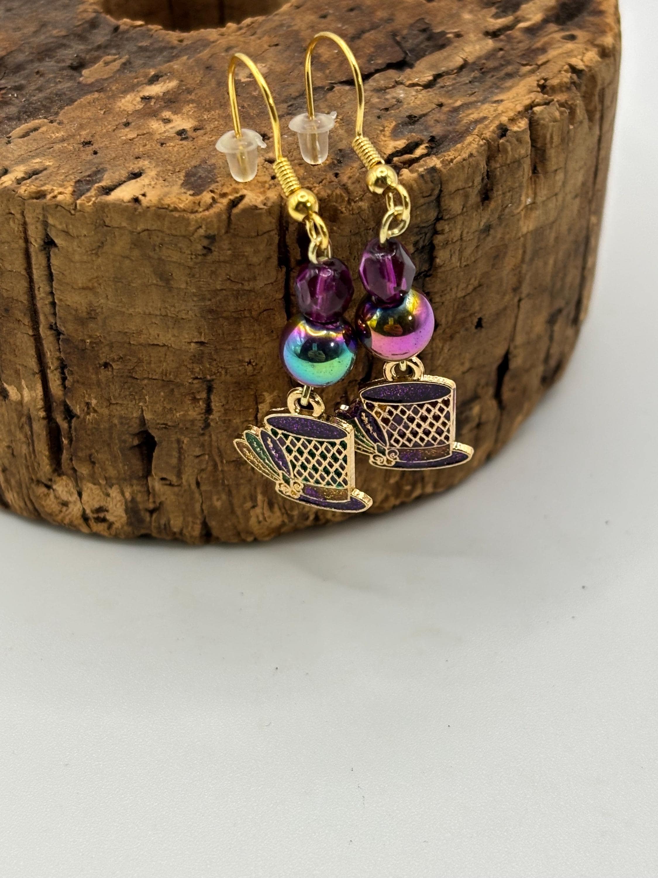 These festive Mardi Gras earrings feature a Hat with feather charm and bead accents.