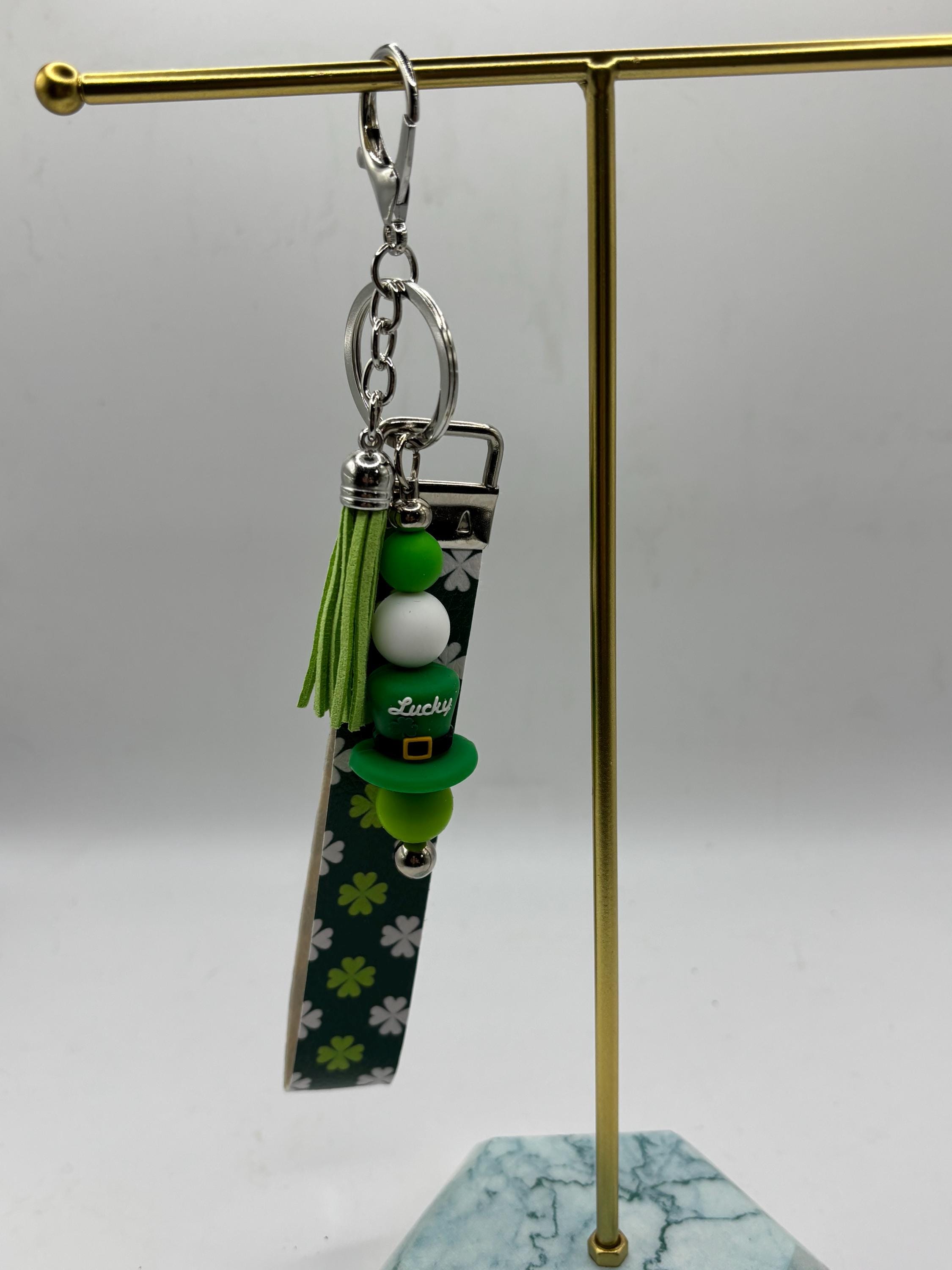 These pretty keychains are a great gift for yourself or someone else ! Made with faux leather, this one is Irish Fun on a wristlet. Perfect for St Patrick’s day or all year long. I’m loving this clover pattern!