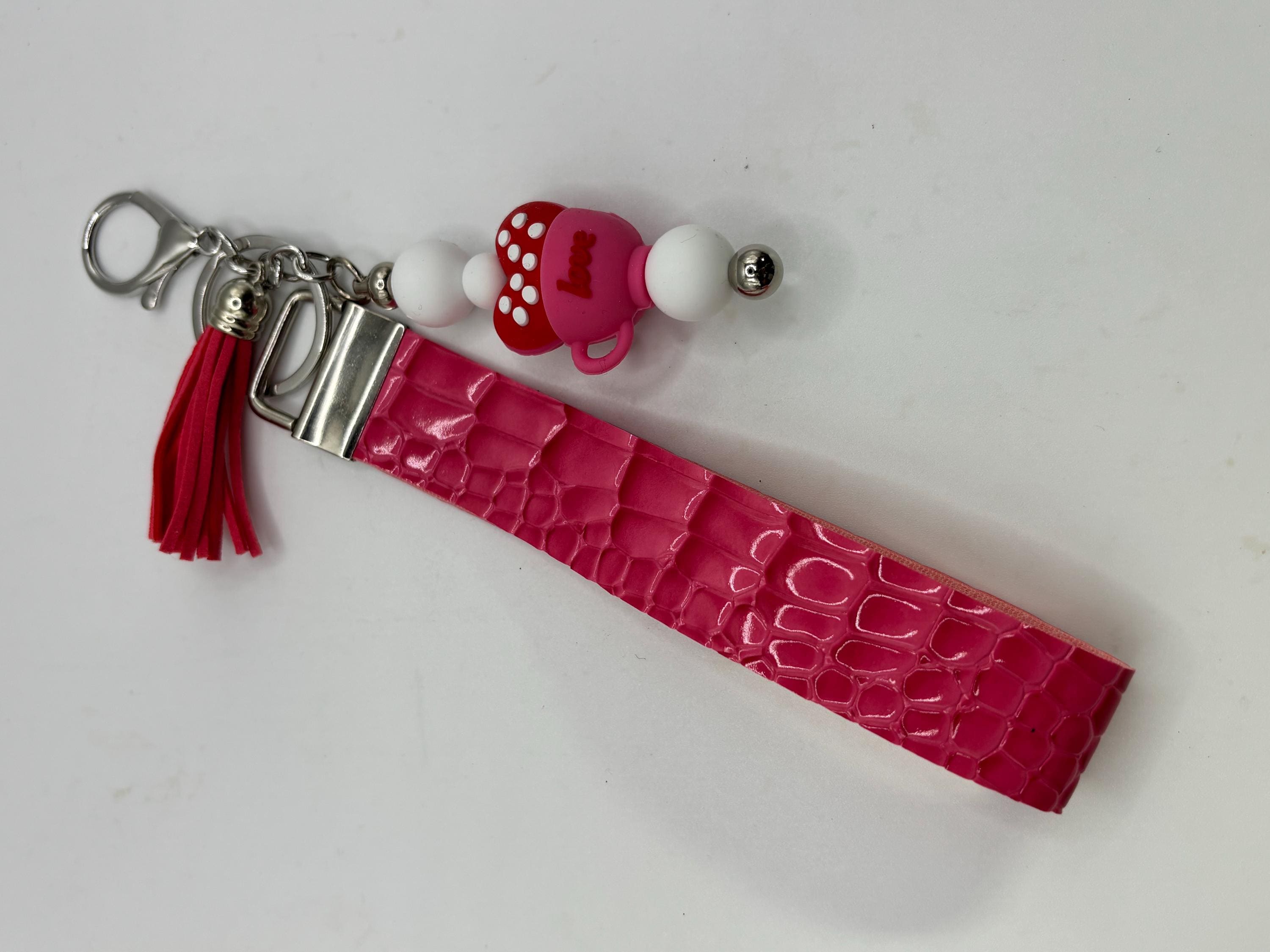 These pretty keychains are a great gift for yourself or someone else ! Made with faux alligator leather, this one is Love in silicone on a wristlet. Perfect for Valentines or Galentines day or all year long. I’m loving this alligator pattern!