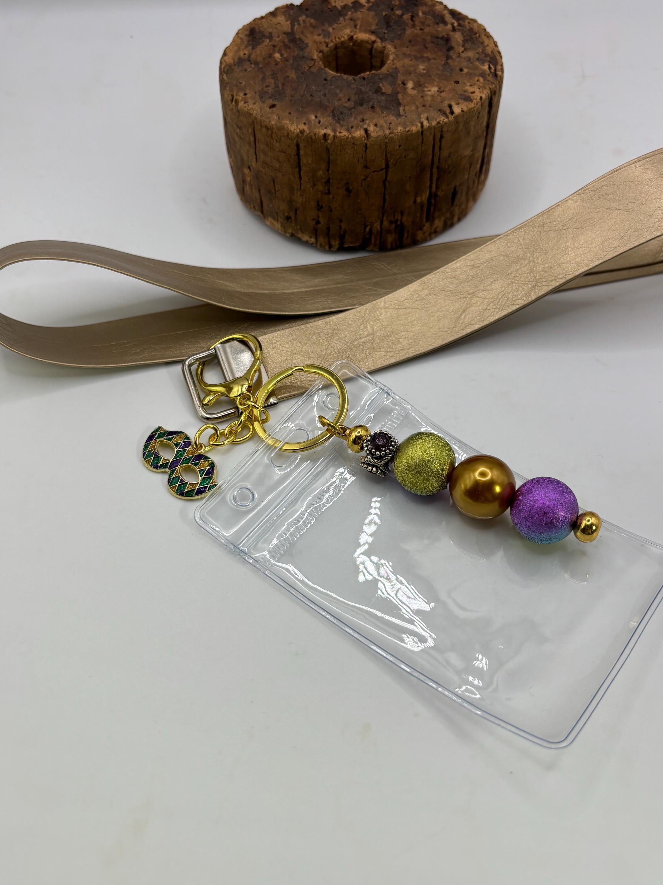 These pretty Lanyards are a great gift for yourself or someone else ! Made with soft, gold colored faux/vegan leather, this one a Mardi Gras theme on a 36 inch lanyard . Perfect for cruisers or anyone who wants a lanyard with a touch of bling.