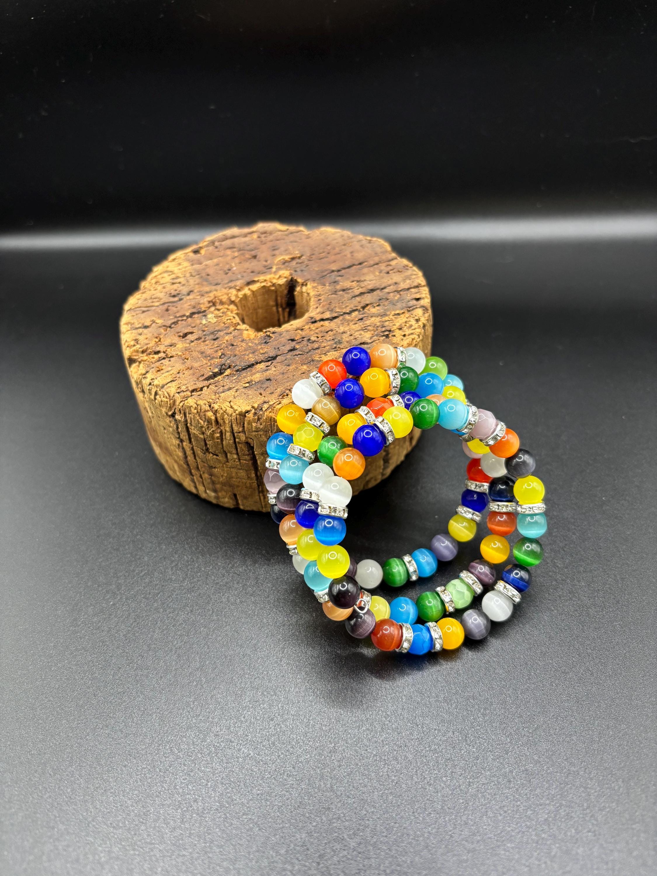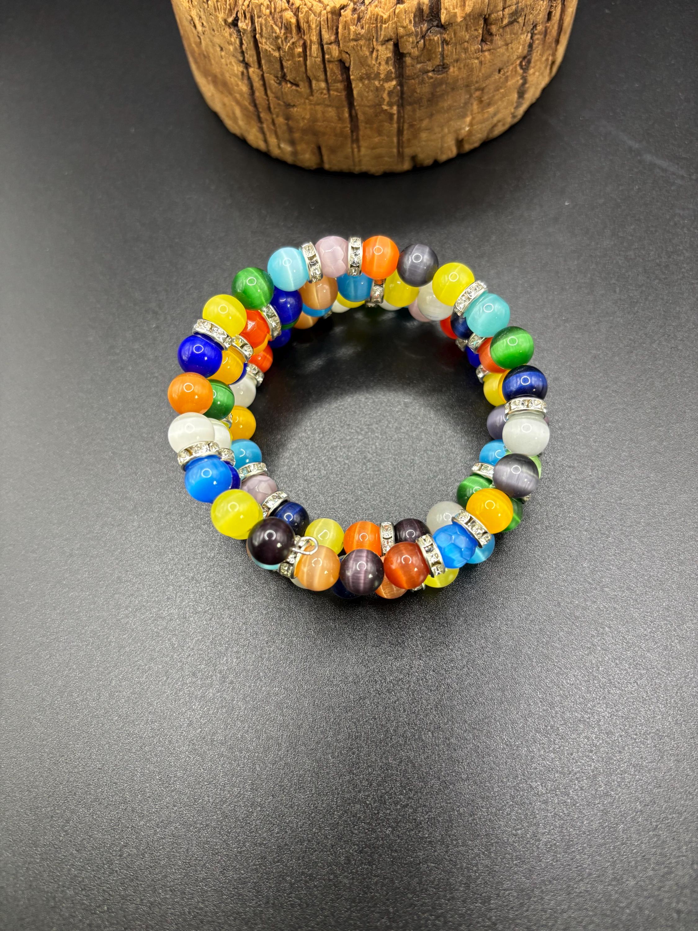 Add a touch of sophistication to your style with our elegant memory wire multistrand bracelet, made with Cats eye gemstones and silver accent metal beads.