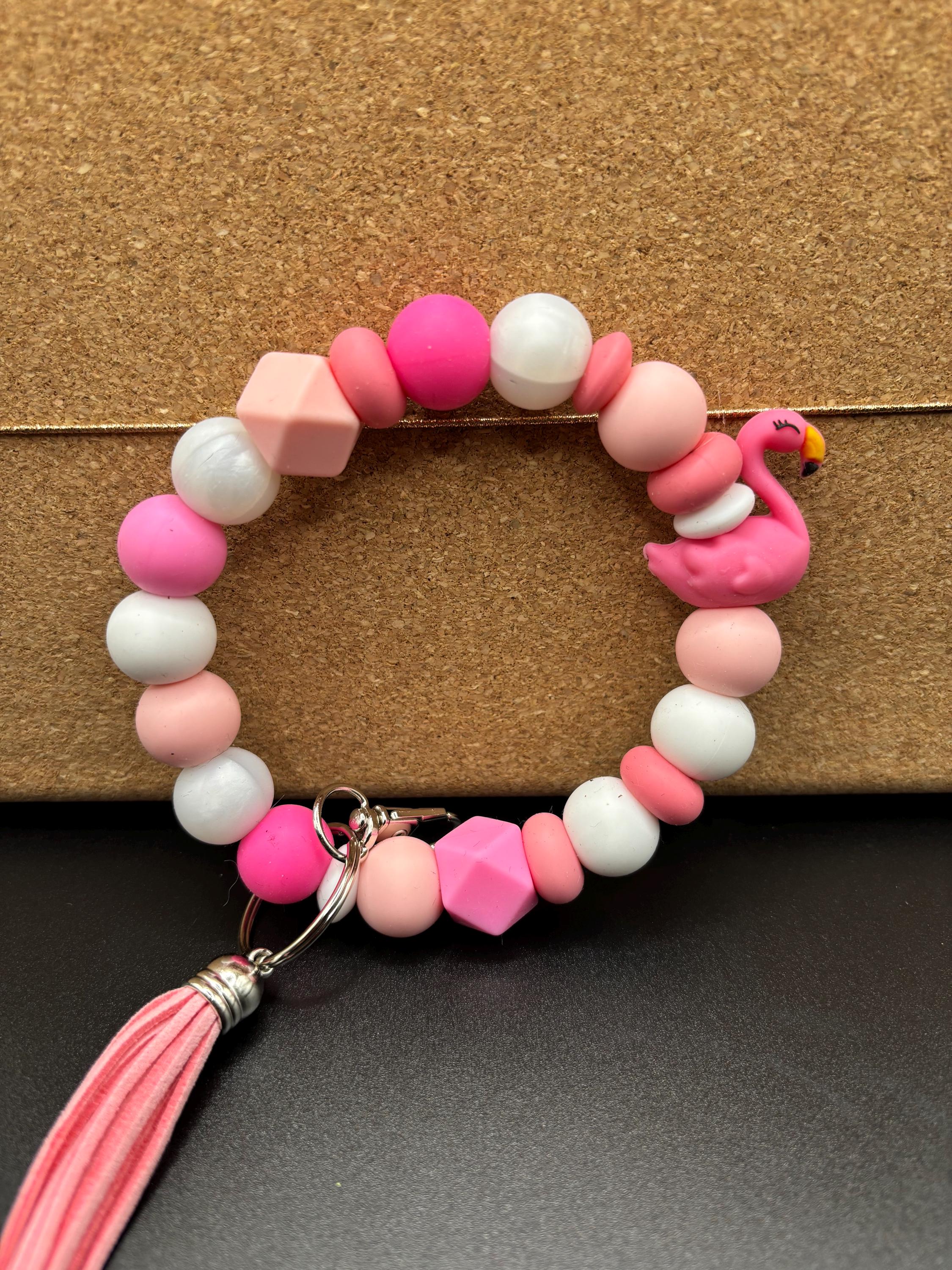 Pink Flamingo Beaded Wristlet Keychain | Keychain with Silicone and tassel | Keychain | Key Fob | Wristlet