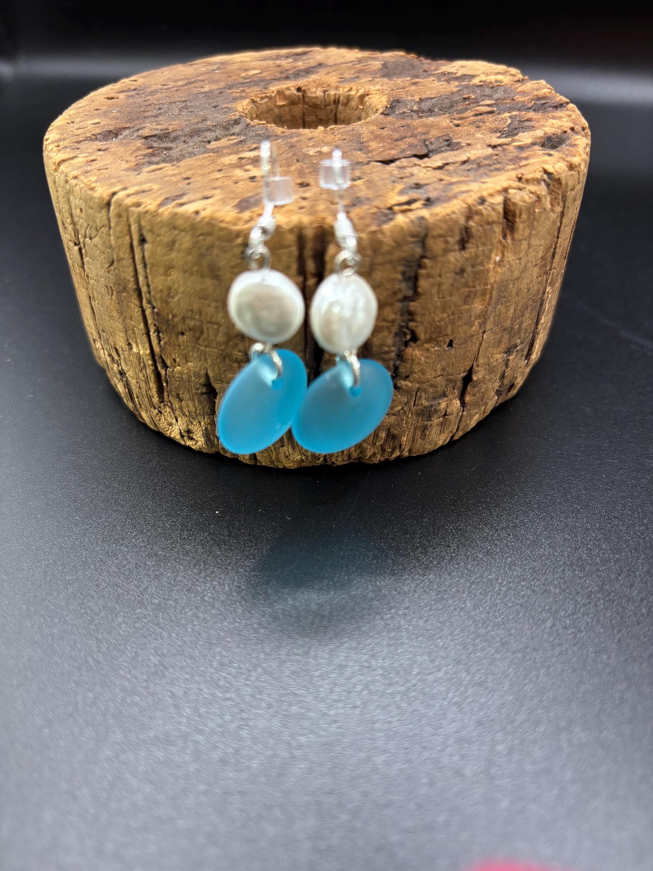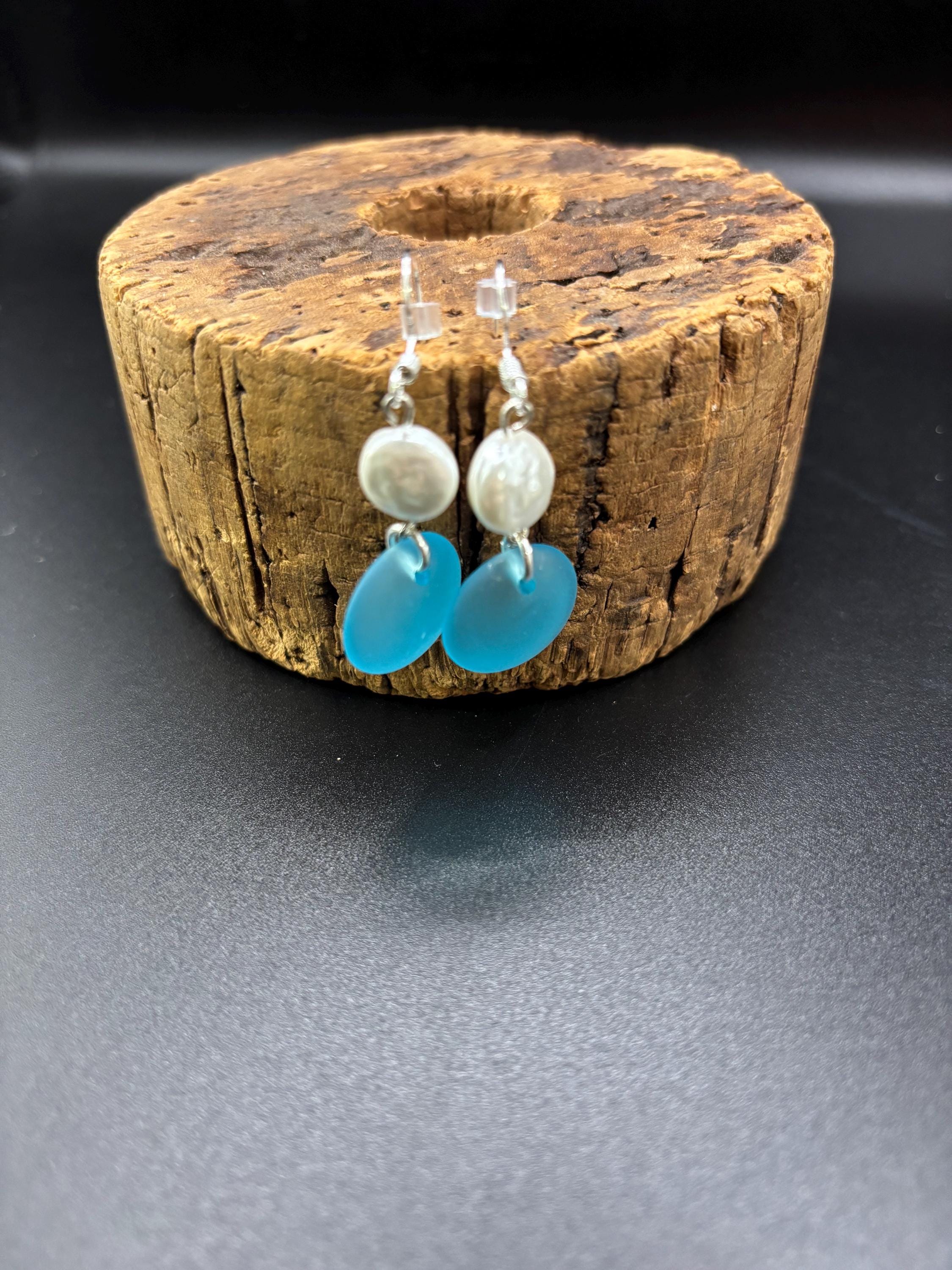 These pretty Seaglass earrings are made with turquoise blue Seaglass. They are on Sterling Silver ear wires and have a puffed coin pearl accent.