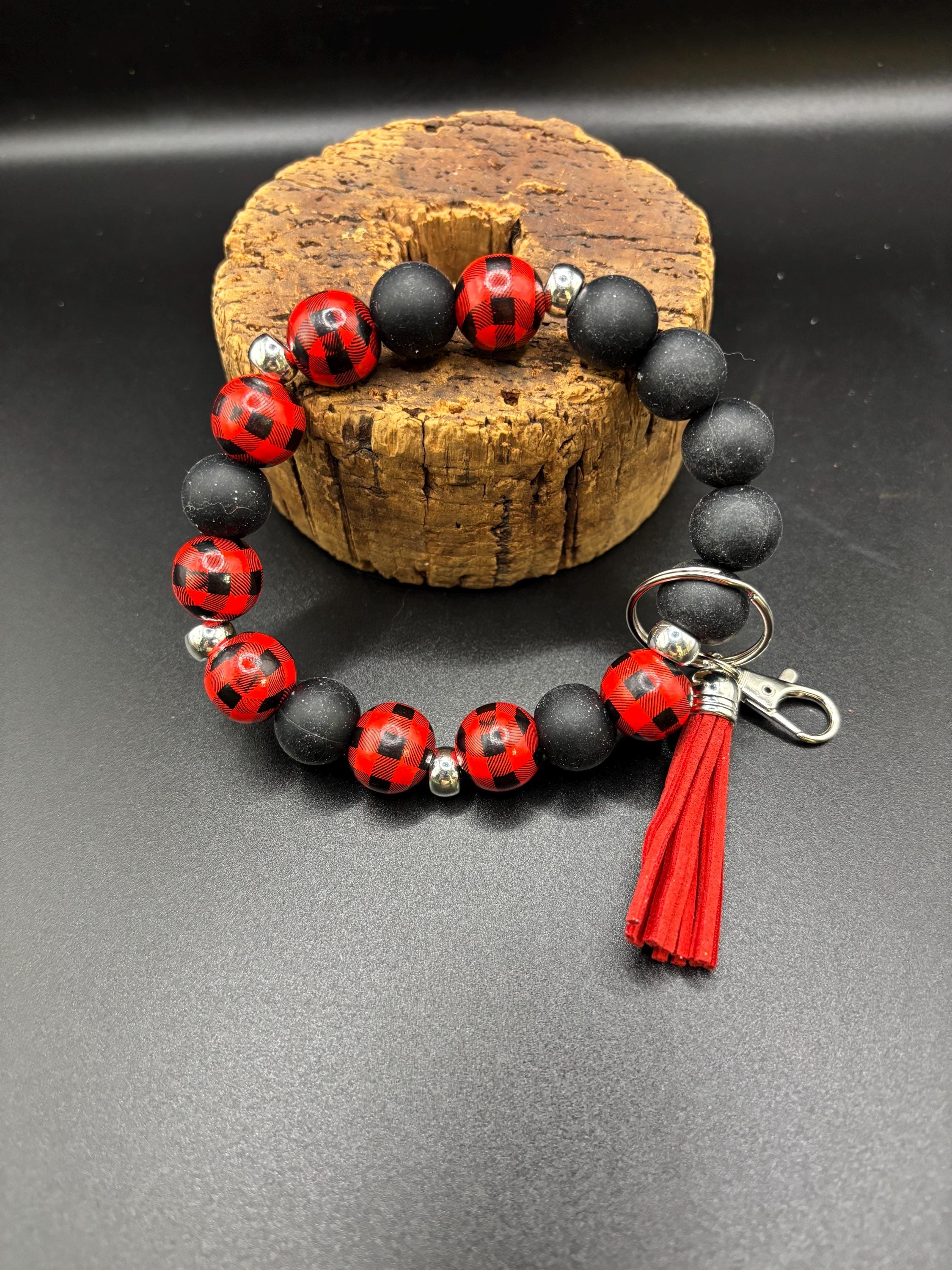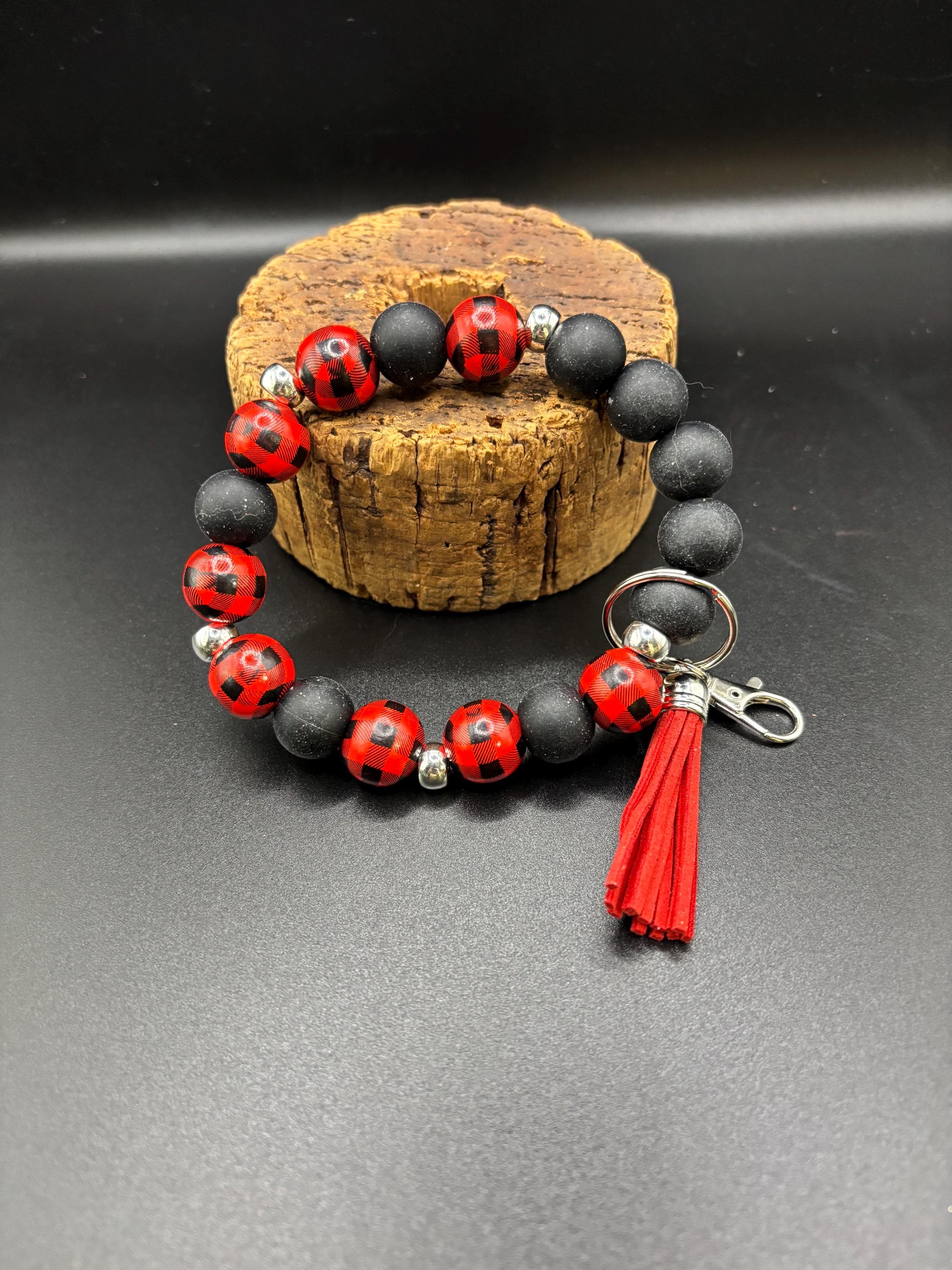 Red Buffalo Plaid Print Girly Beaded Wristlet Keychain | Keychain with Silicone and tassel | Keychain | Key Fob | Wristlet