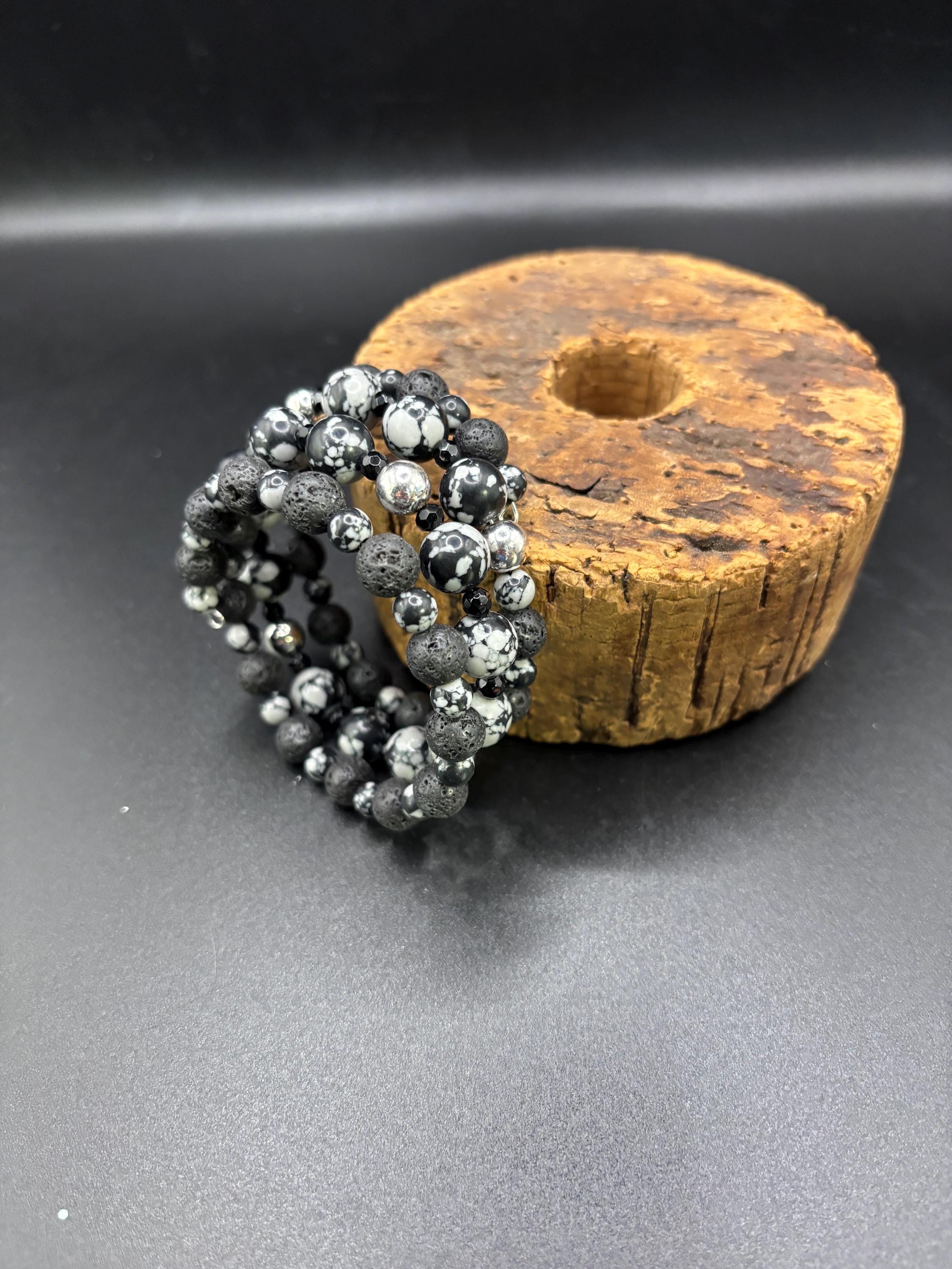 Add a touch of sophistication to your style with our elegant memory wire multistrand bracelet, made with Black Lava Rock Gemstones and snowflake Obsidian gemstones and silver accent metal beads.