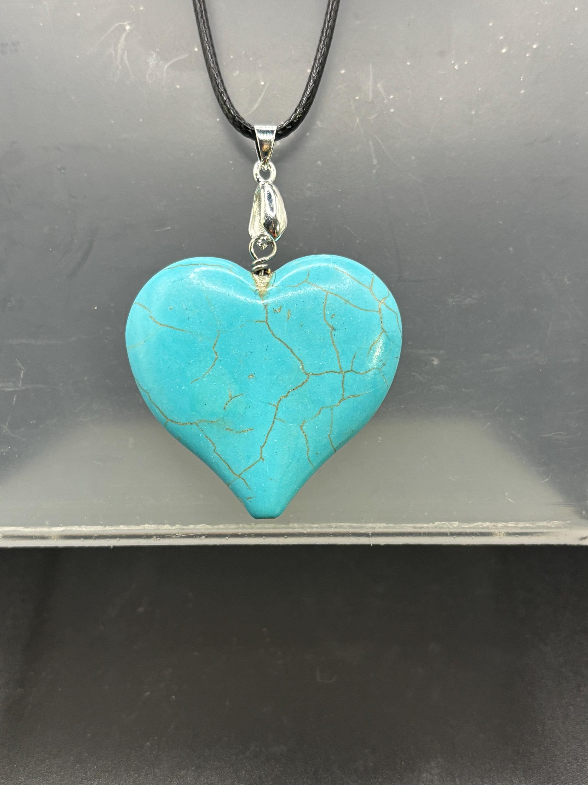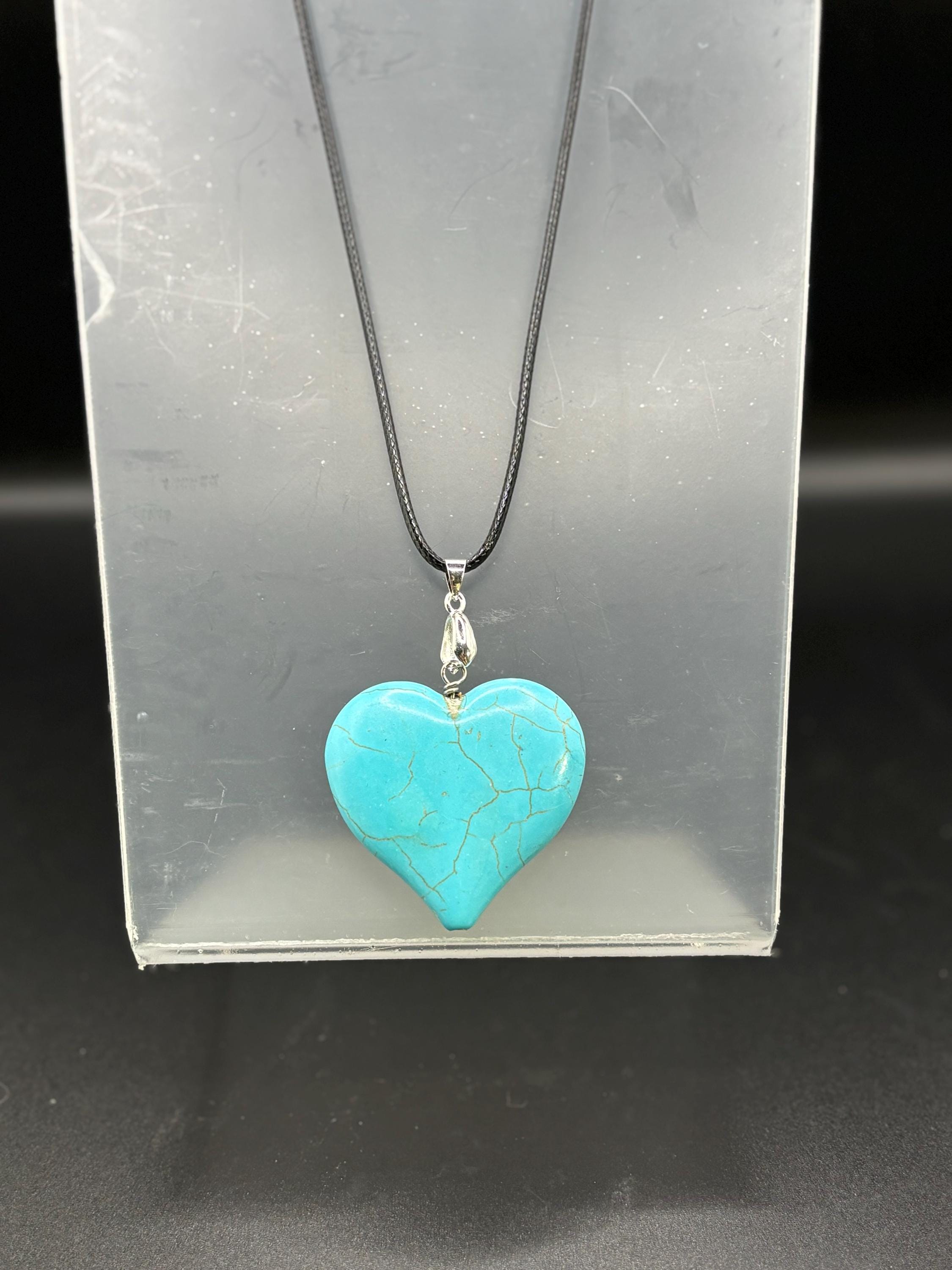 These are Turquoise heart pendants on a black cord.