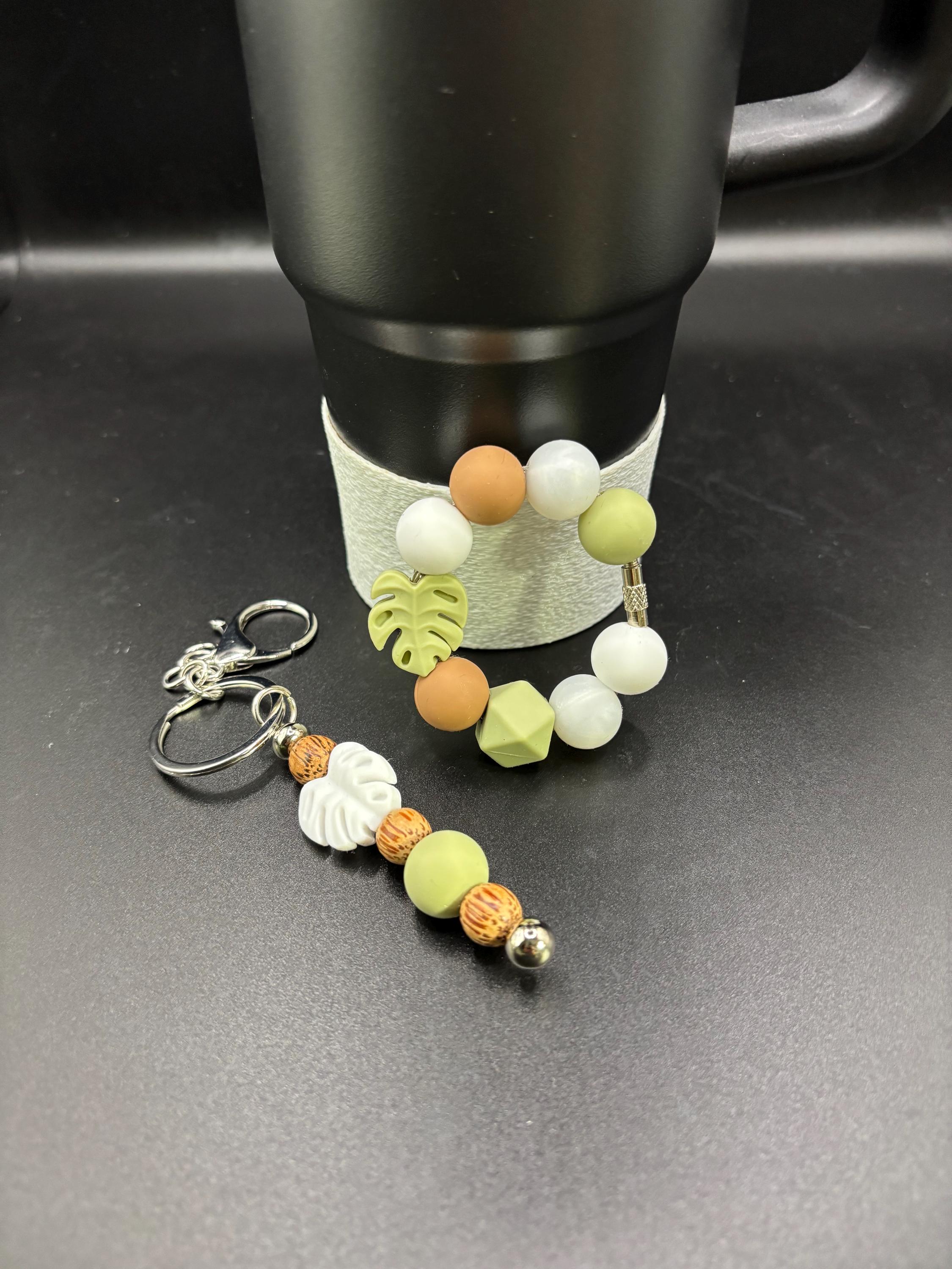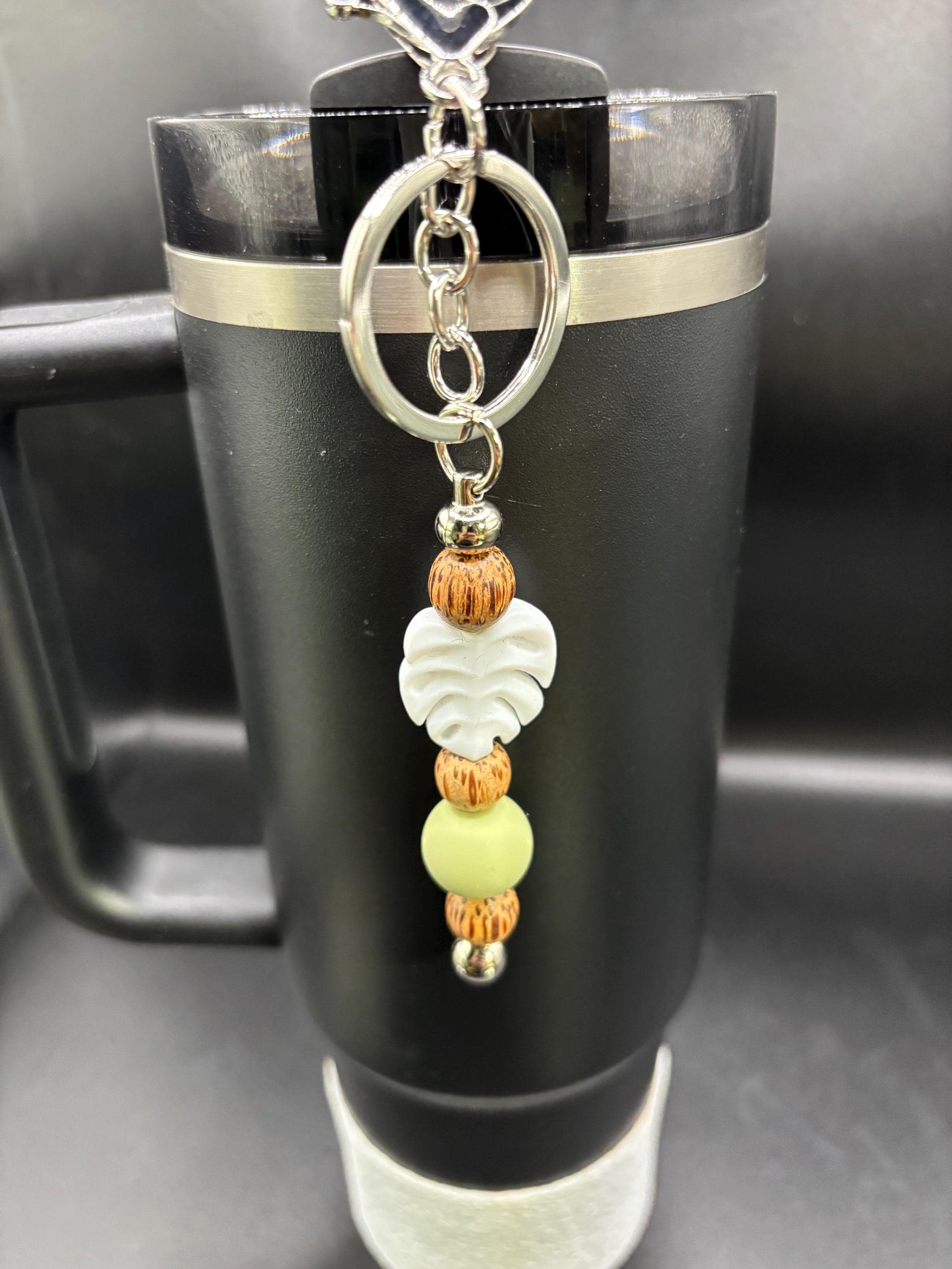 Sage and White Monstera Leaf Tropical Stanley Cup Bracelet: Cup Handle Bracelet | Straw Charm with Palm Wood Beads | Vacation |