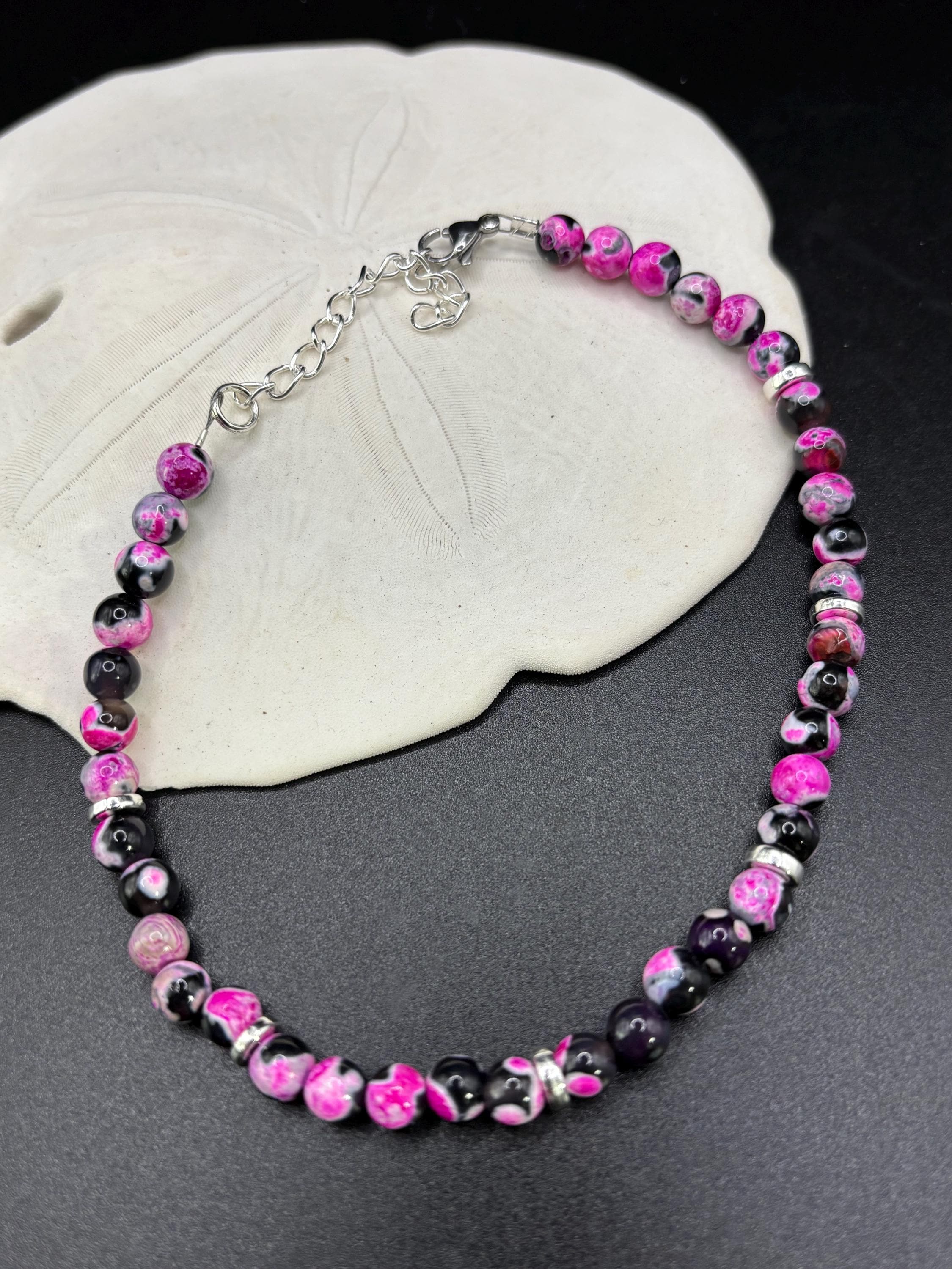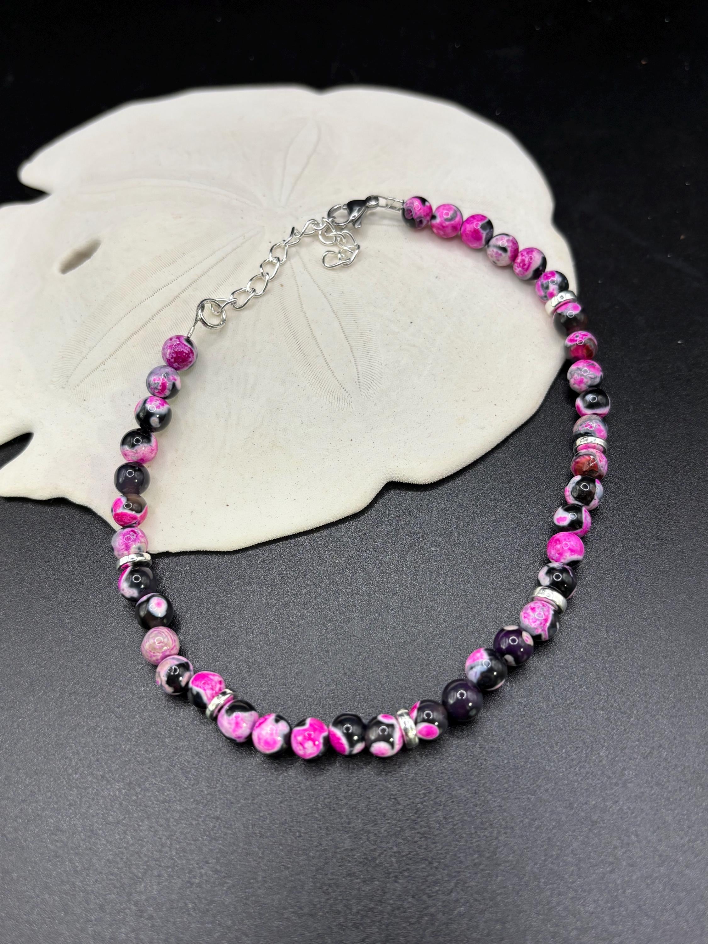 This pretty ankle bracelet is made with round pink and black Agate gemstones and paired with small silver accent beads.