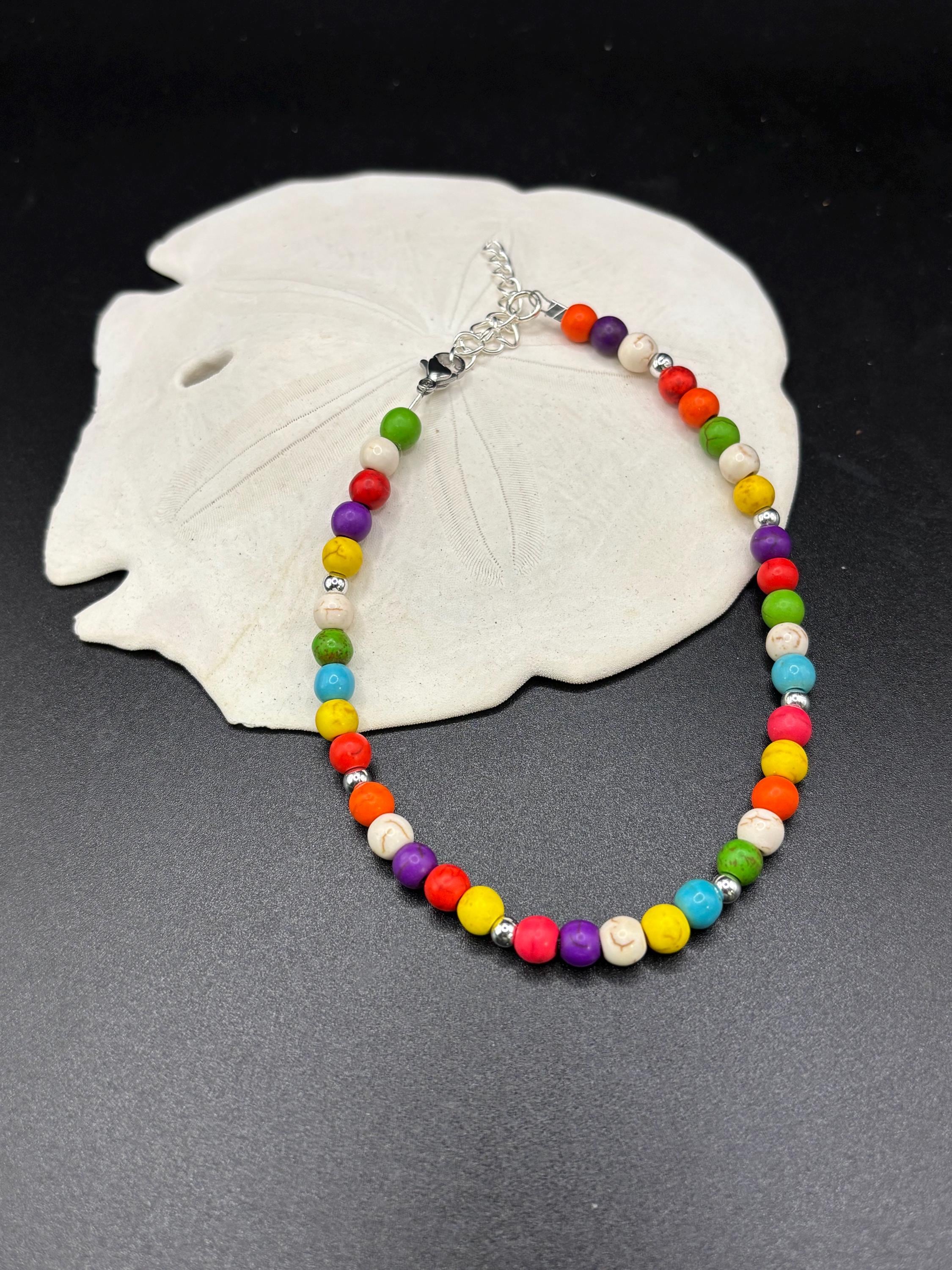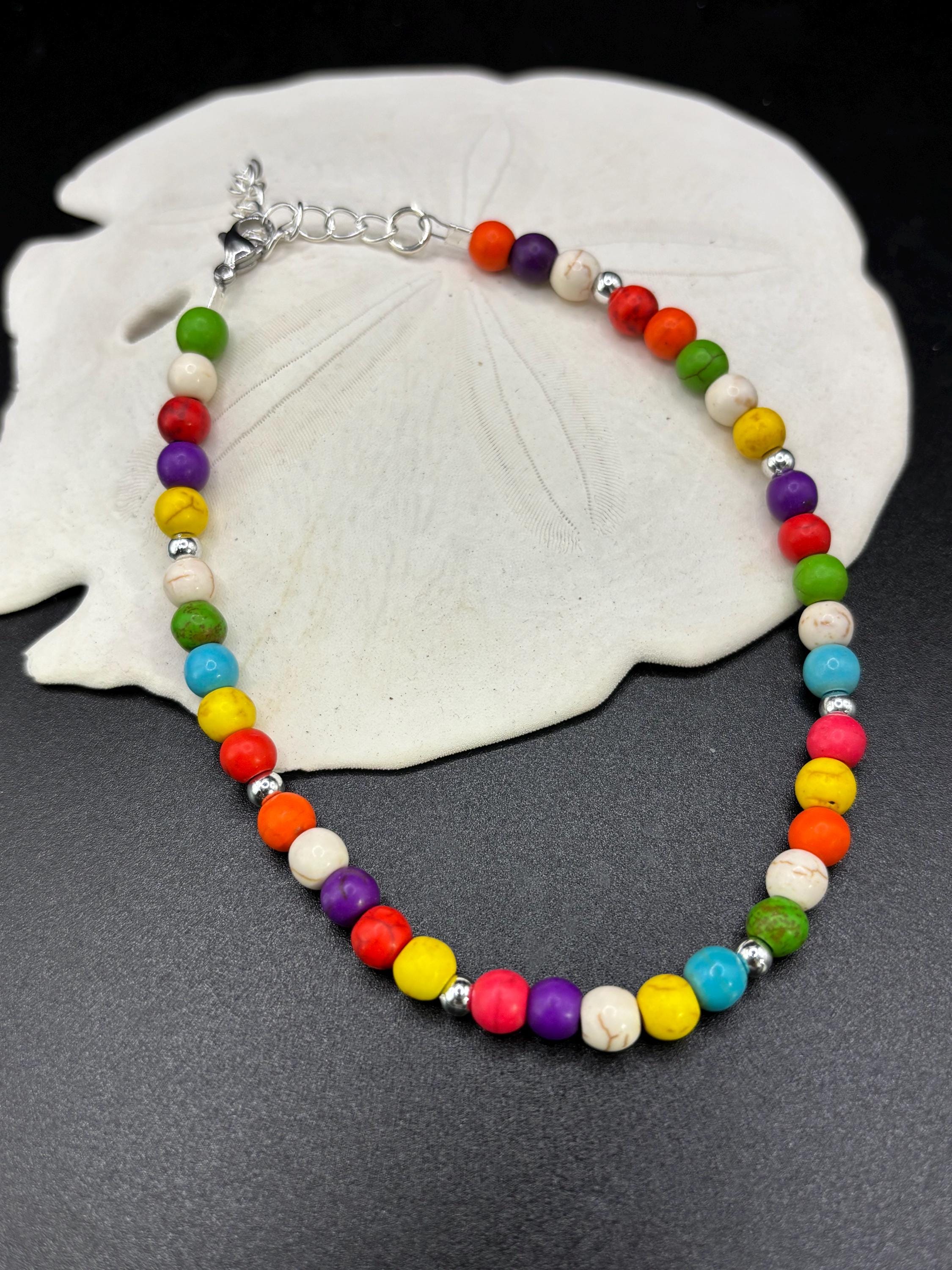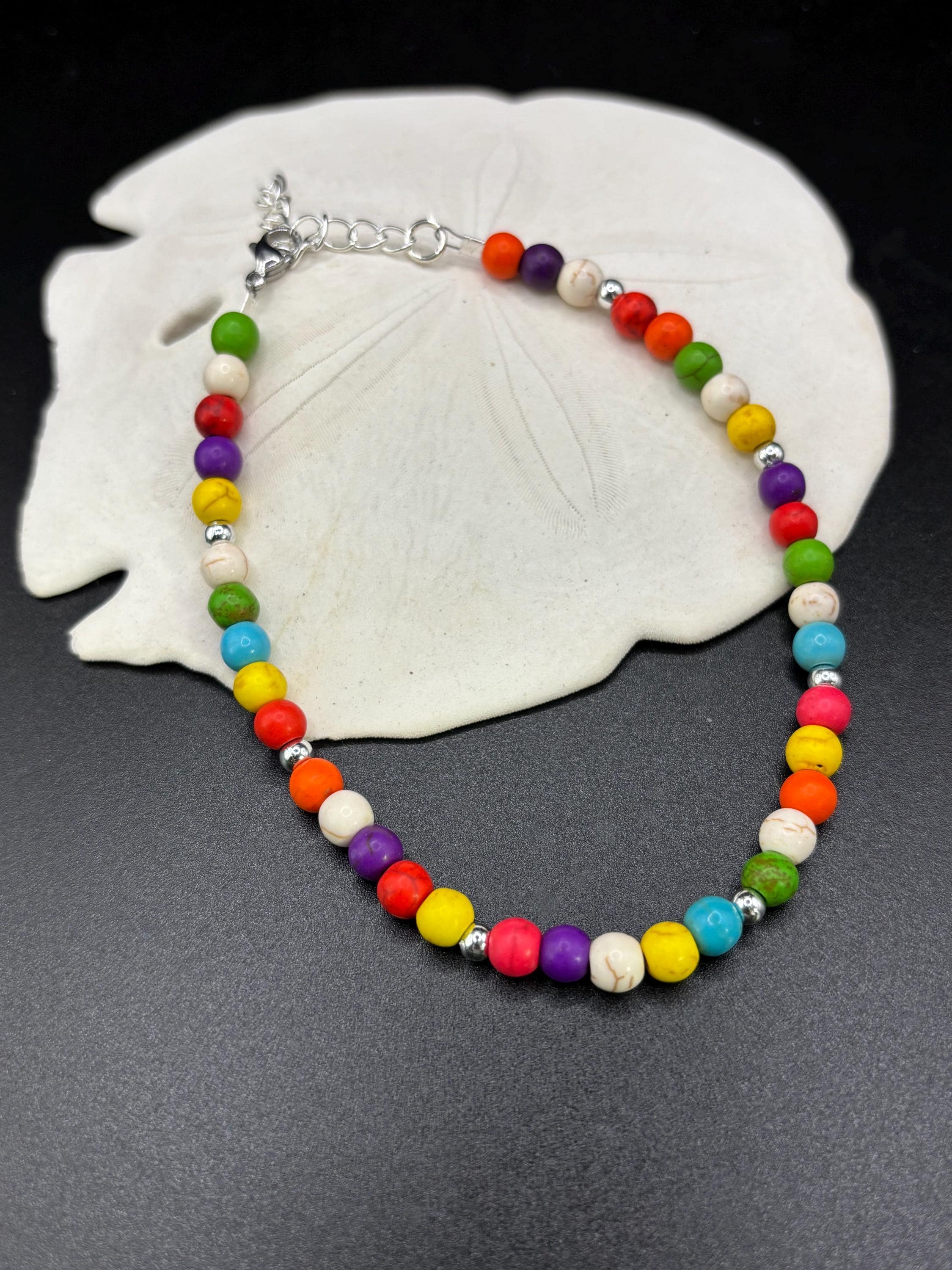 This pretty ankle bracelet is made with round turquoise Howlite gemstones and paired with small silver accent beads.