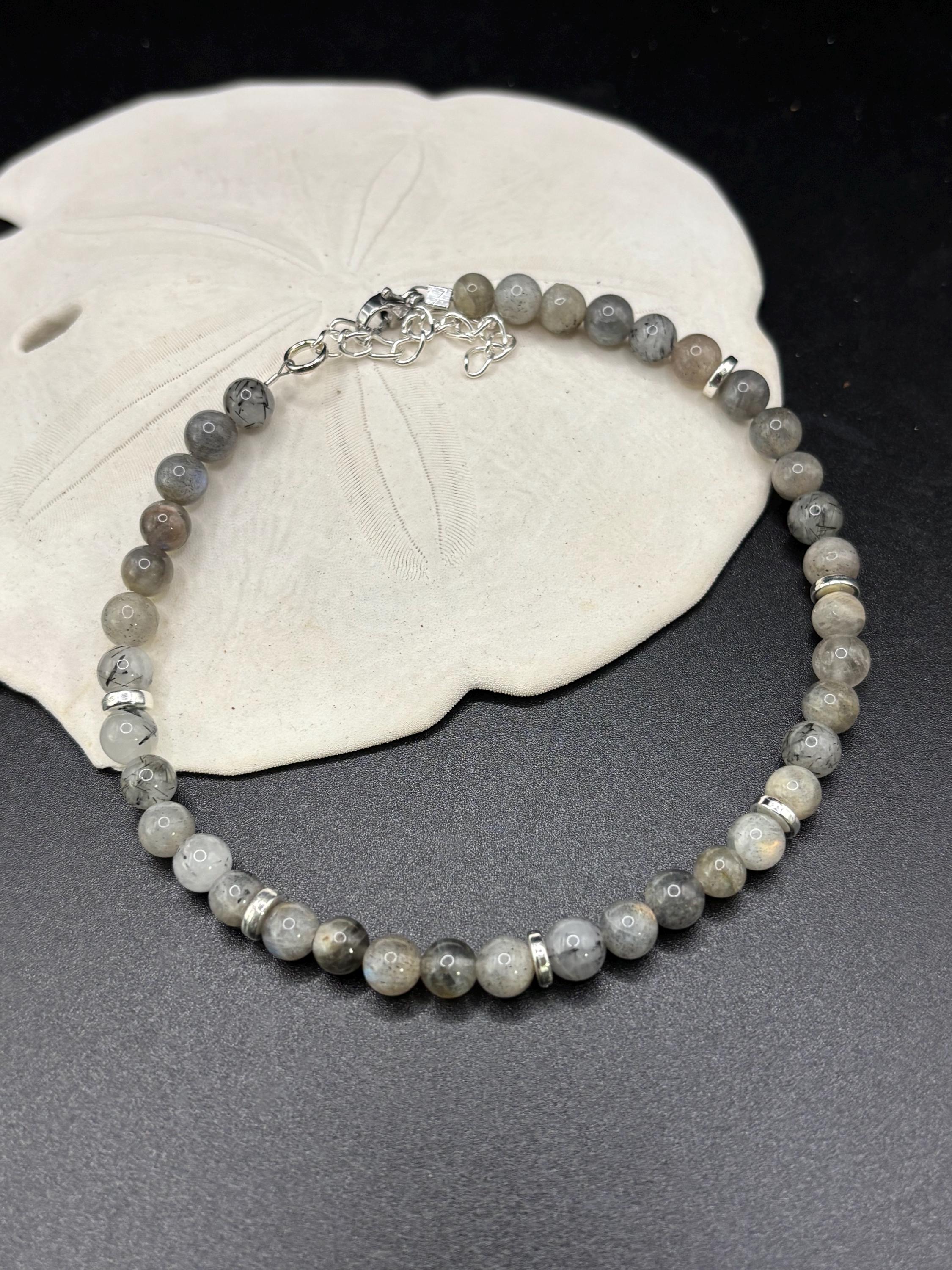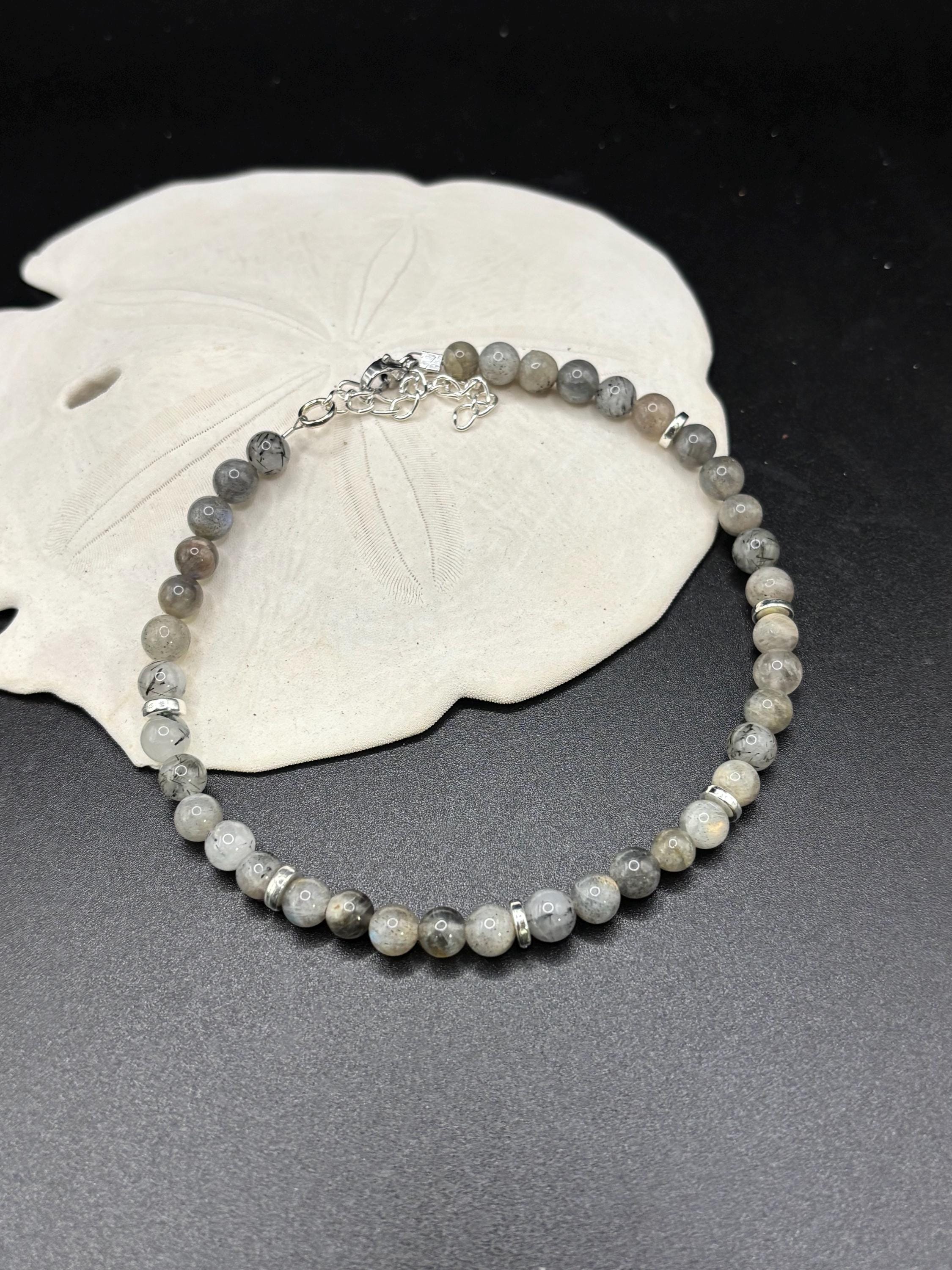 This pretty ankle bracelet is made with round Labradorite gemstones and paired with small silver accent beads.