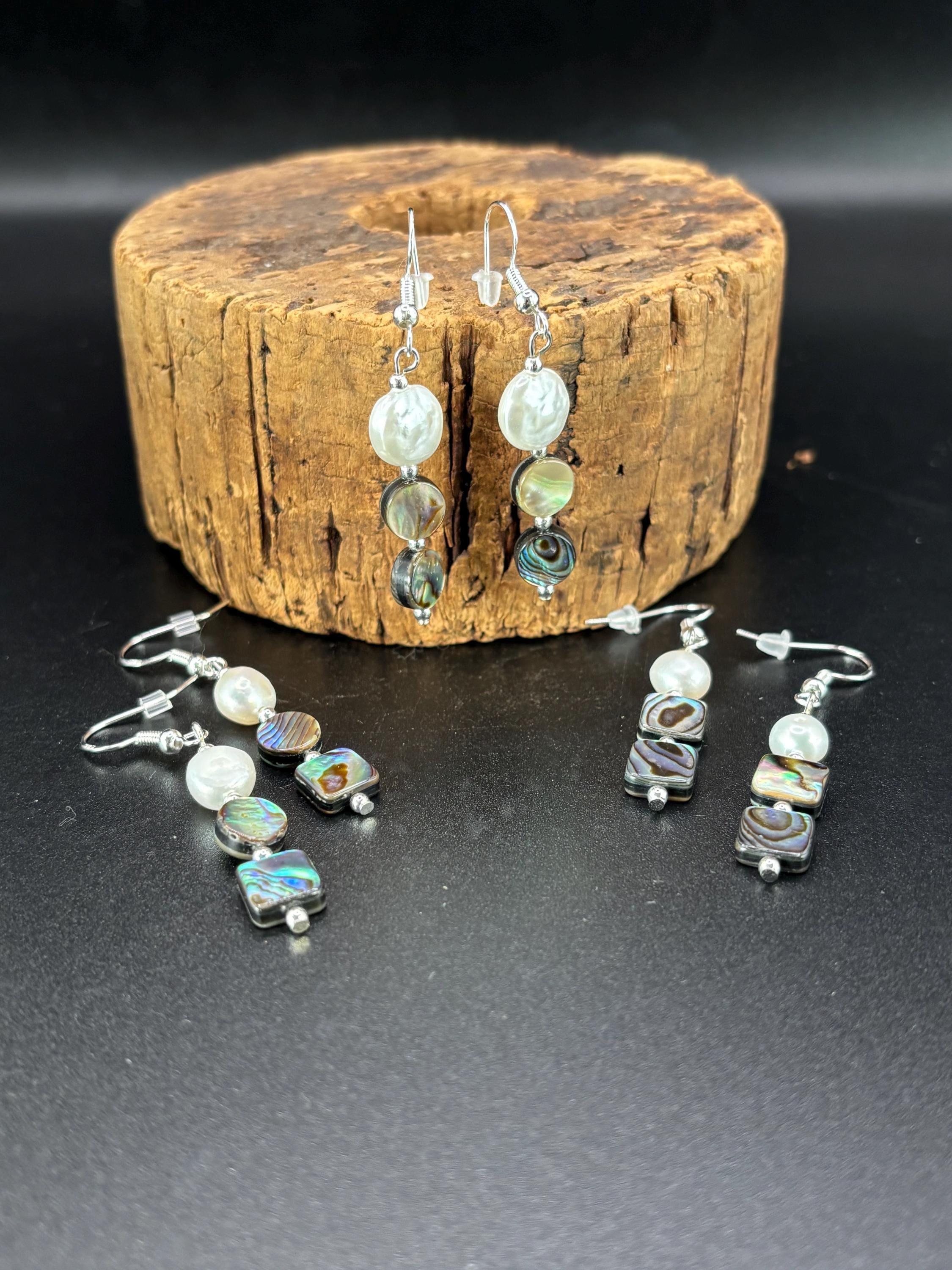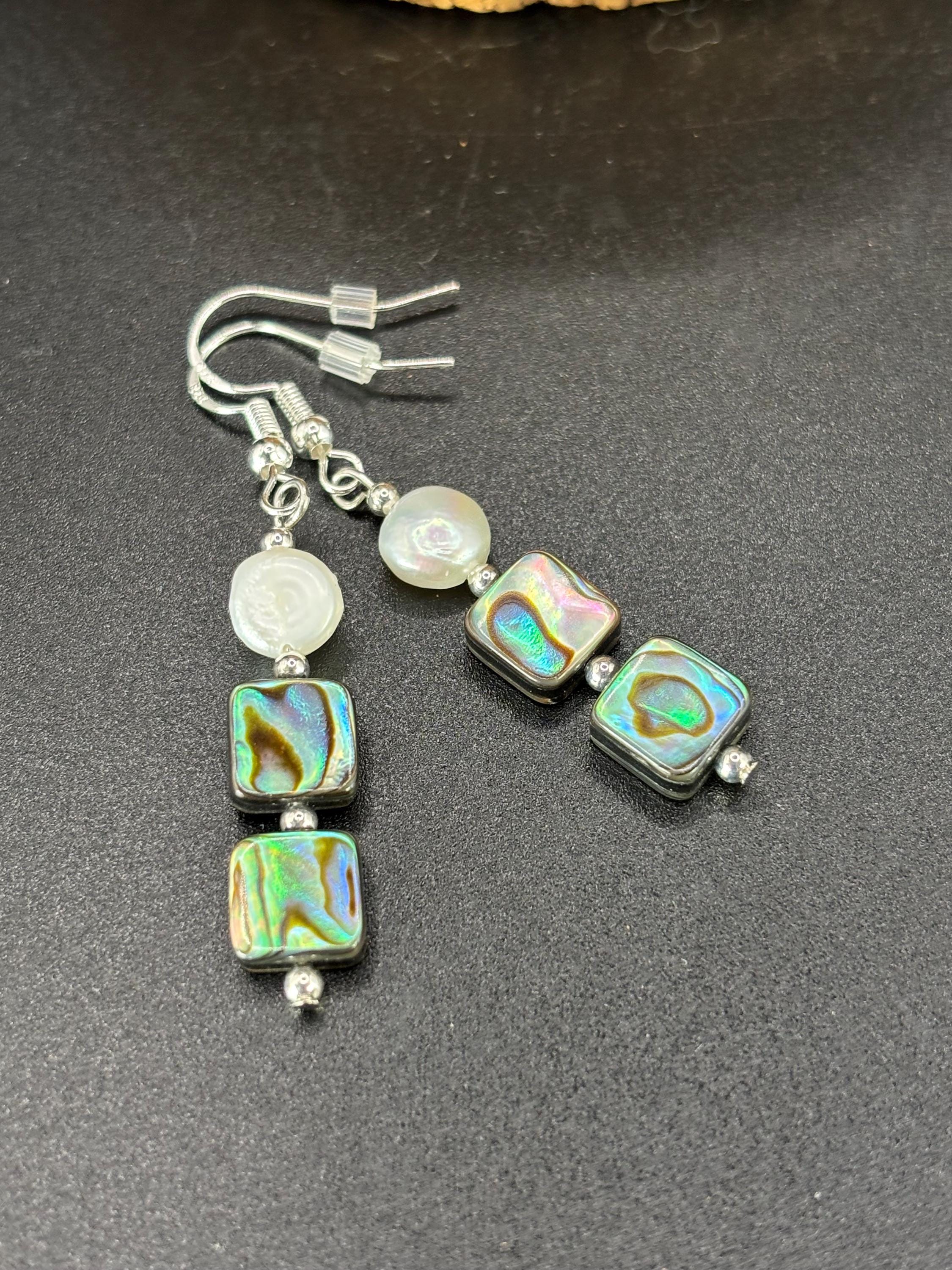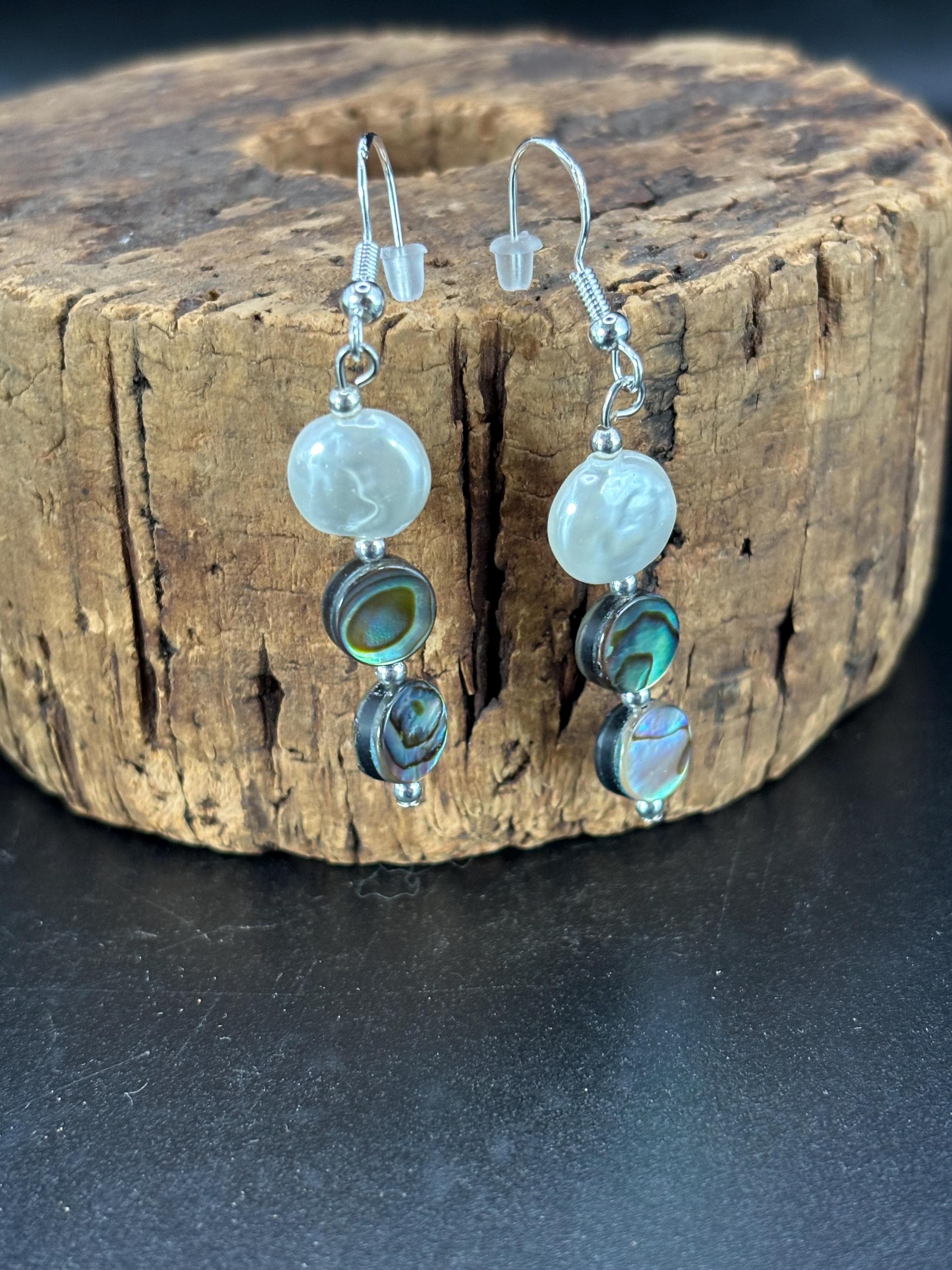 These earrings are made with Abalone and fresh water pearls. There are 3 variations available. They are on silver ear wires.