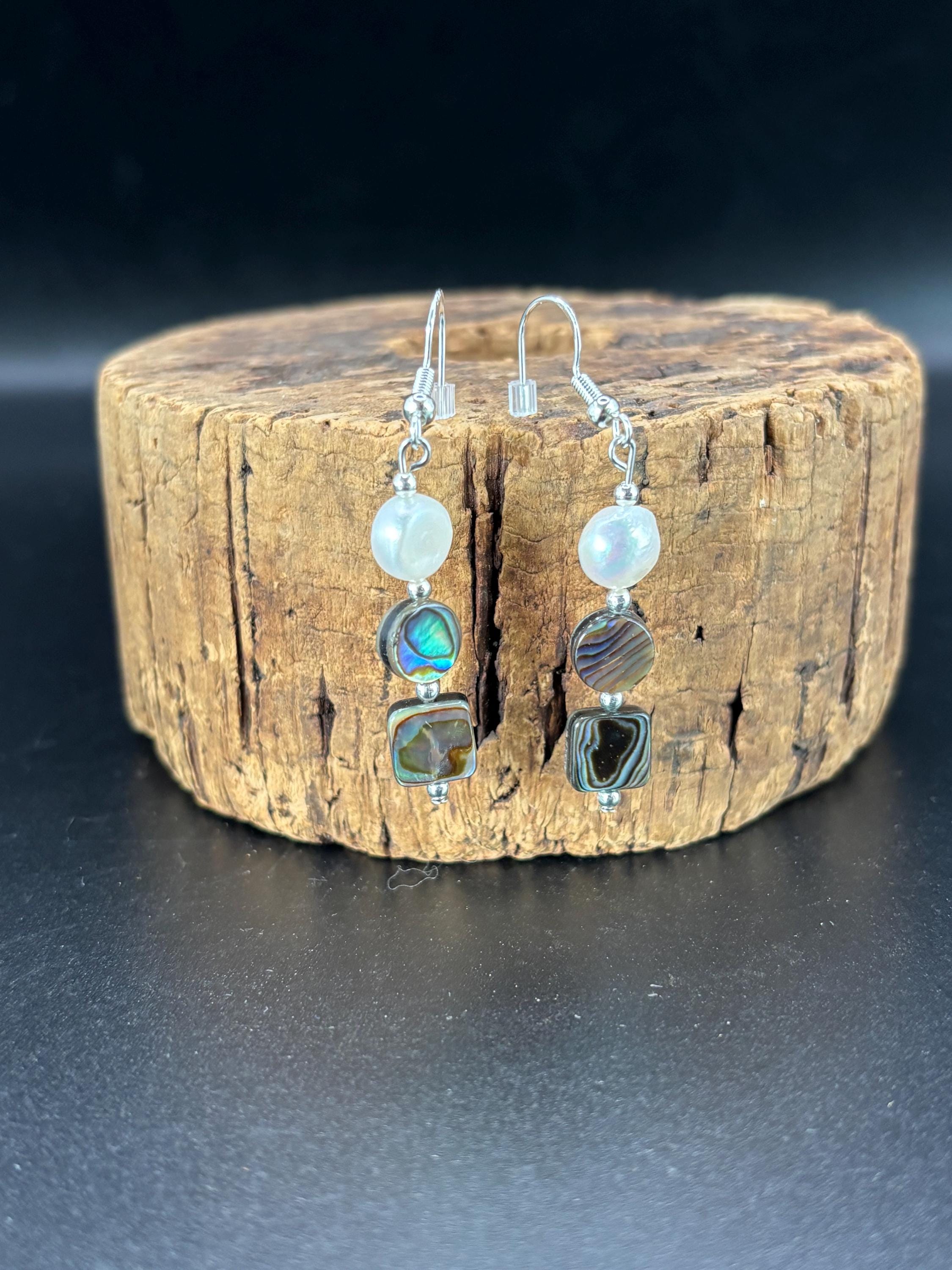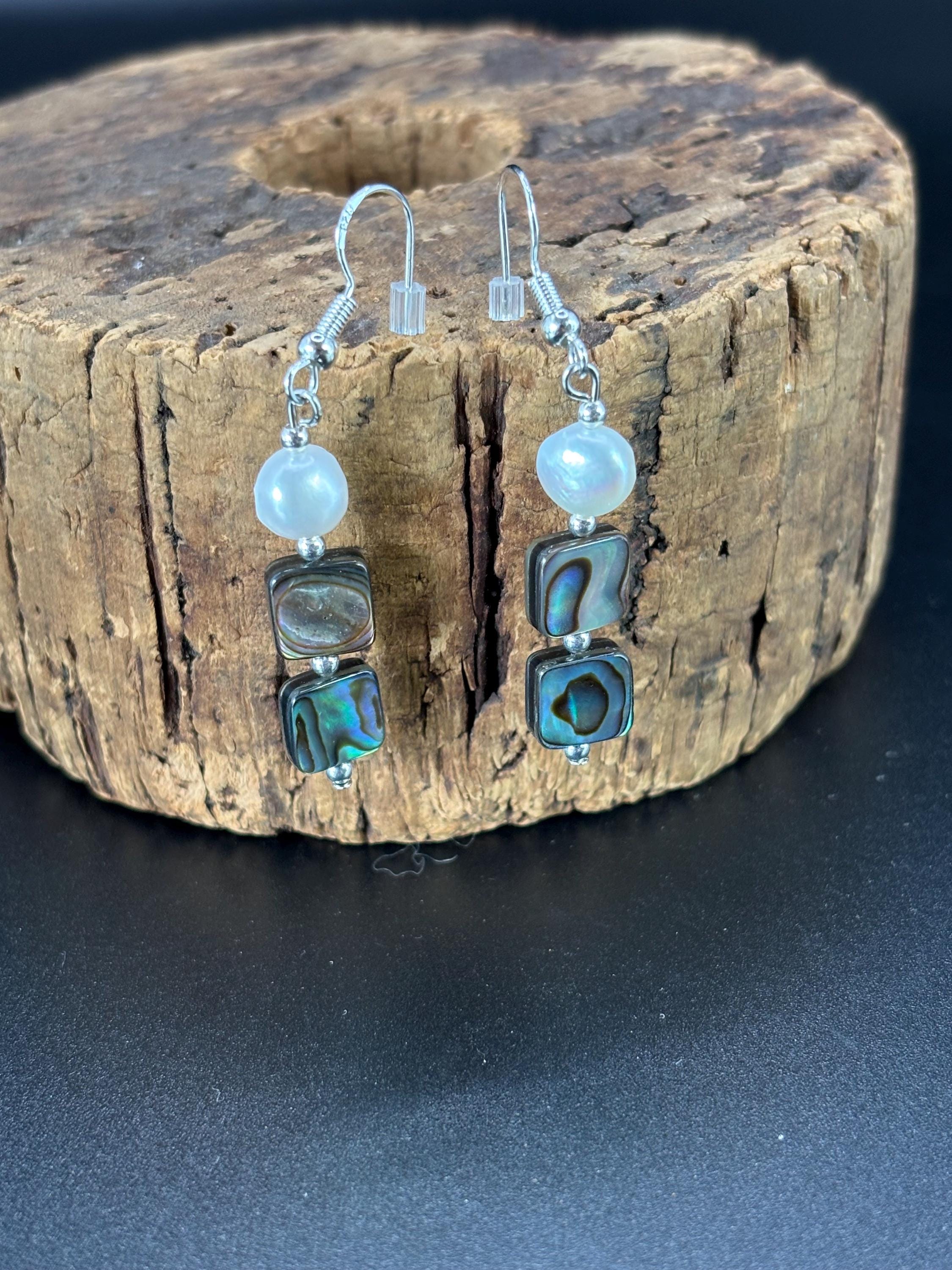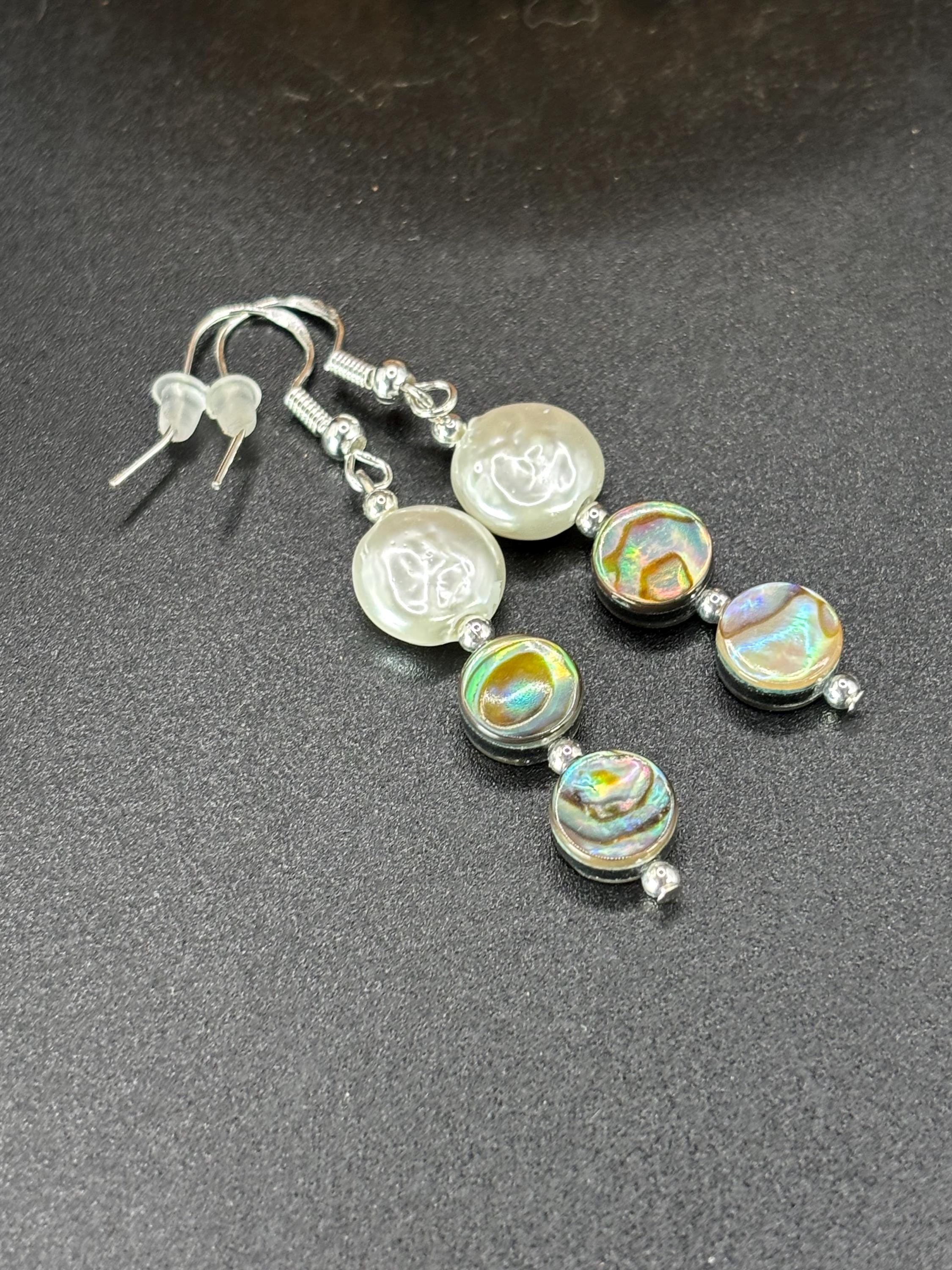 These earrings are made with Abalone and fresh water pearls. There are 3 variations available. They are on silver ear wires.
