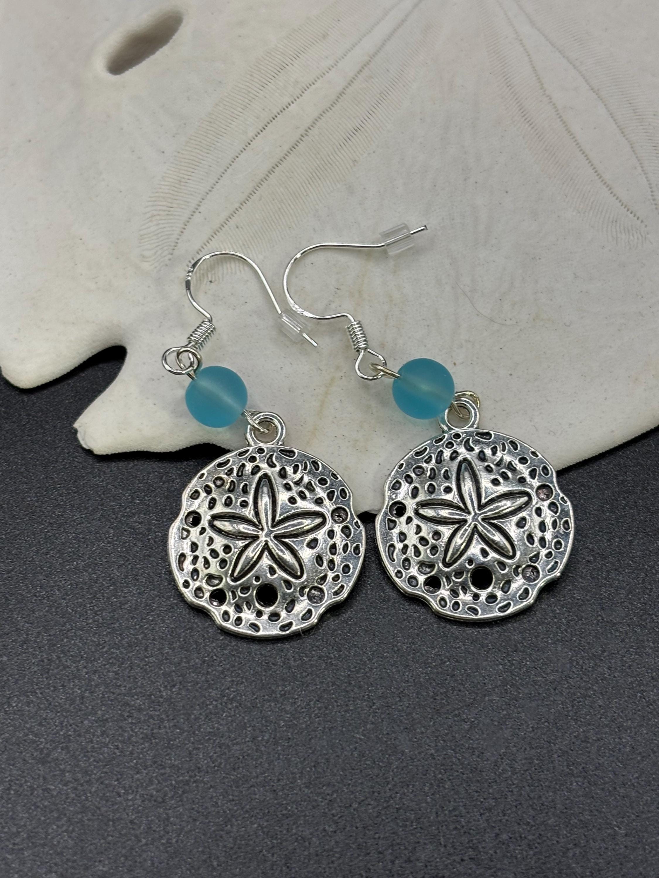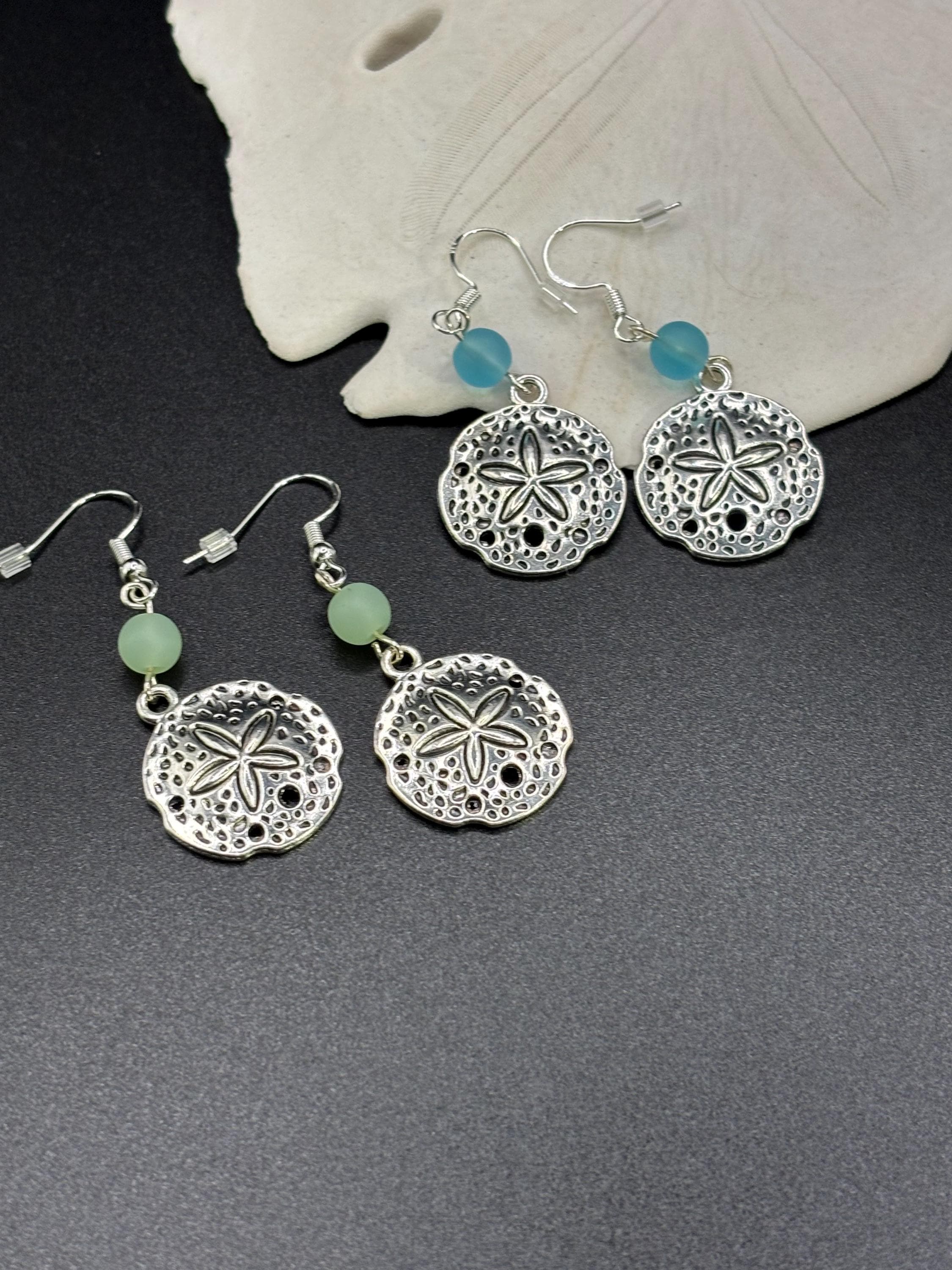 These Sand Dollar Seaglass earrings are made with Seaglass. They are on Sterling Silver ear wires and have a seaglass accent.
