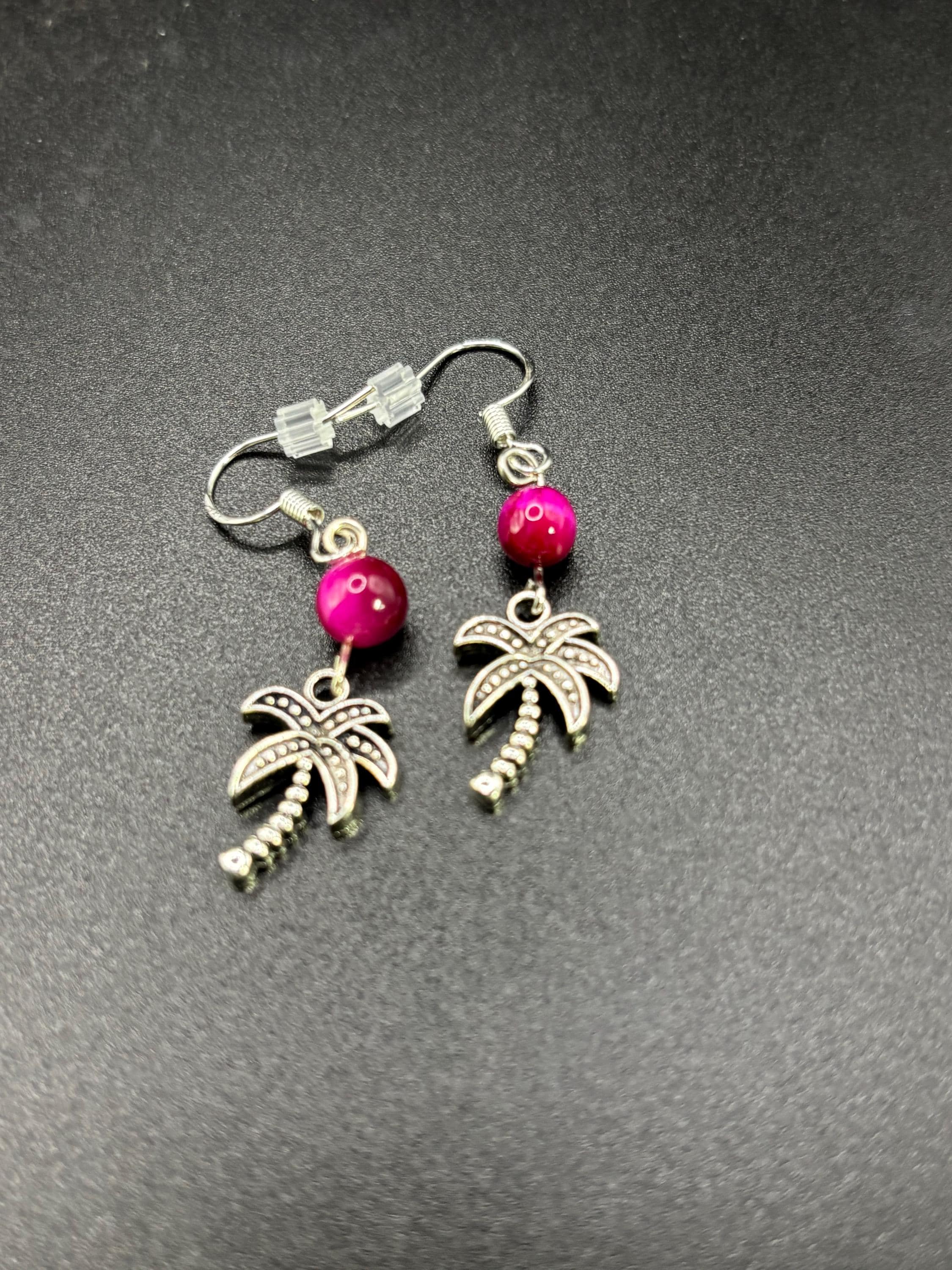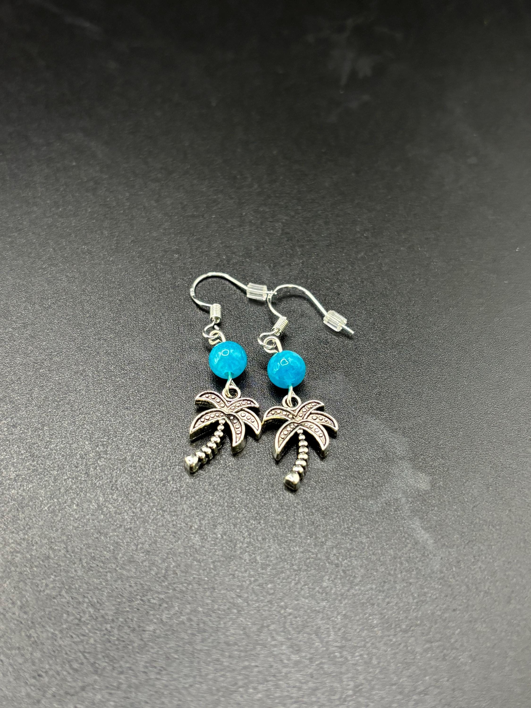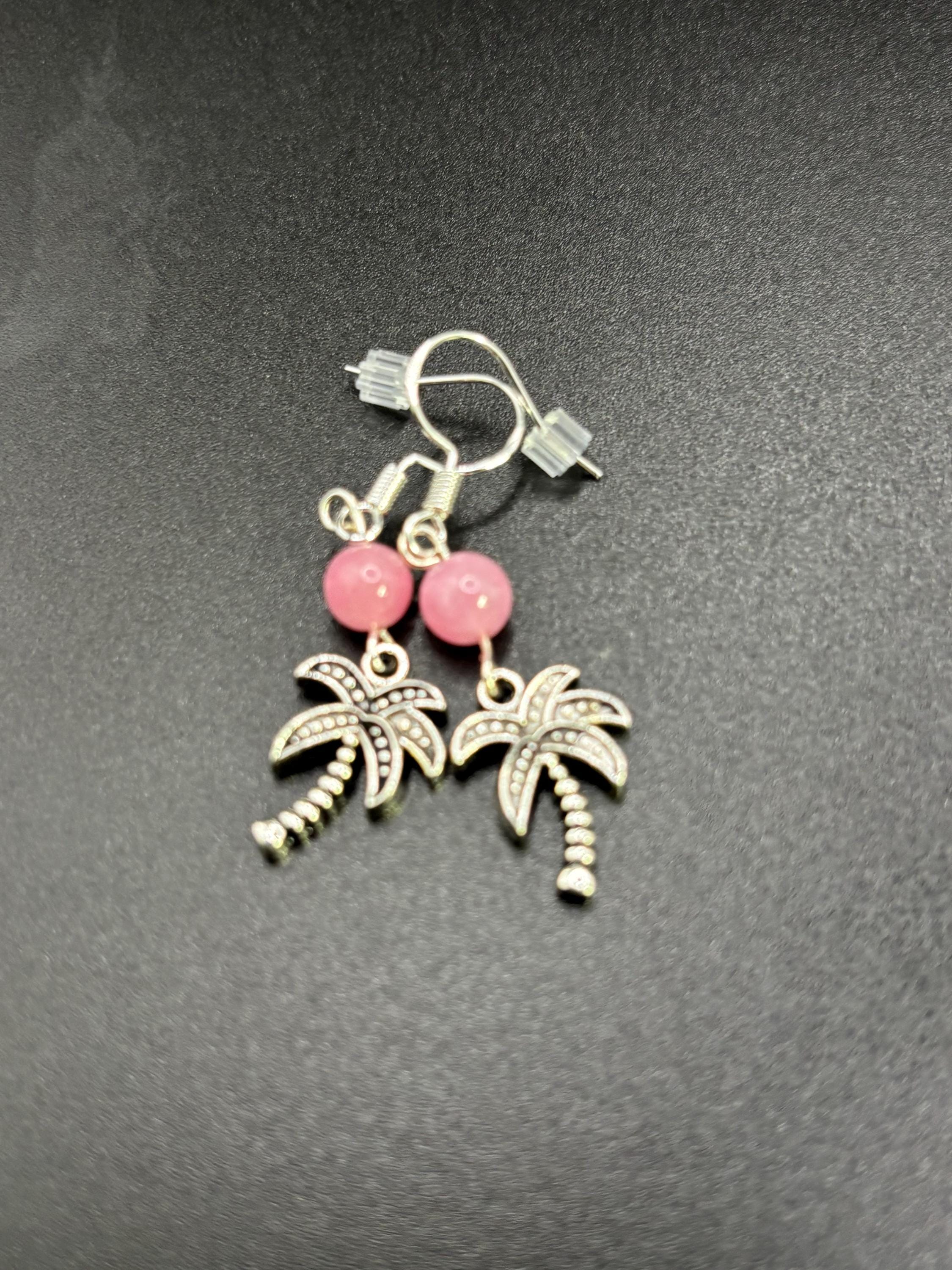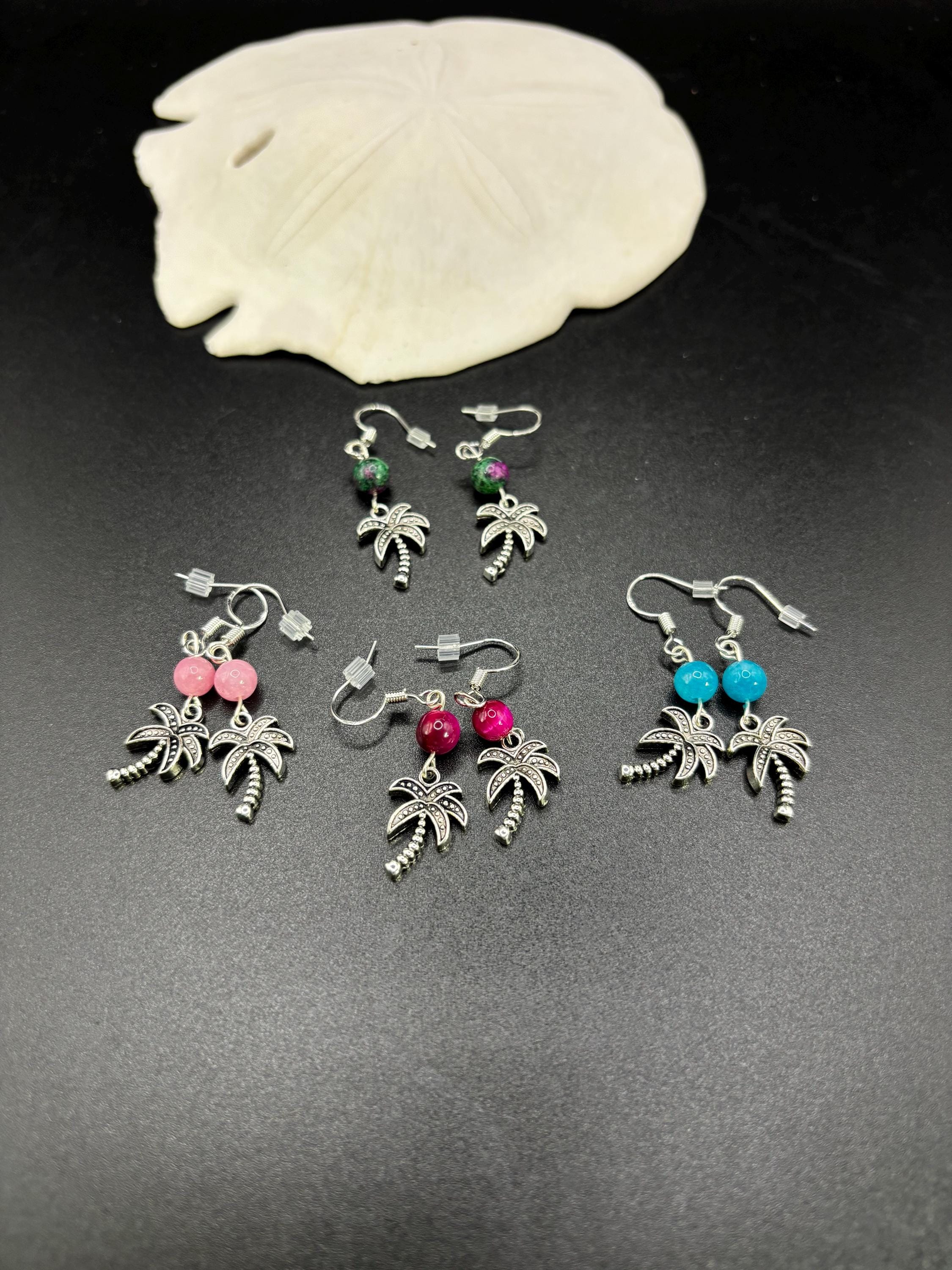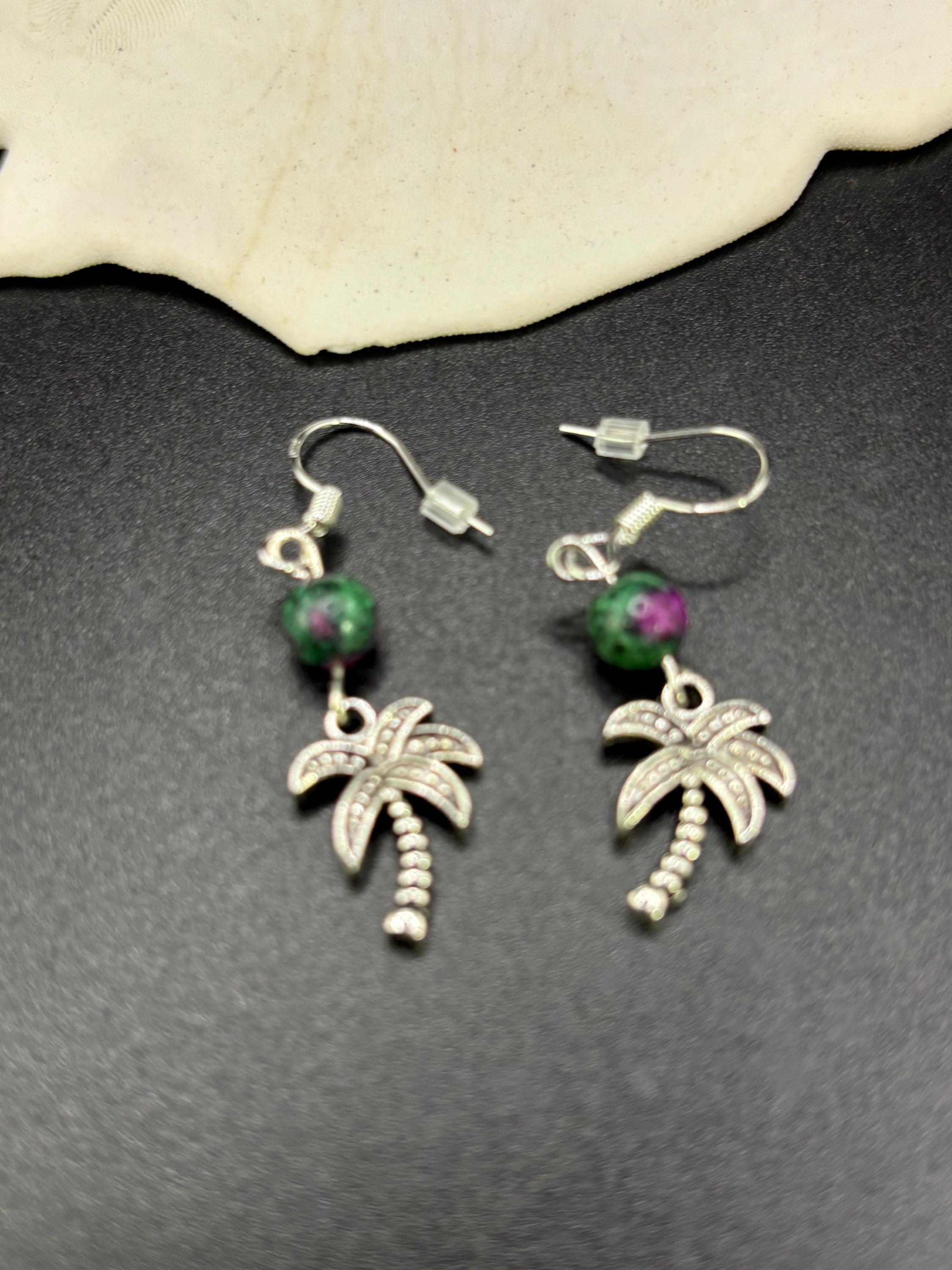 These palm tree earrings are made with silver charms and paired with gemstones. They are on silver ear wires.