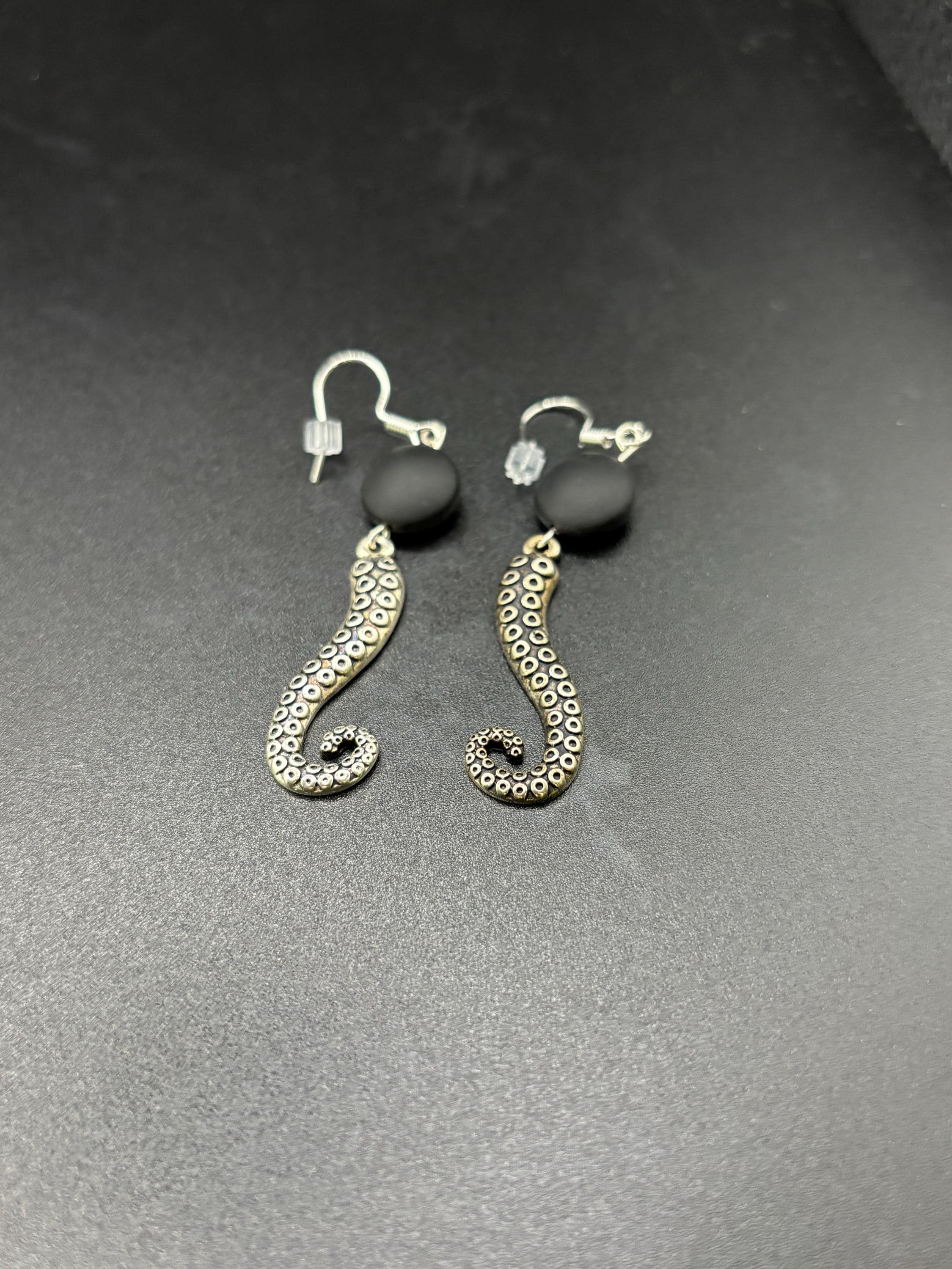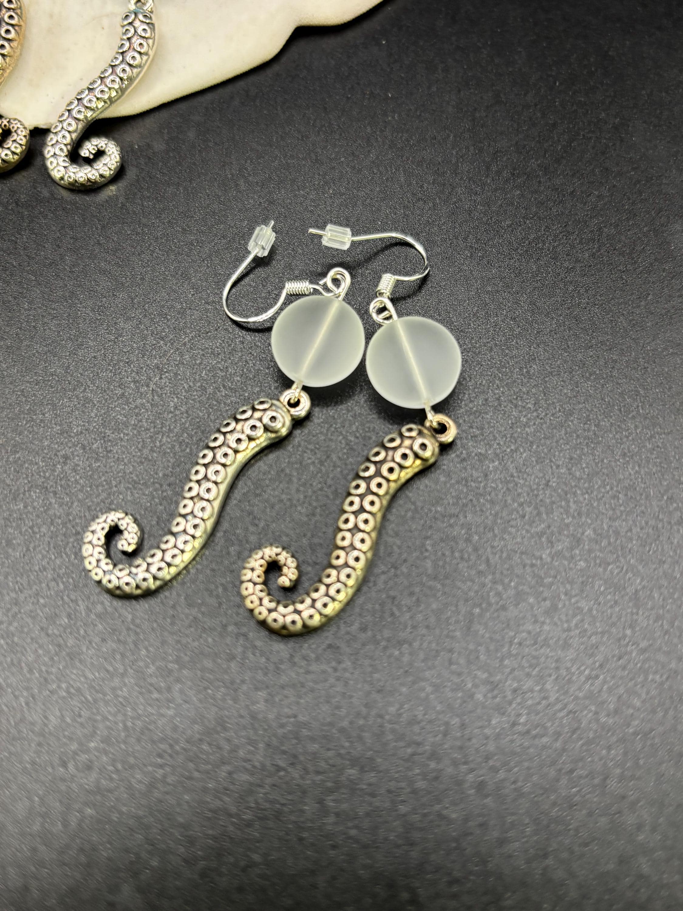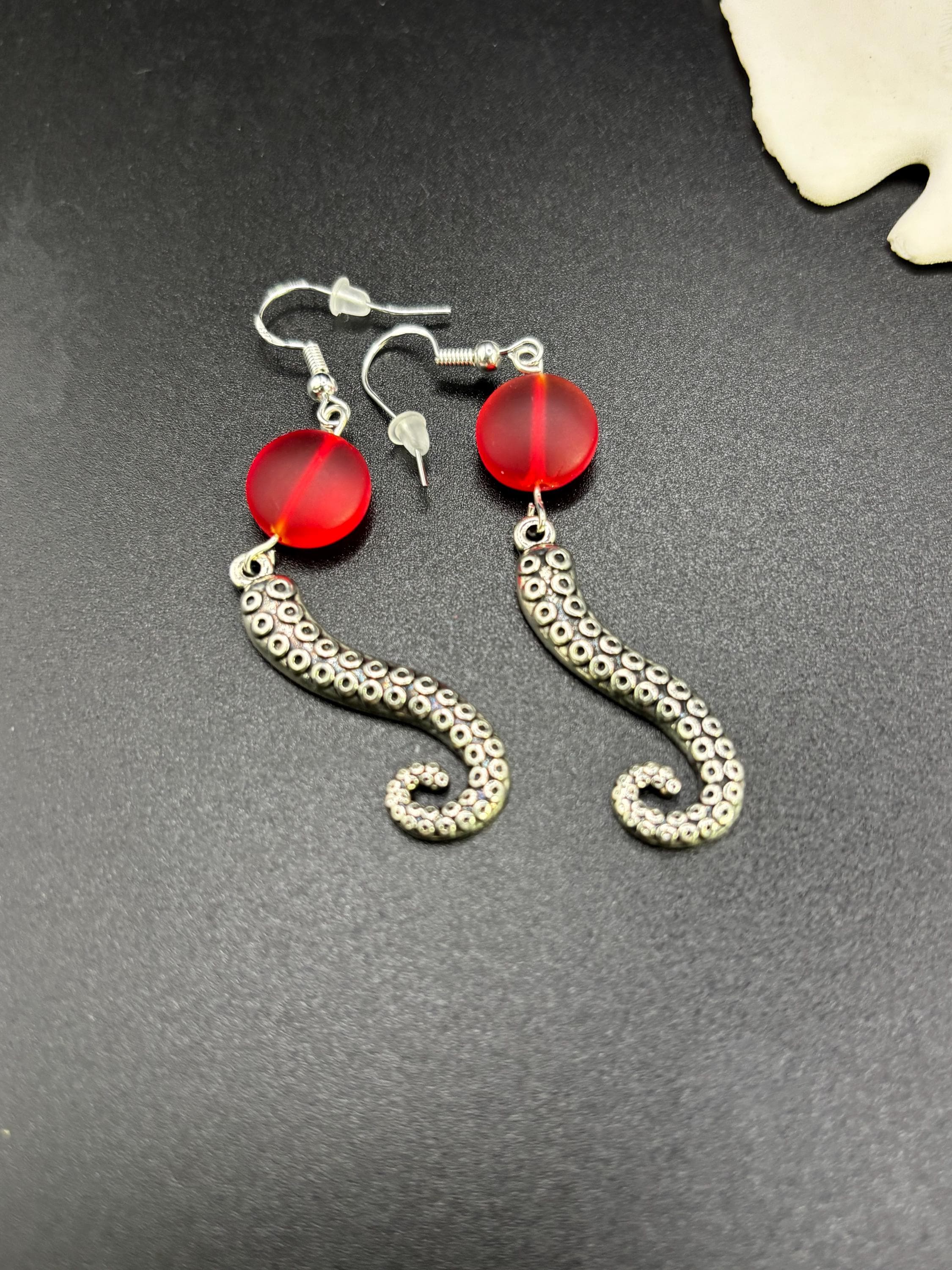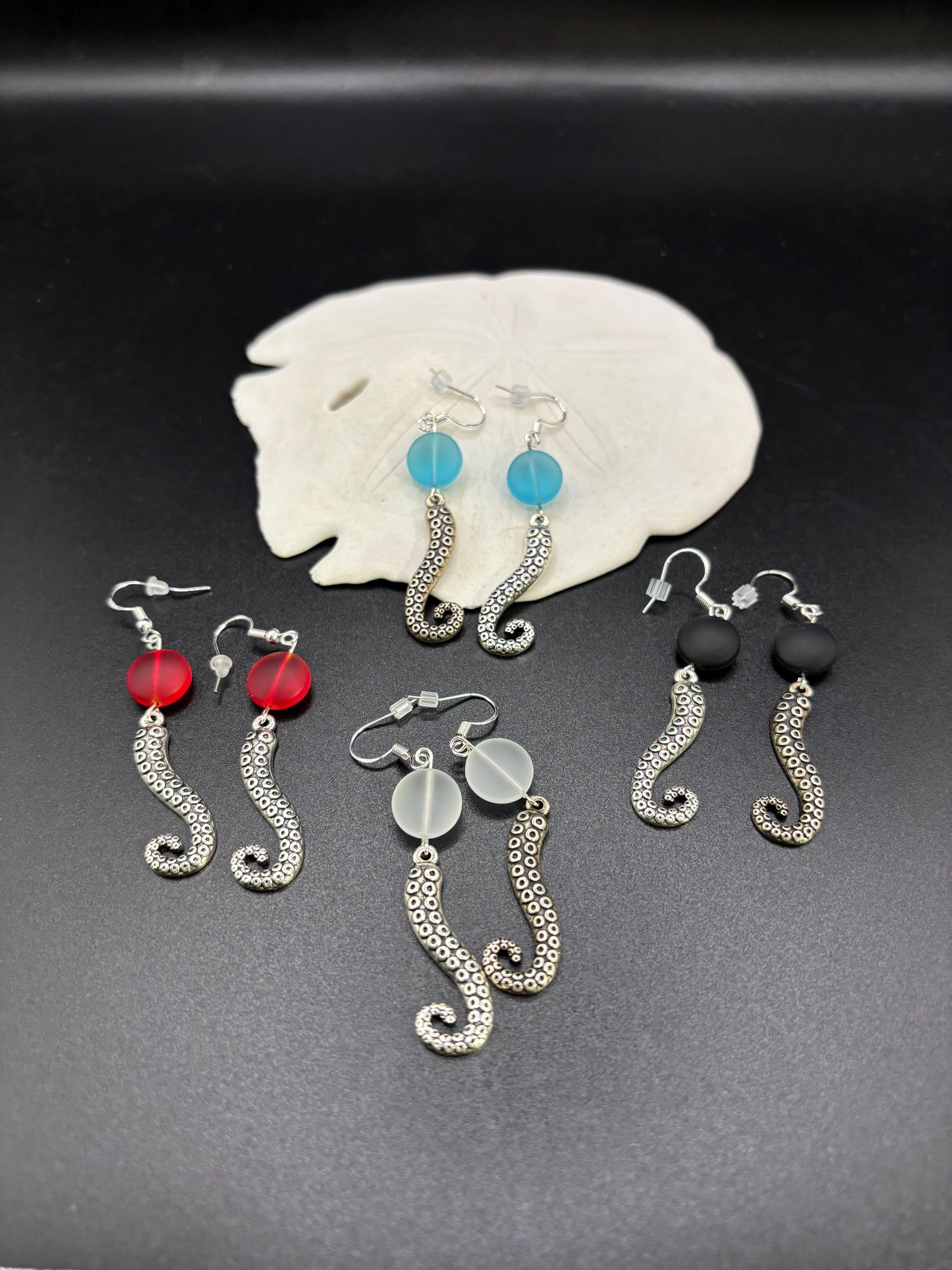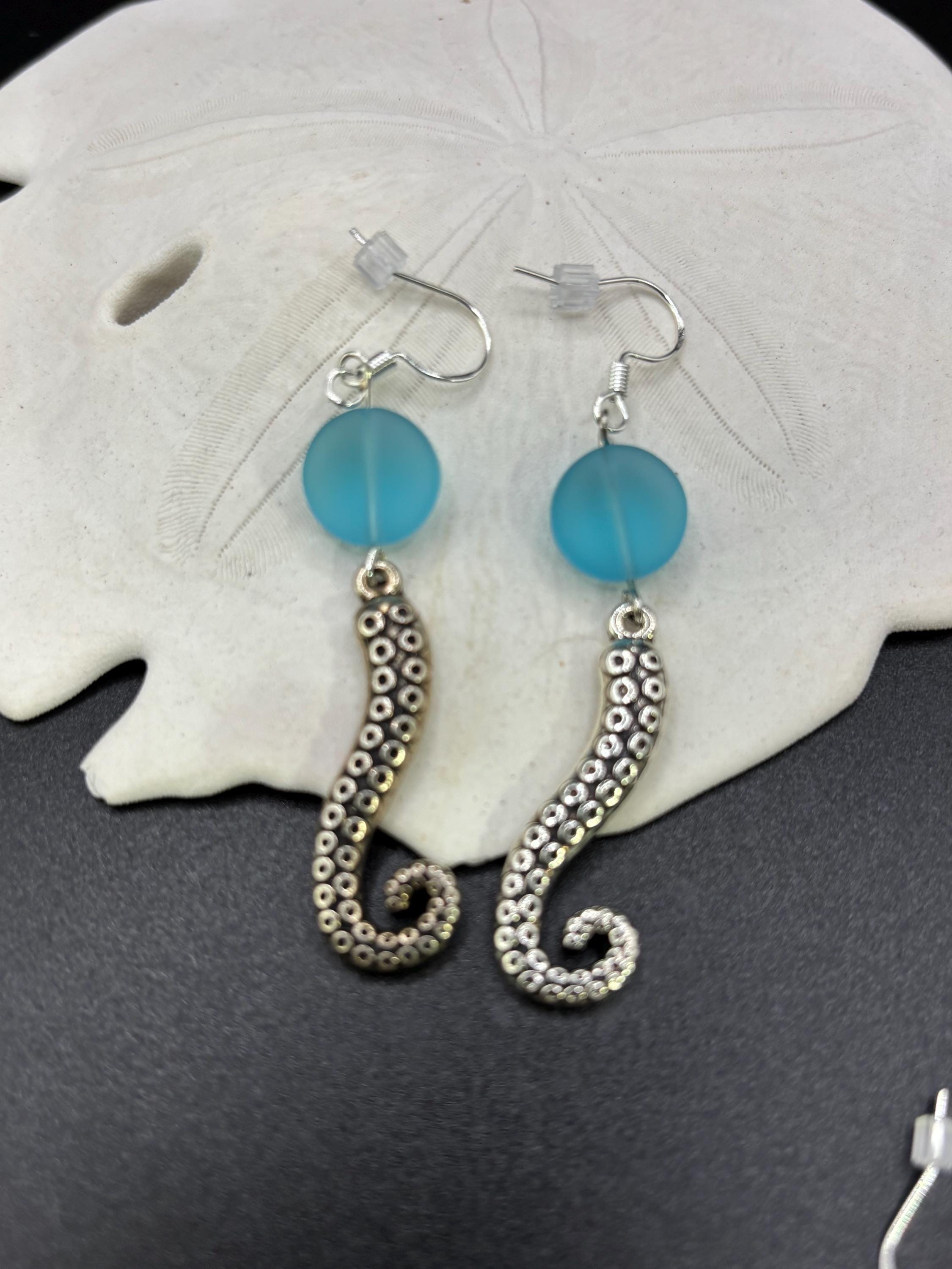 These Octopus Seaglass earrings are made with Seaglass. They are on Sterling Silver ear wires and have a seaglass accent.