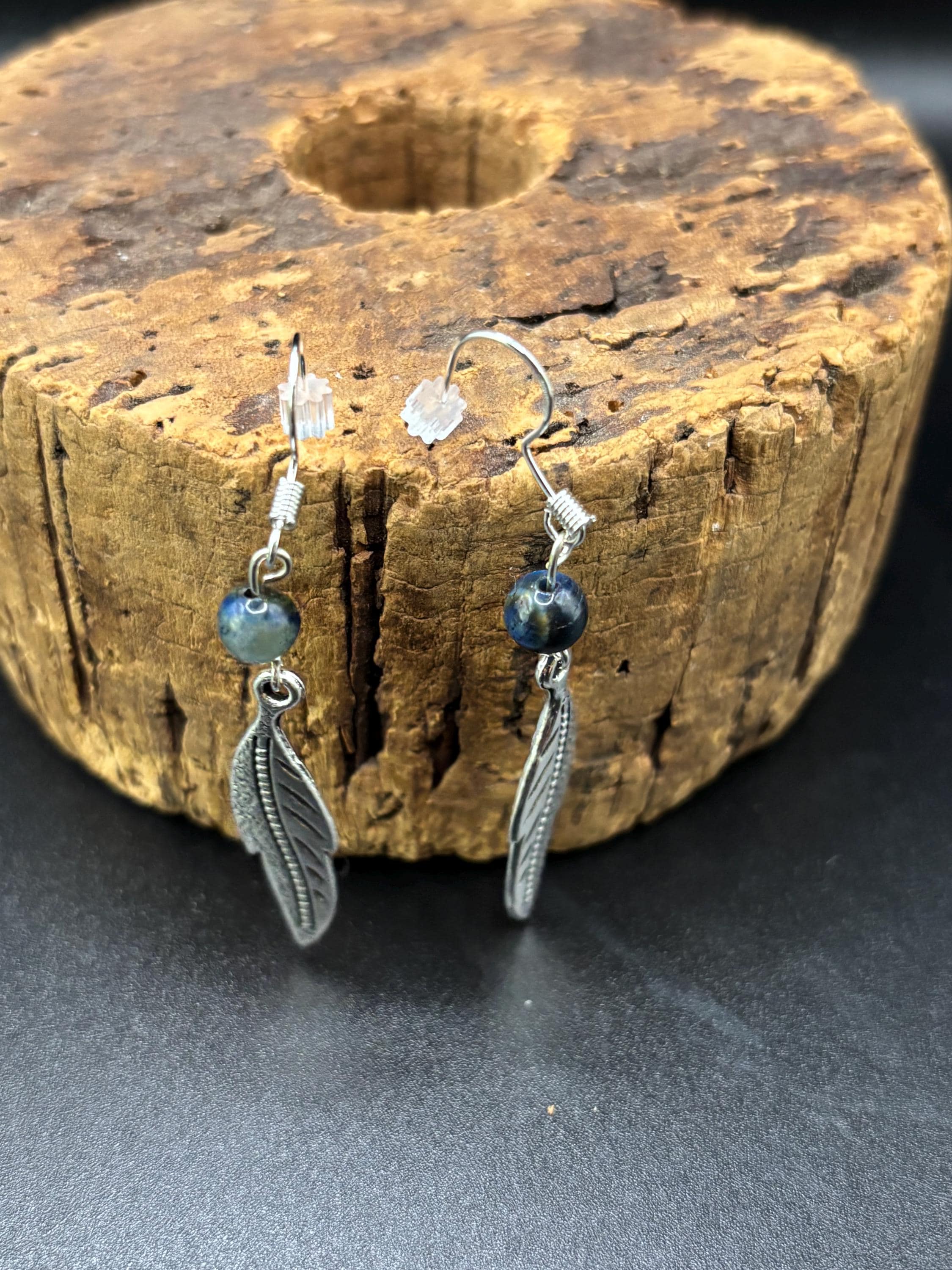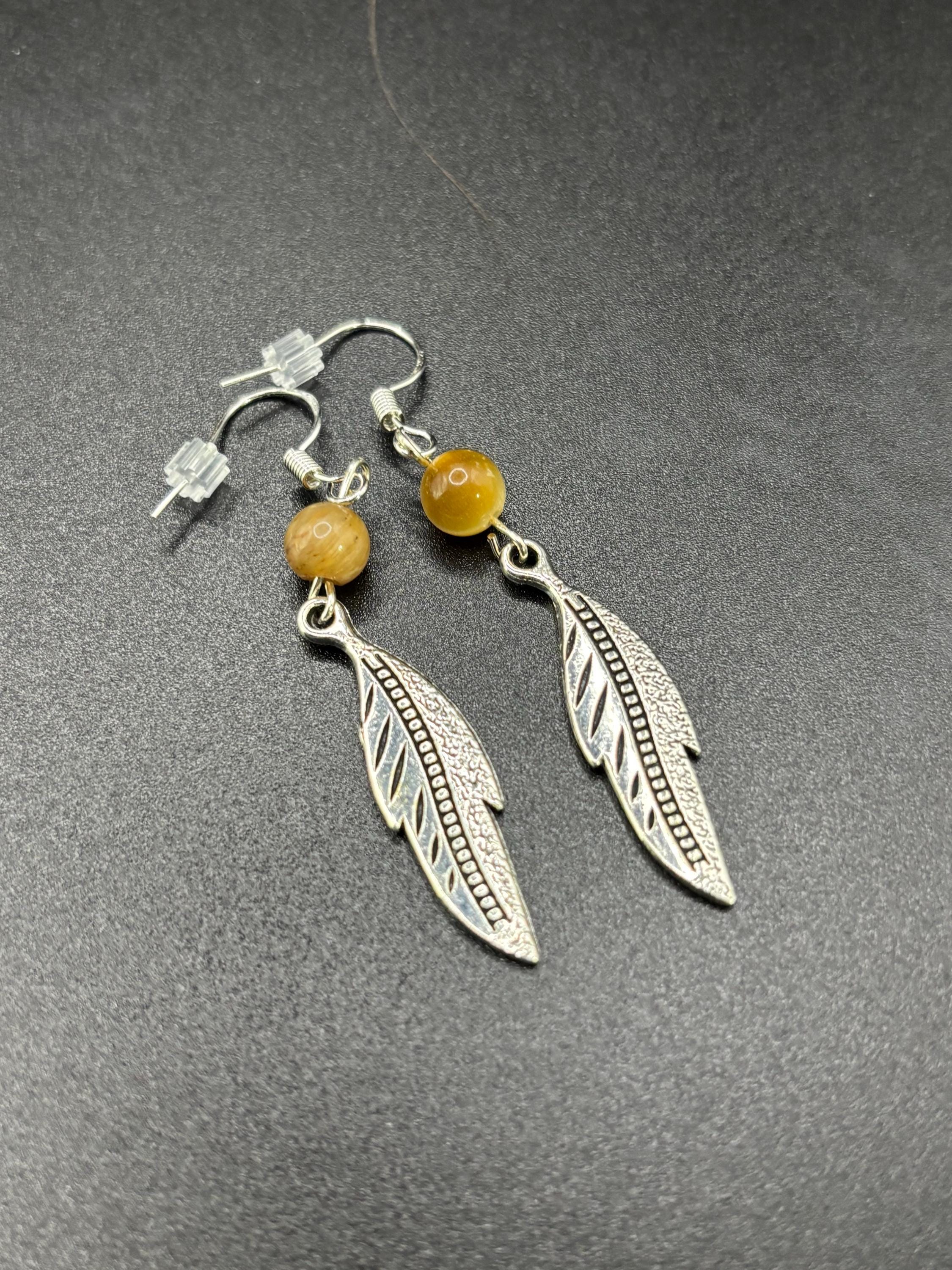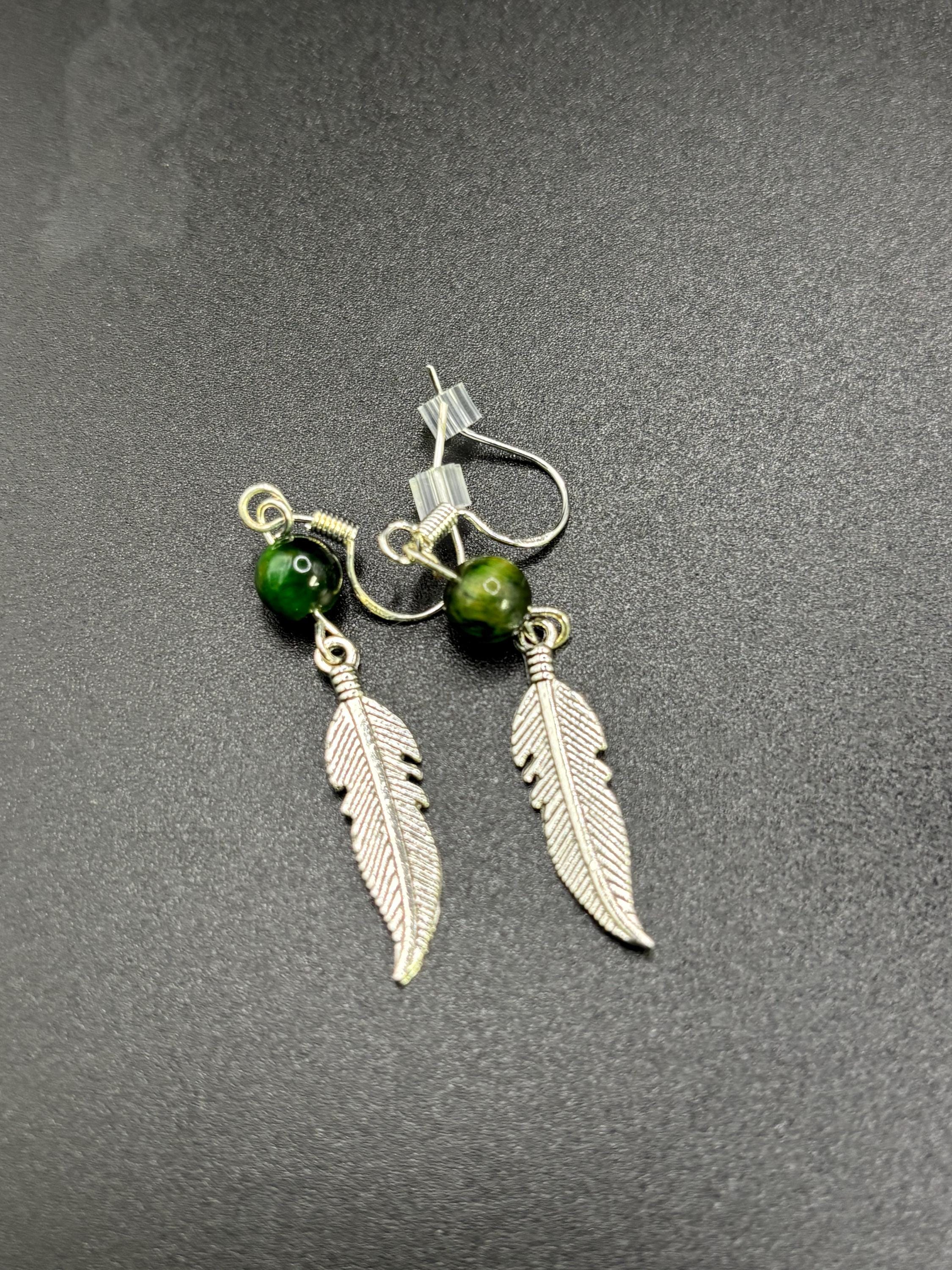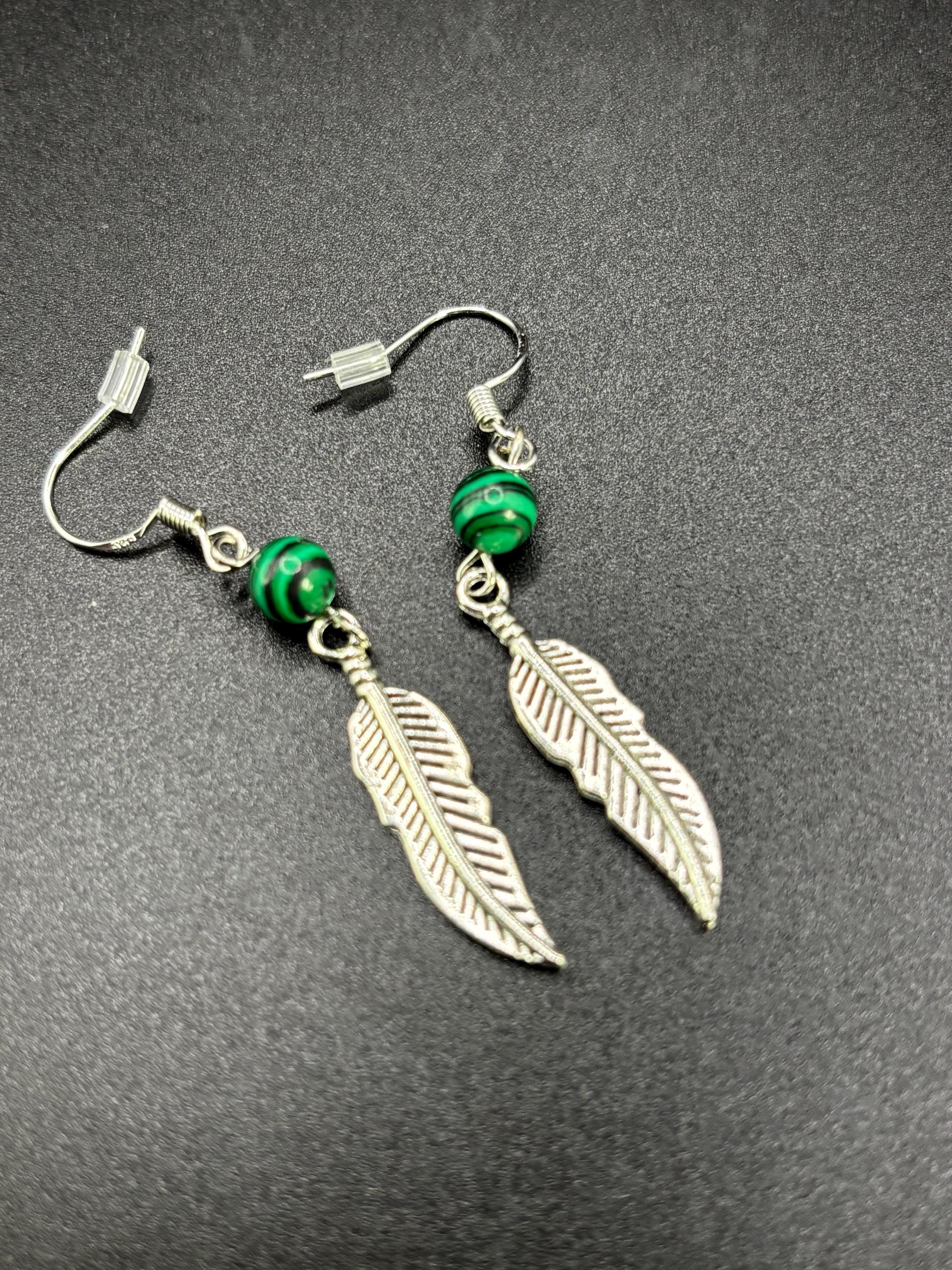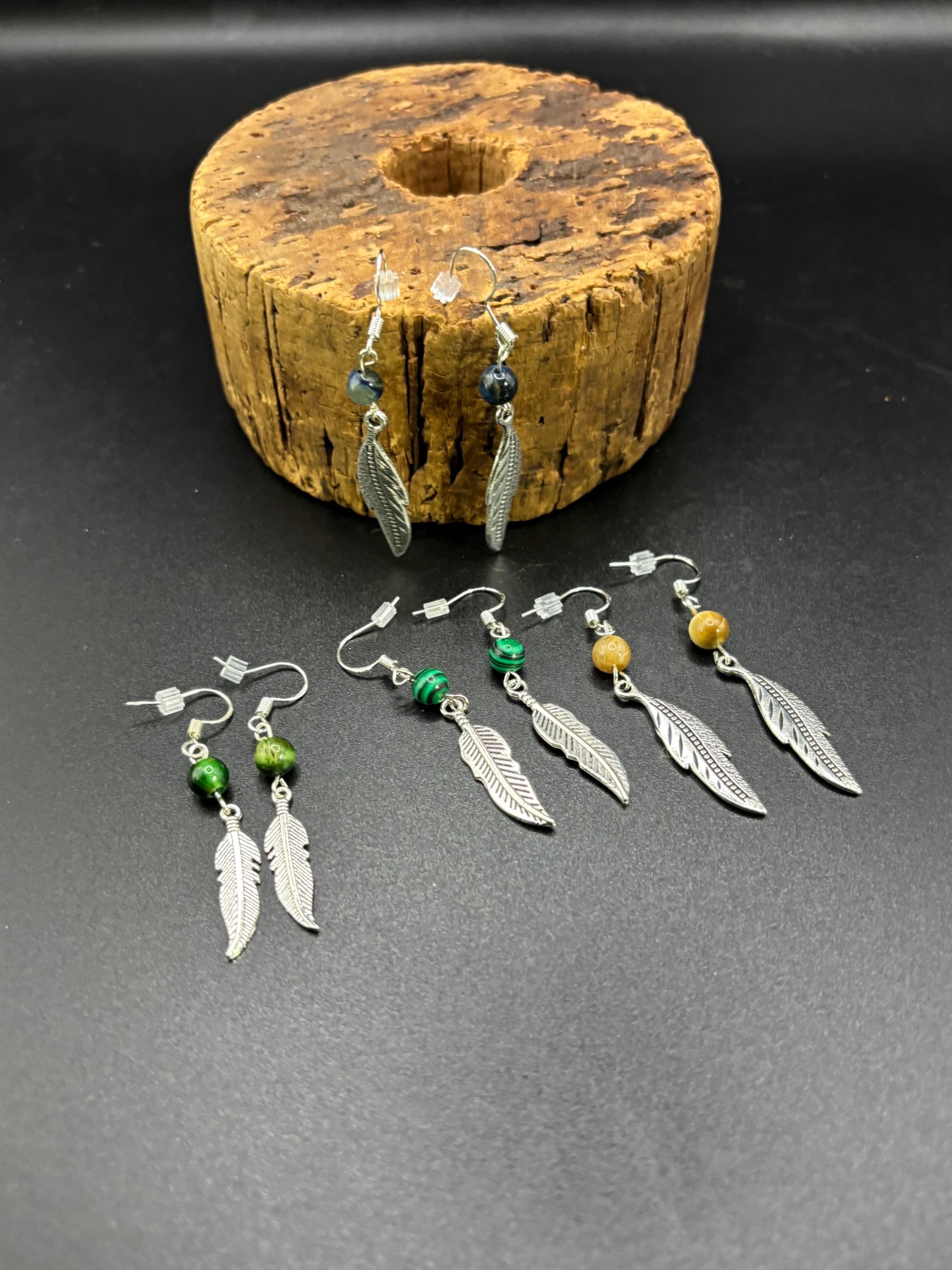 These earrings are made with feather enamel charms in vibrant colors, with gemstone accents.