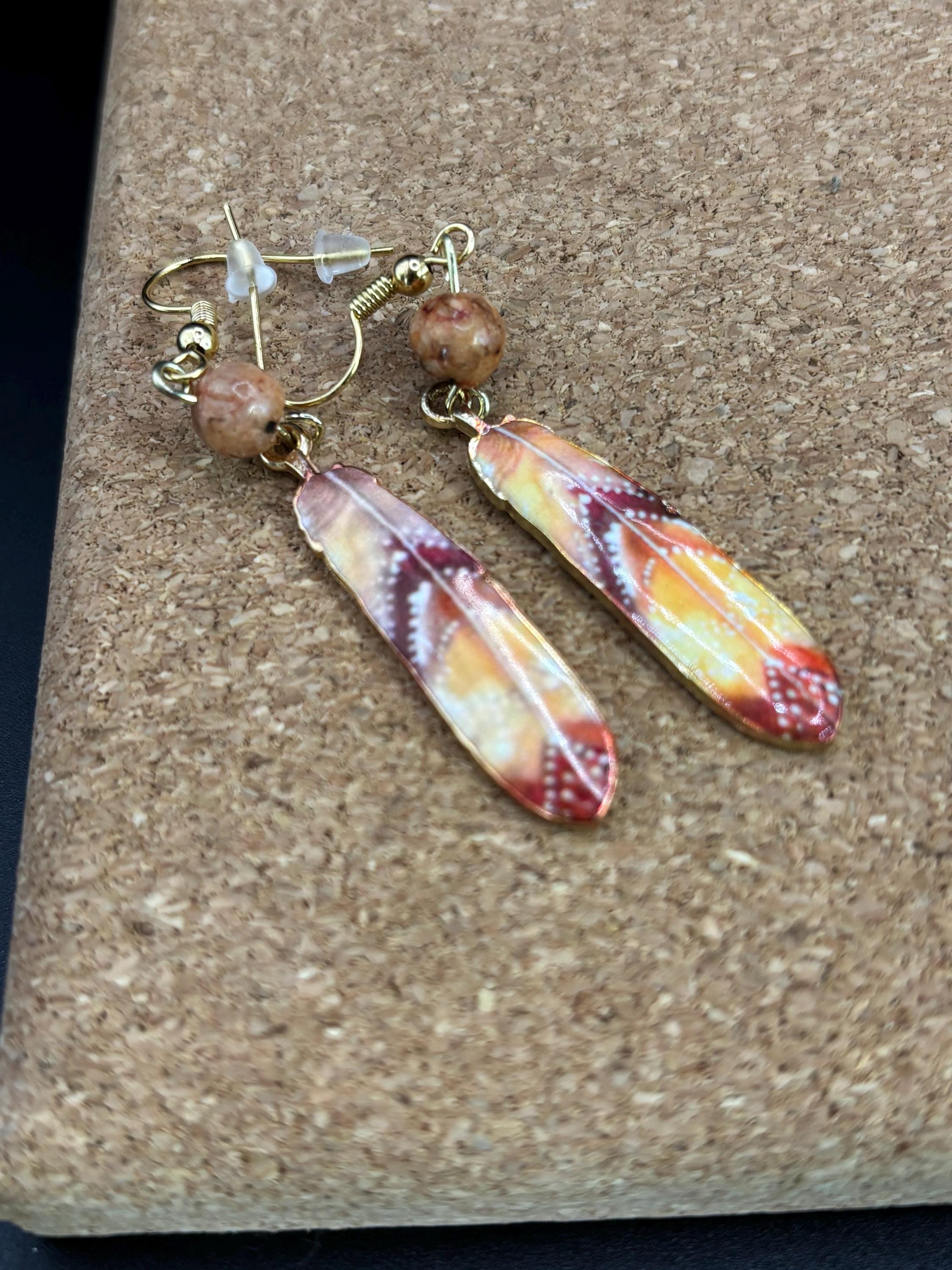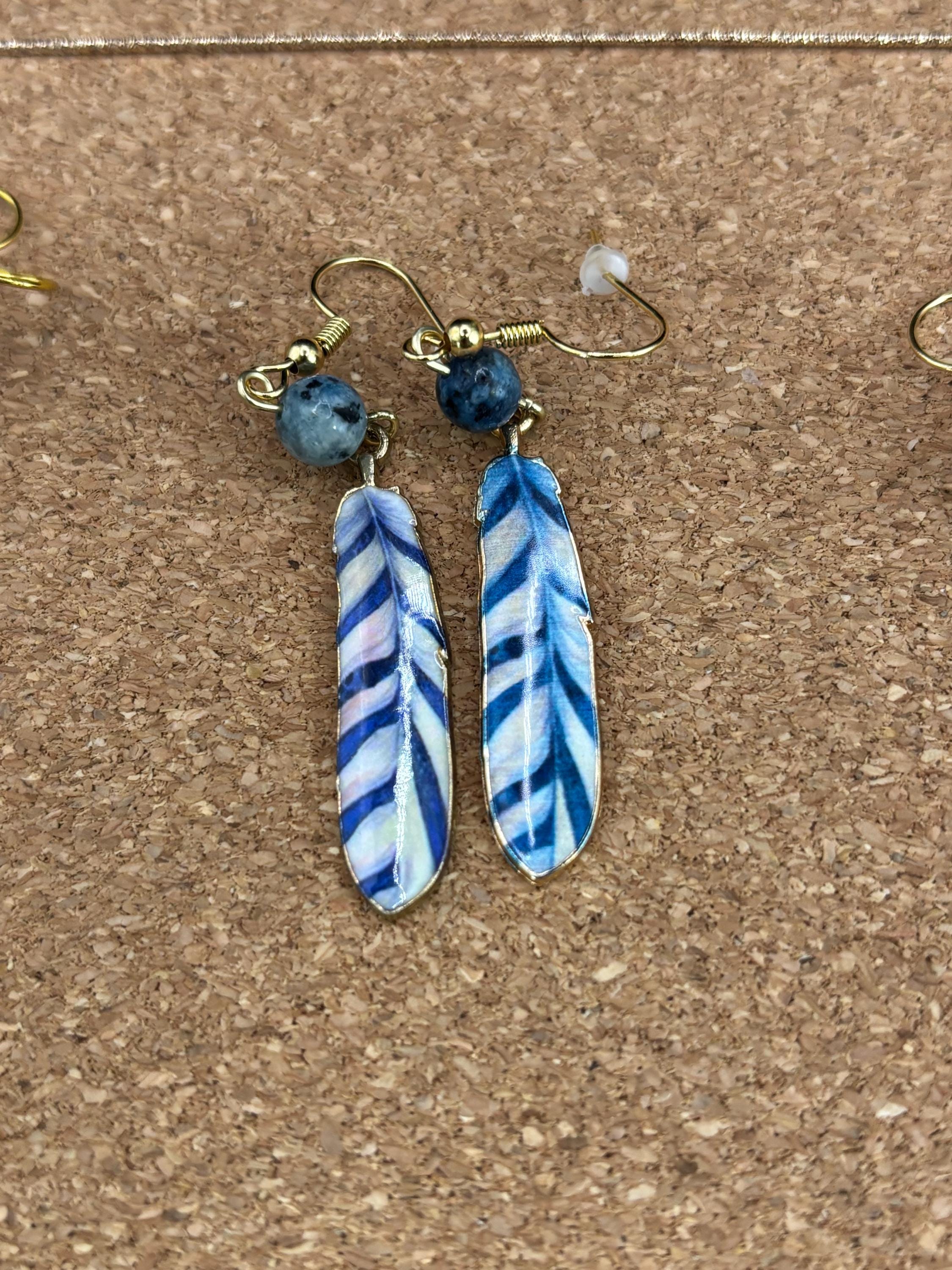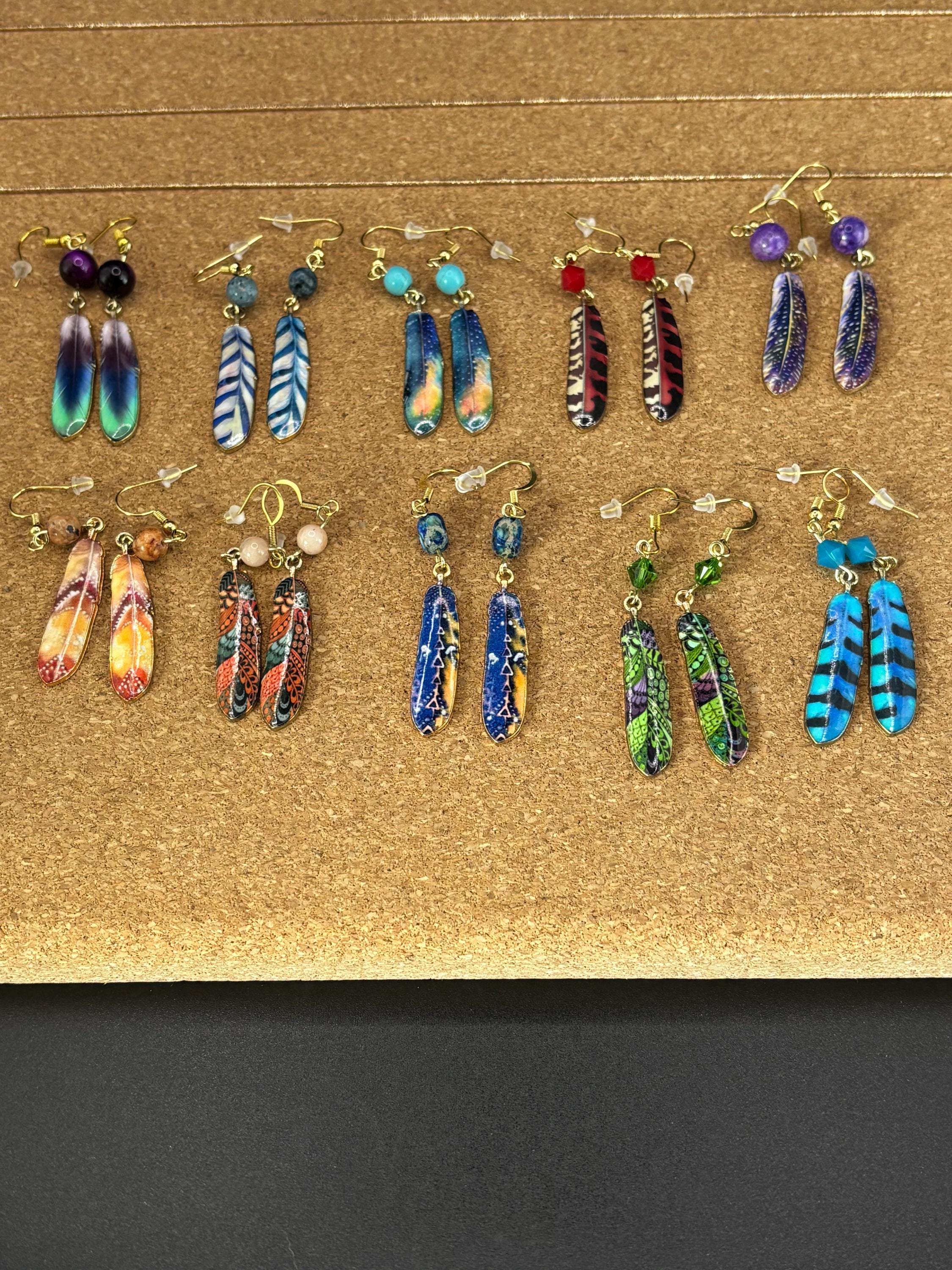 These earrings are made with feather enamel charms in vibrant colors, with either Swarovski Crystal or gemstone accents.