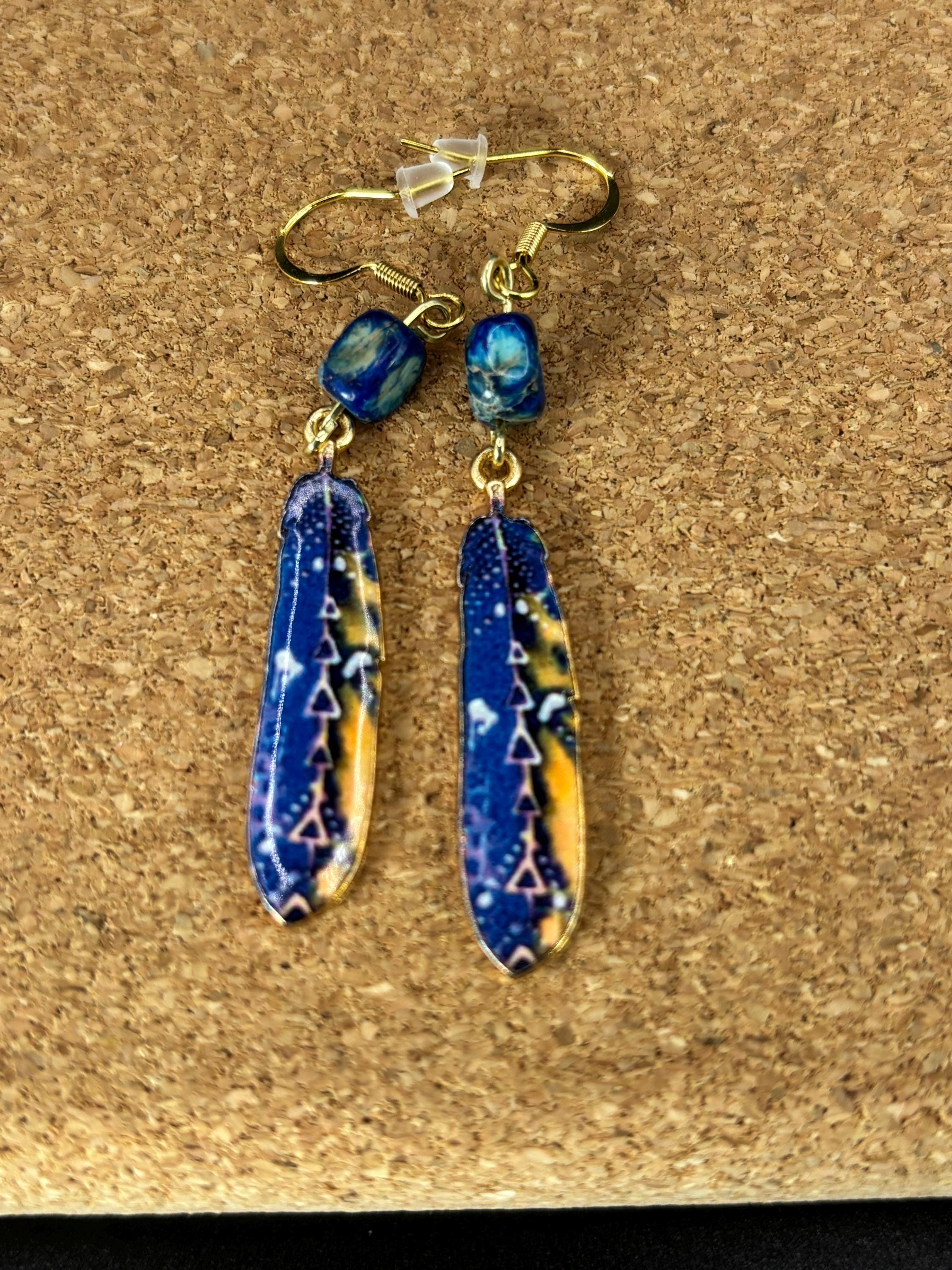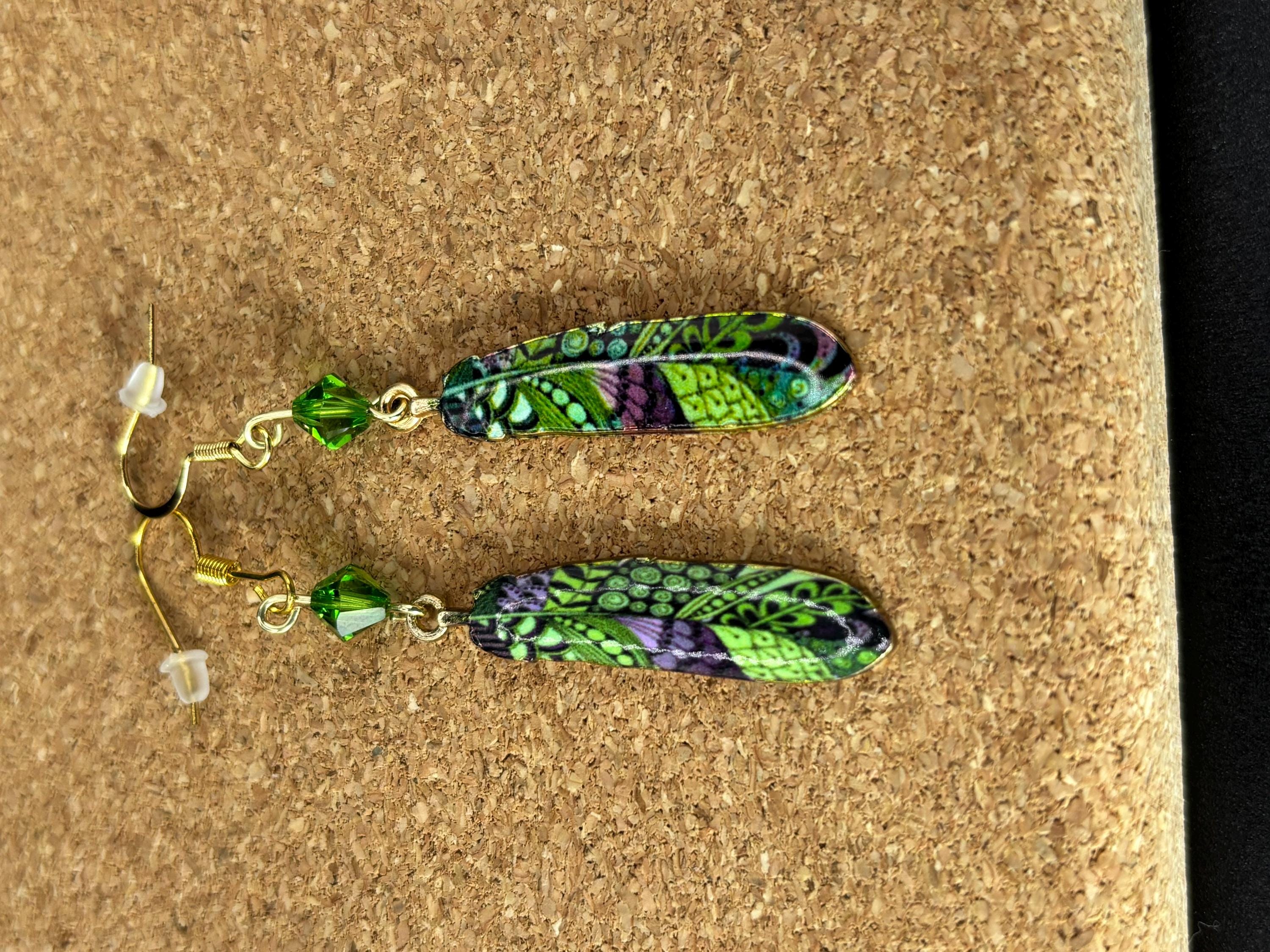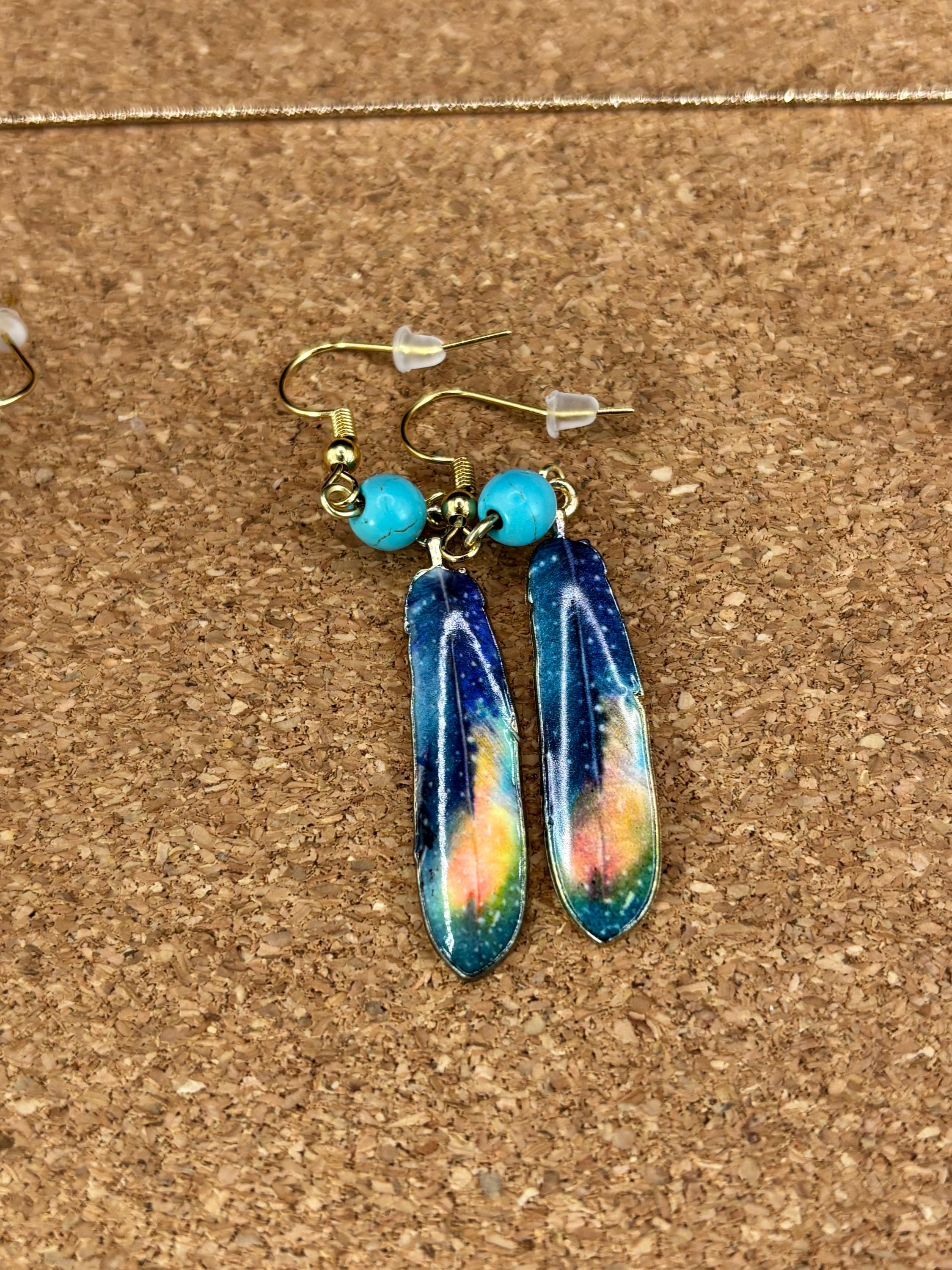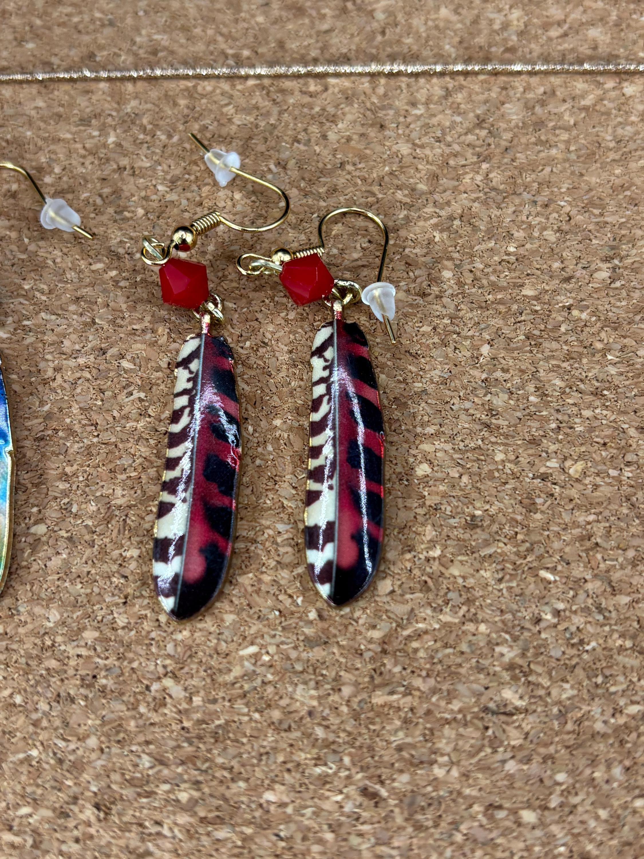 These earrings are made with feather enamel charms in vibrant colors, with either Swarovski Crystal or gemstone accents.