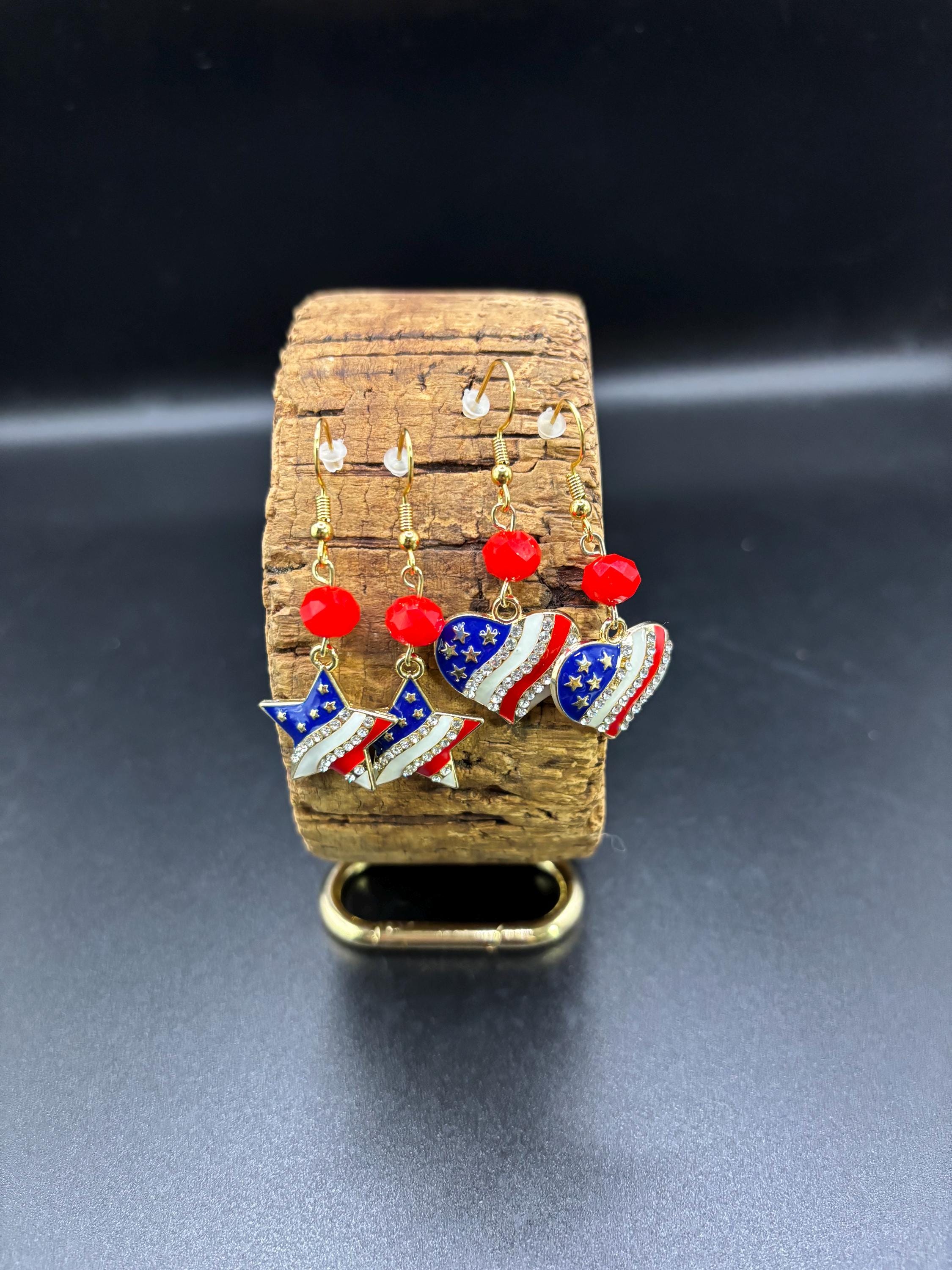 These earrings are made with gold filled hypoallergenic ear wires and have Red white and blue charms with crystals in the shape of hearts