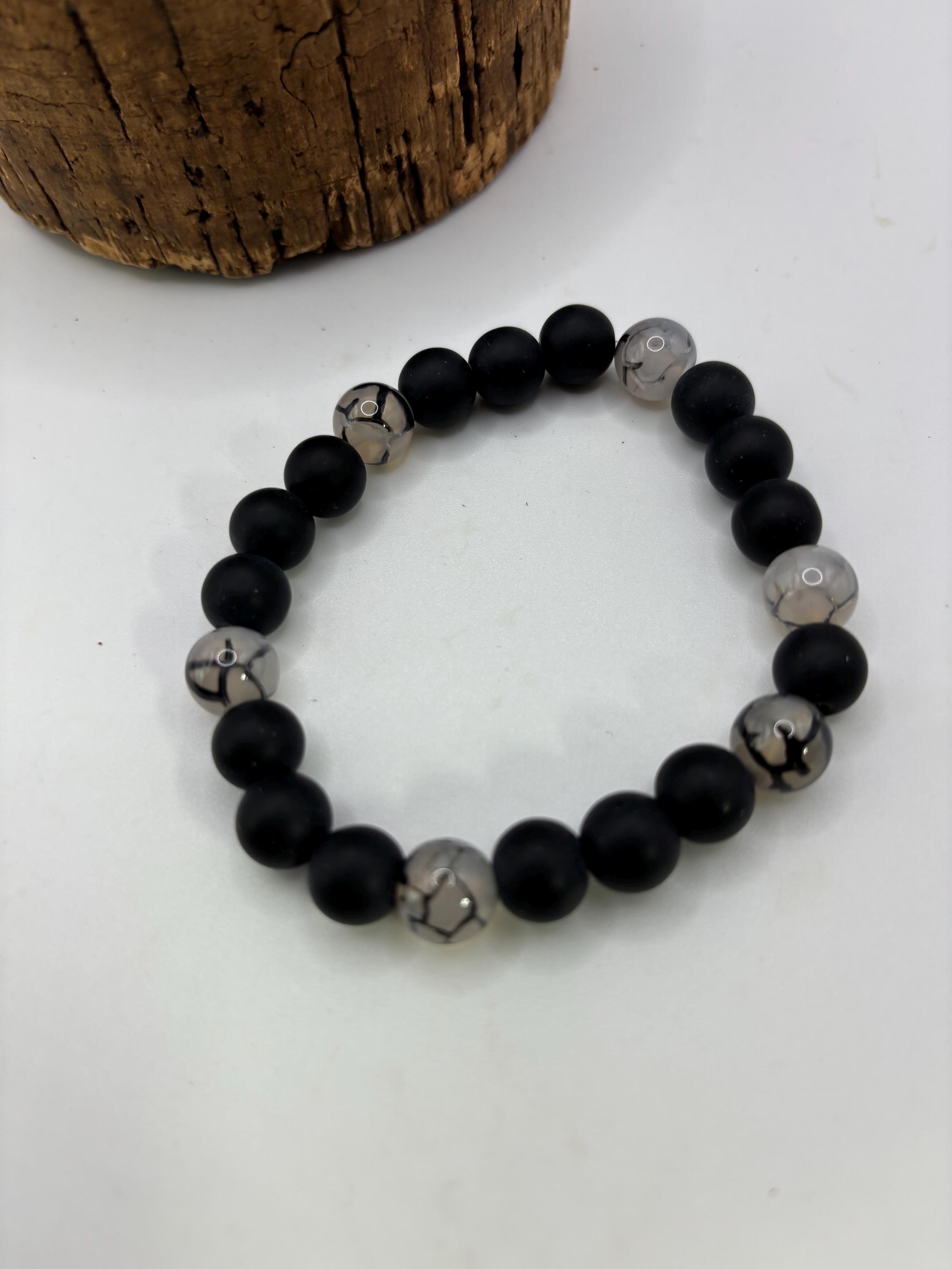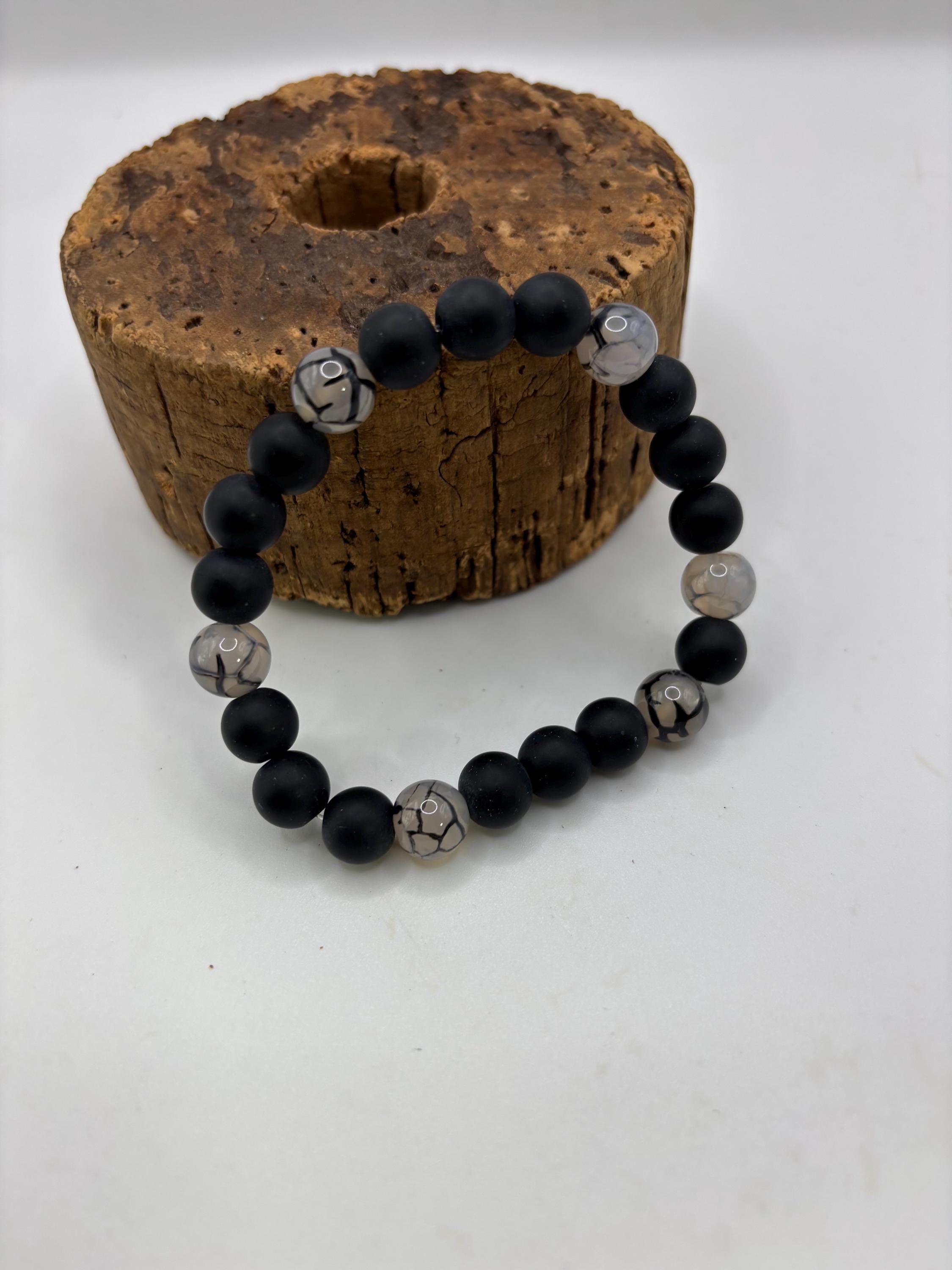 This stretch bracelet is created with Dragon Vein agate and Obsidian gemstones.