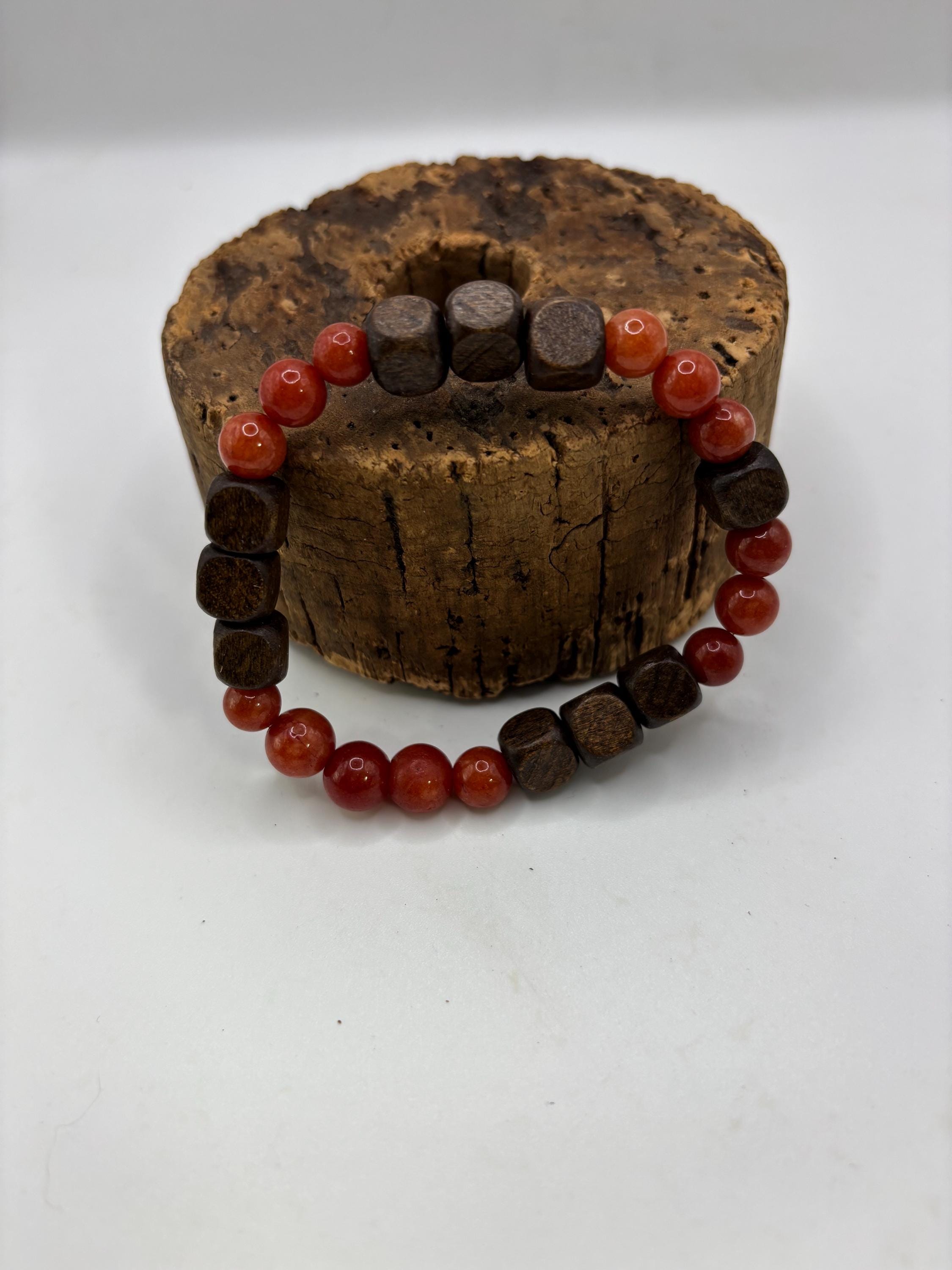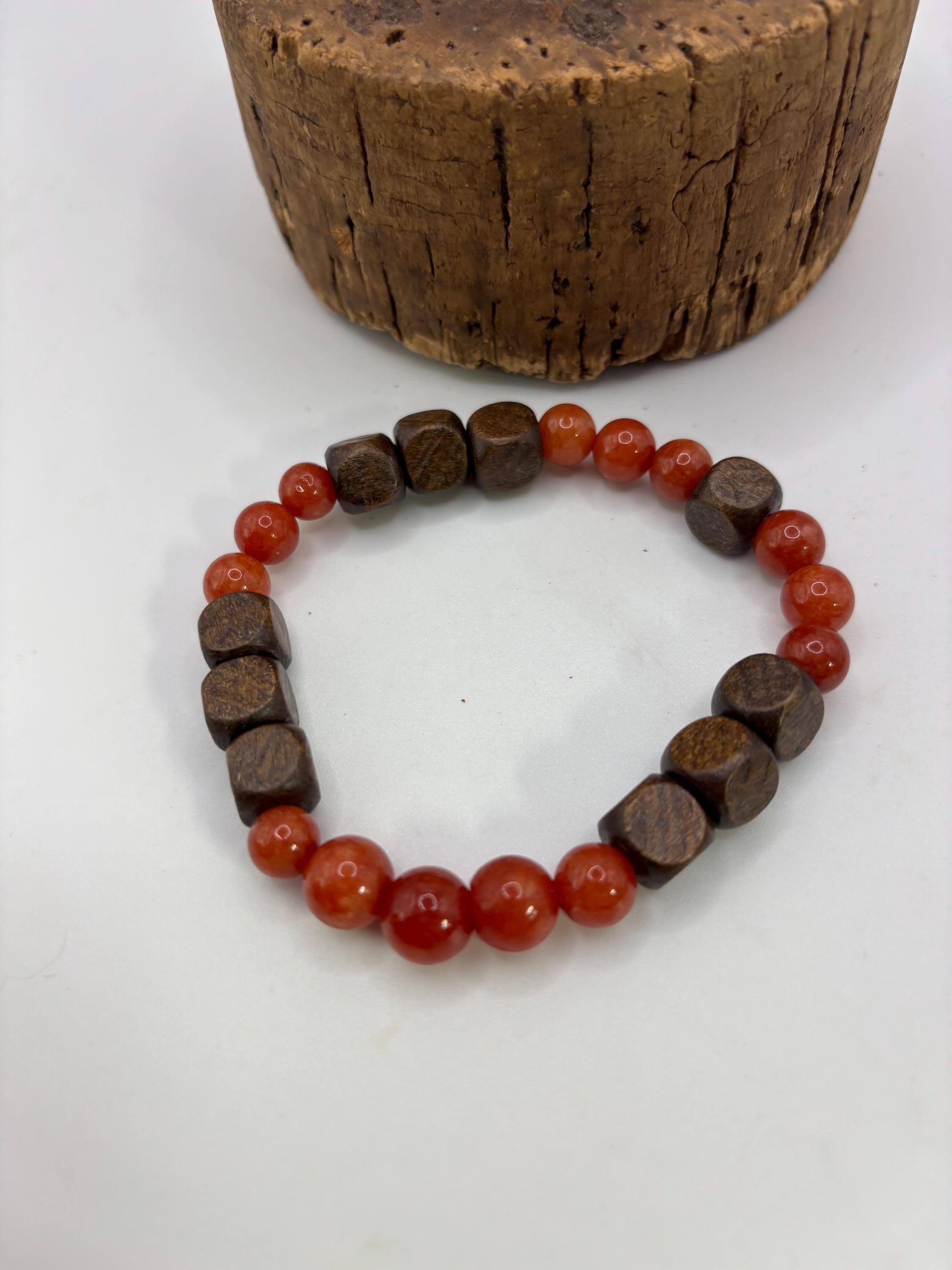 This stretch bracelet is created with Carnelian gemstones. .It has wood bead