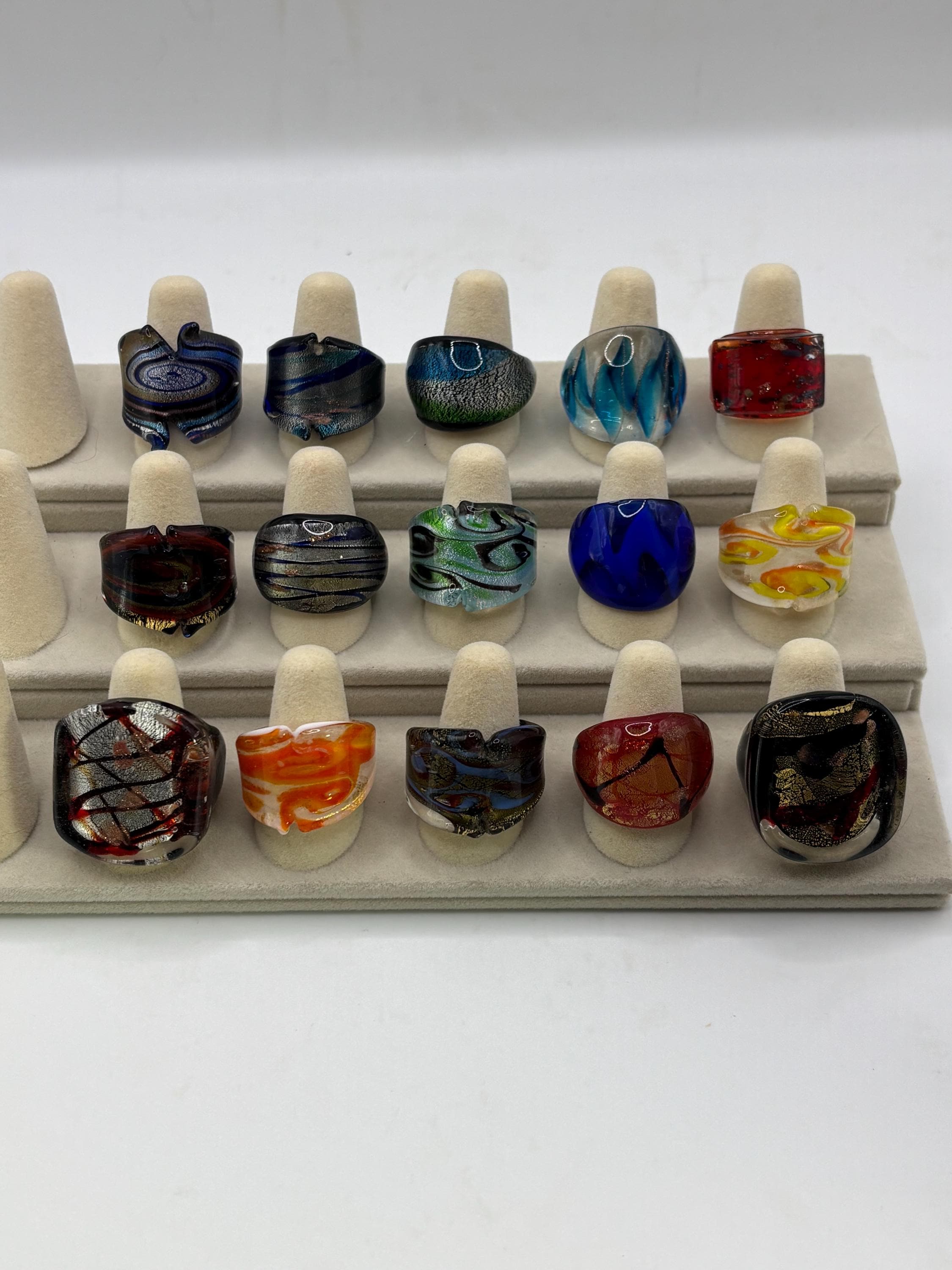 There will be many options by style, color and ring type. There are Millefiori designs as well as Murano inspired glass rings to chose from.