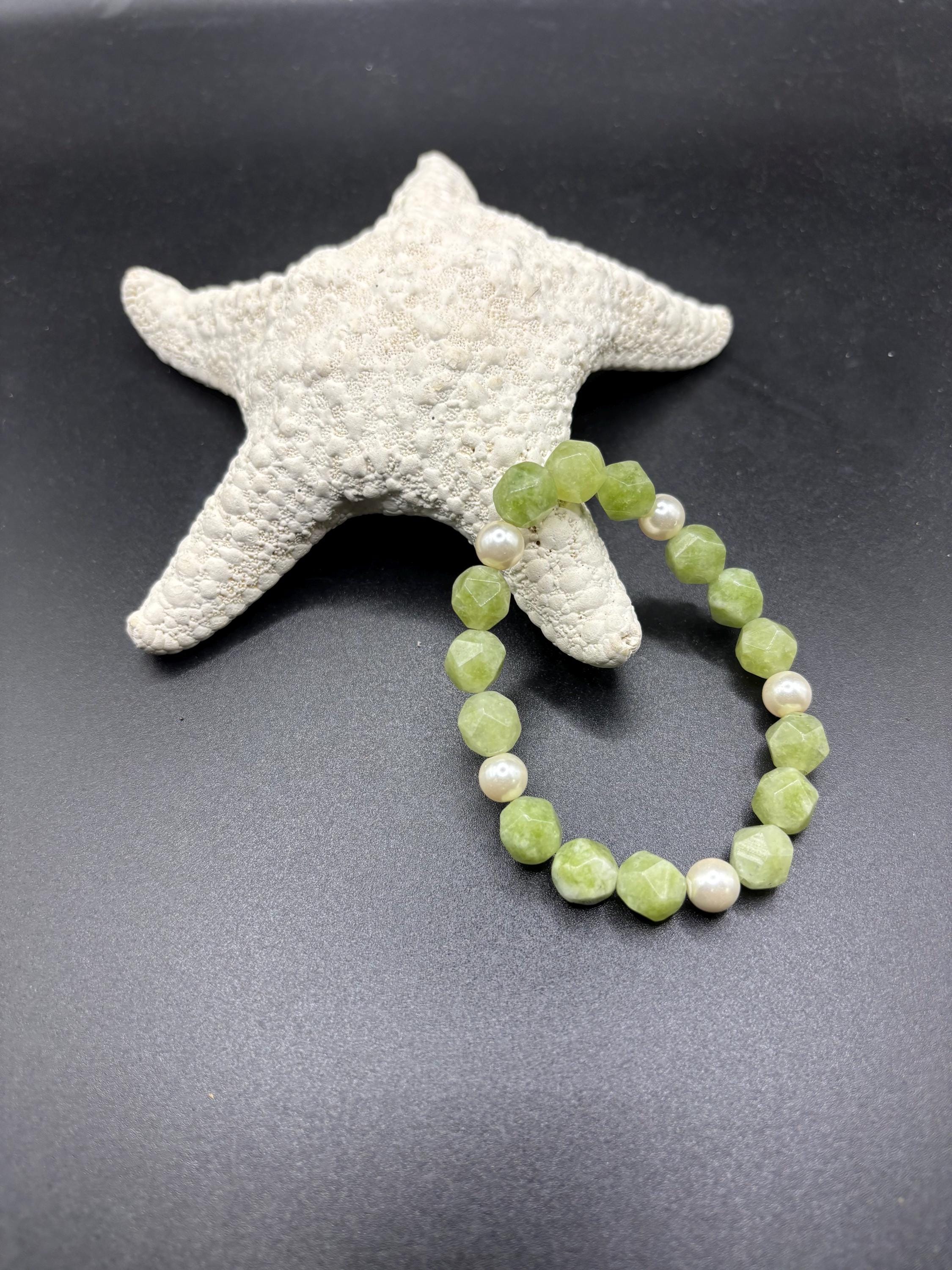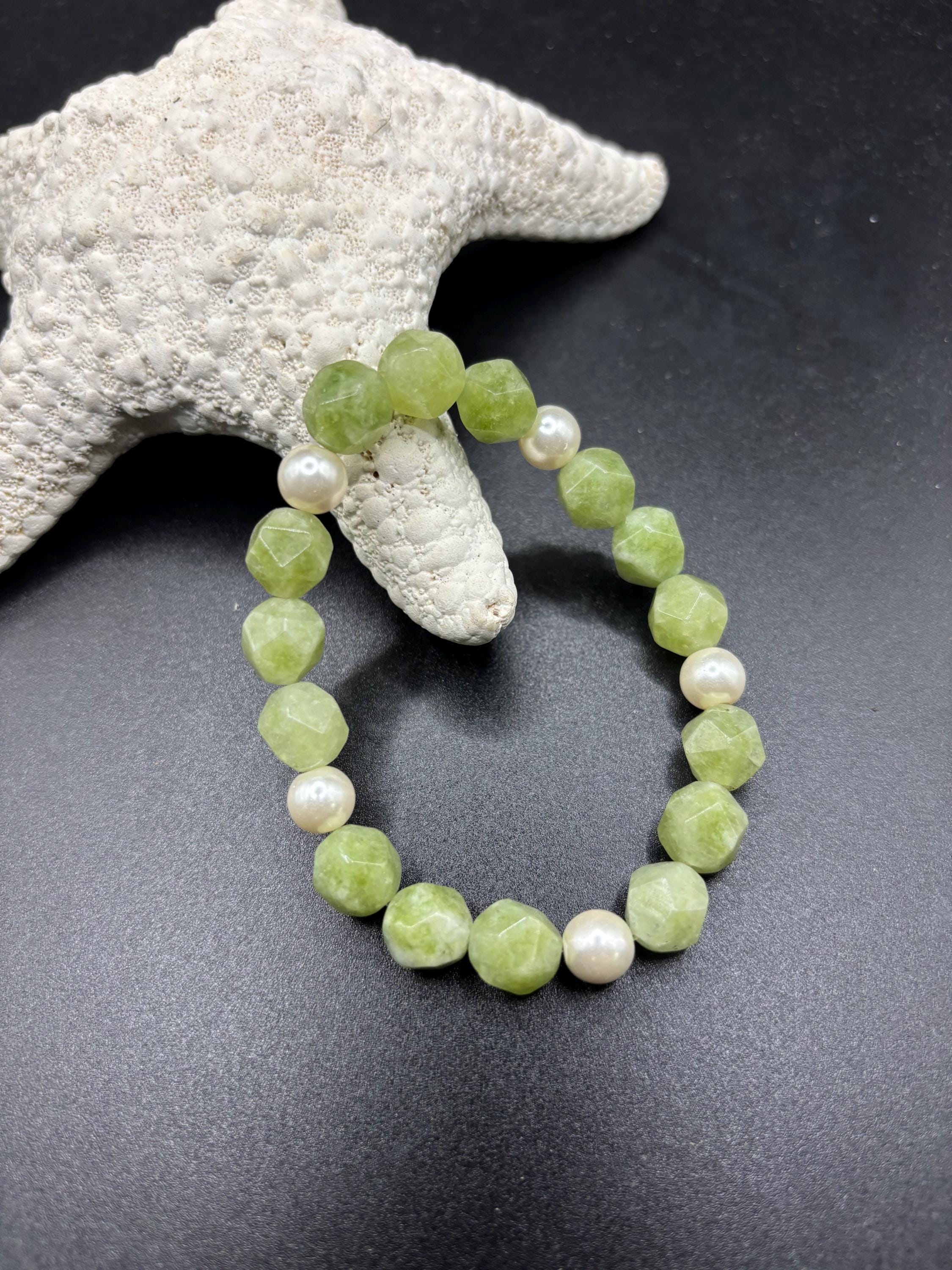 This pretty stretch bracelet is made with faceted Peridot gemstones and pearls.