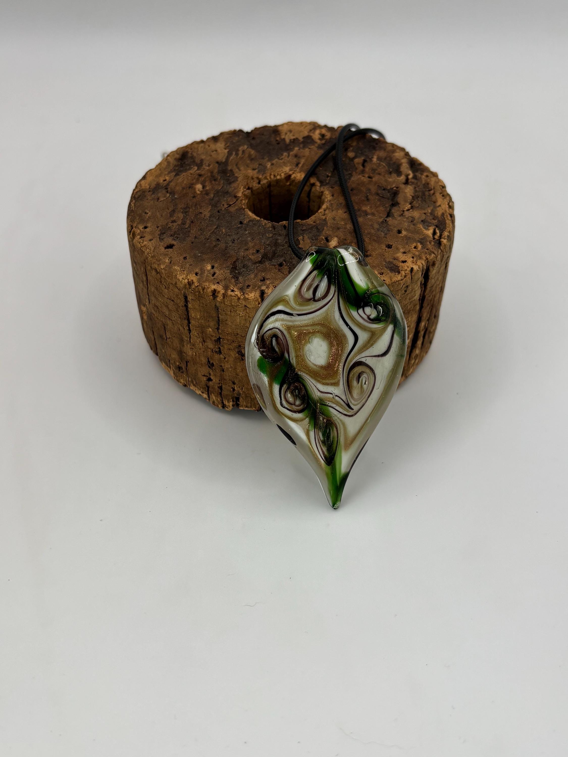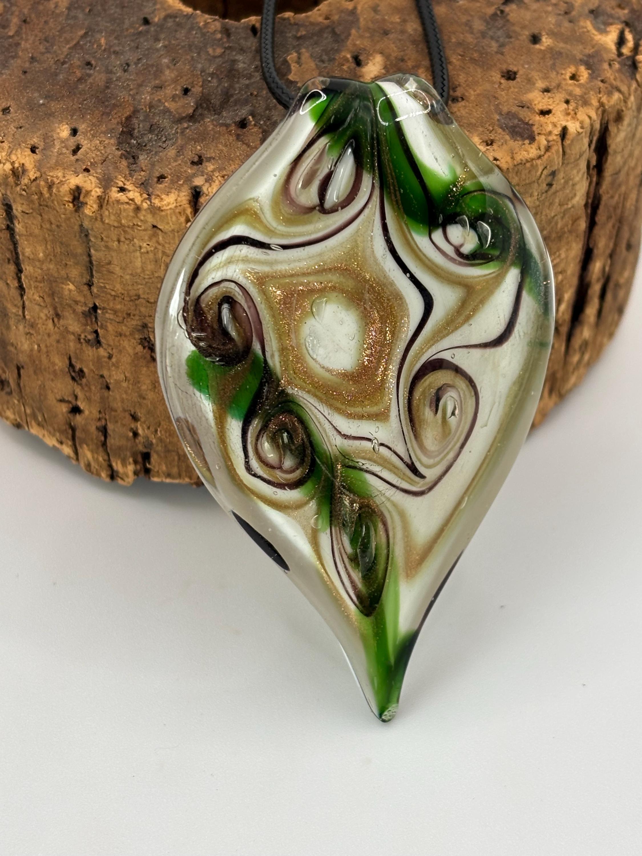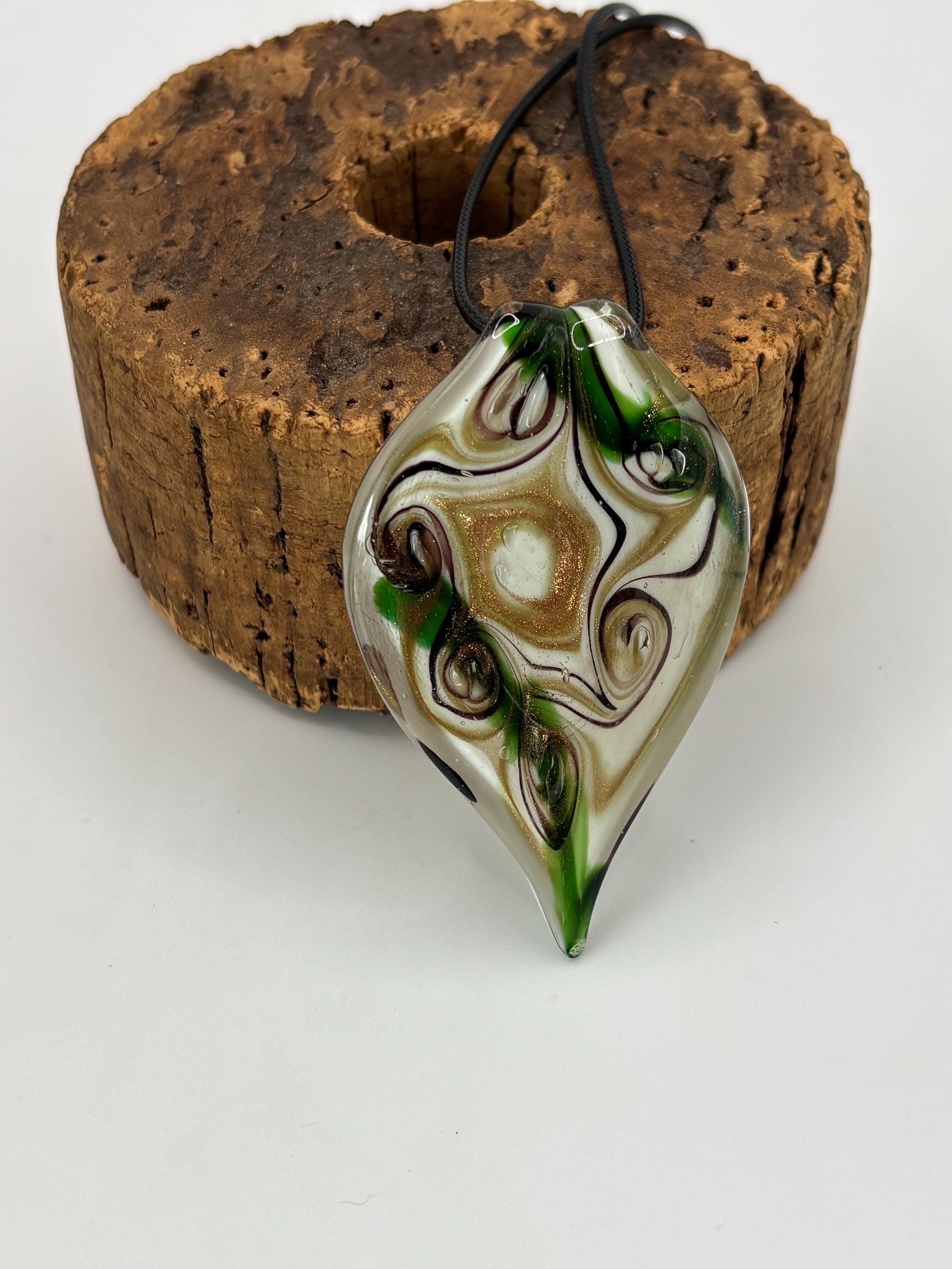 This is a Glass Lampwork leaf necklace pendant. This Murano inspired glass is definitely giving off a retro vibe!