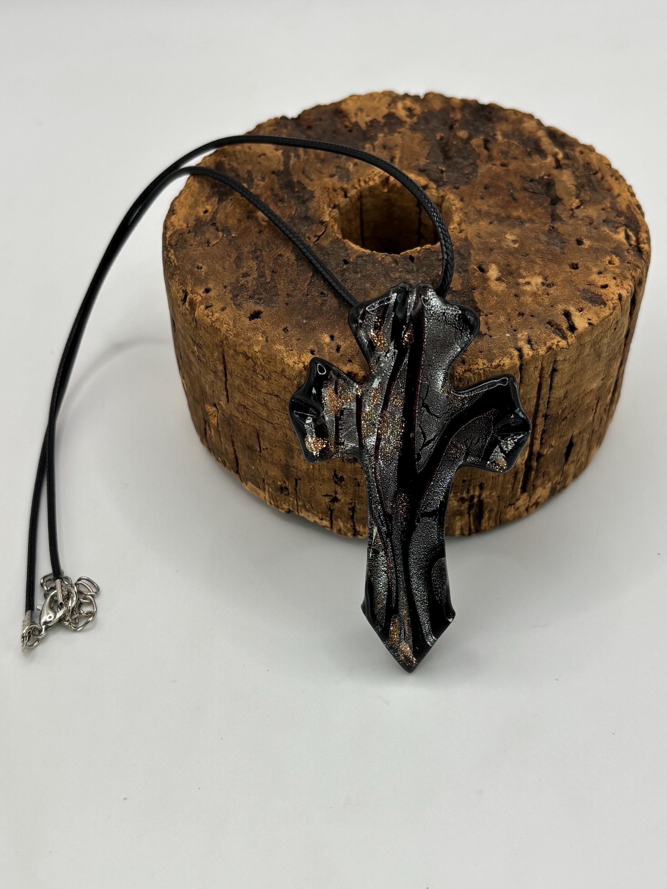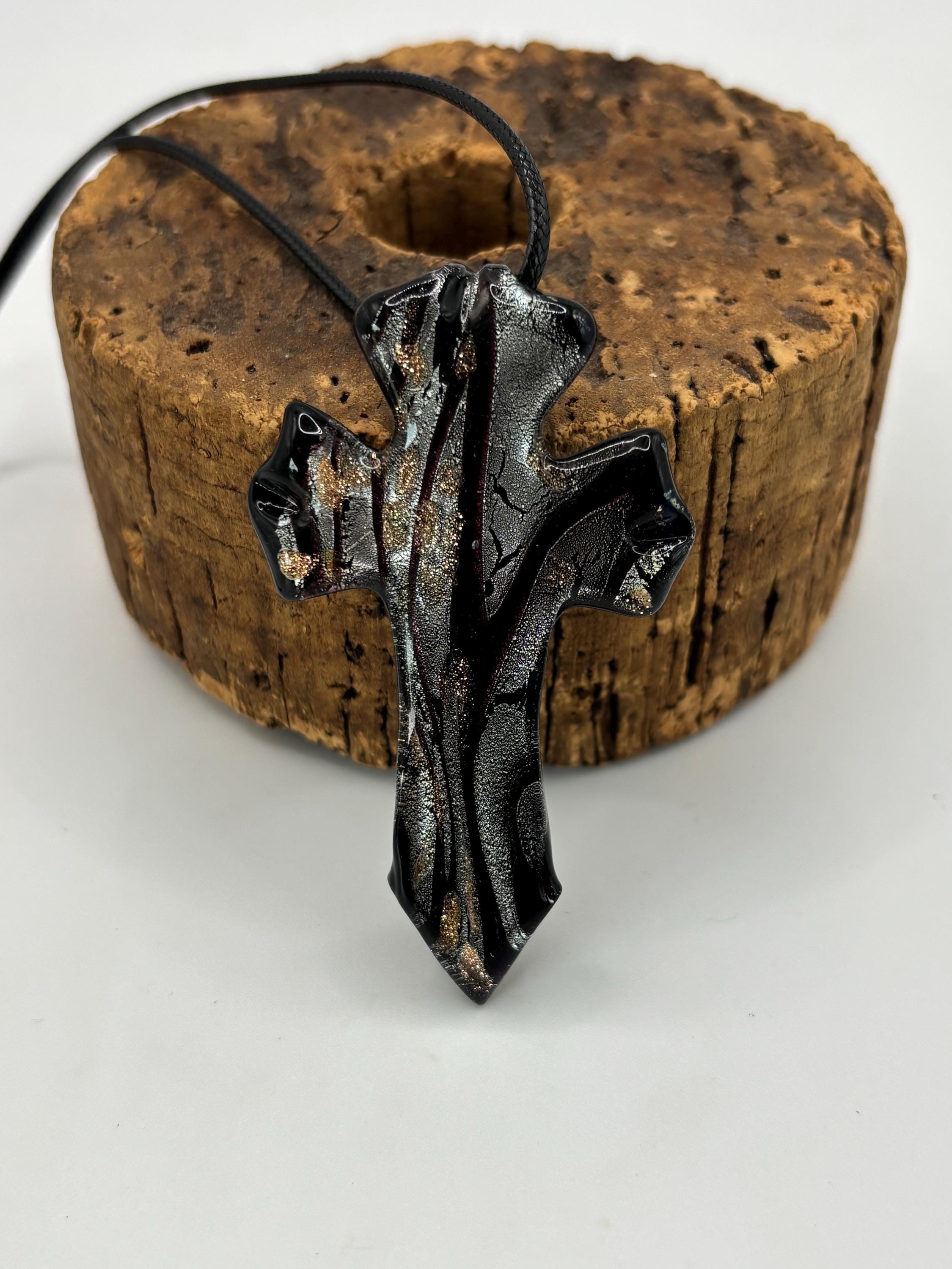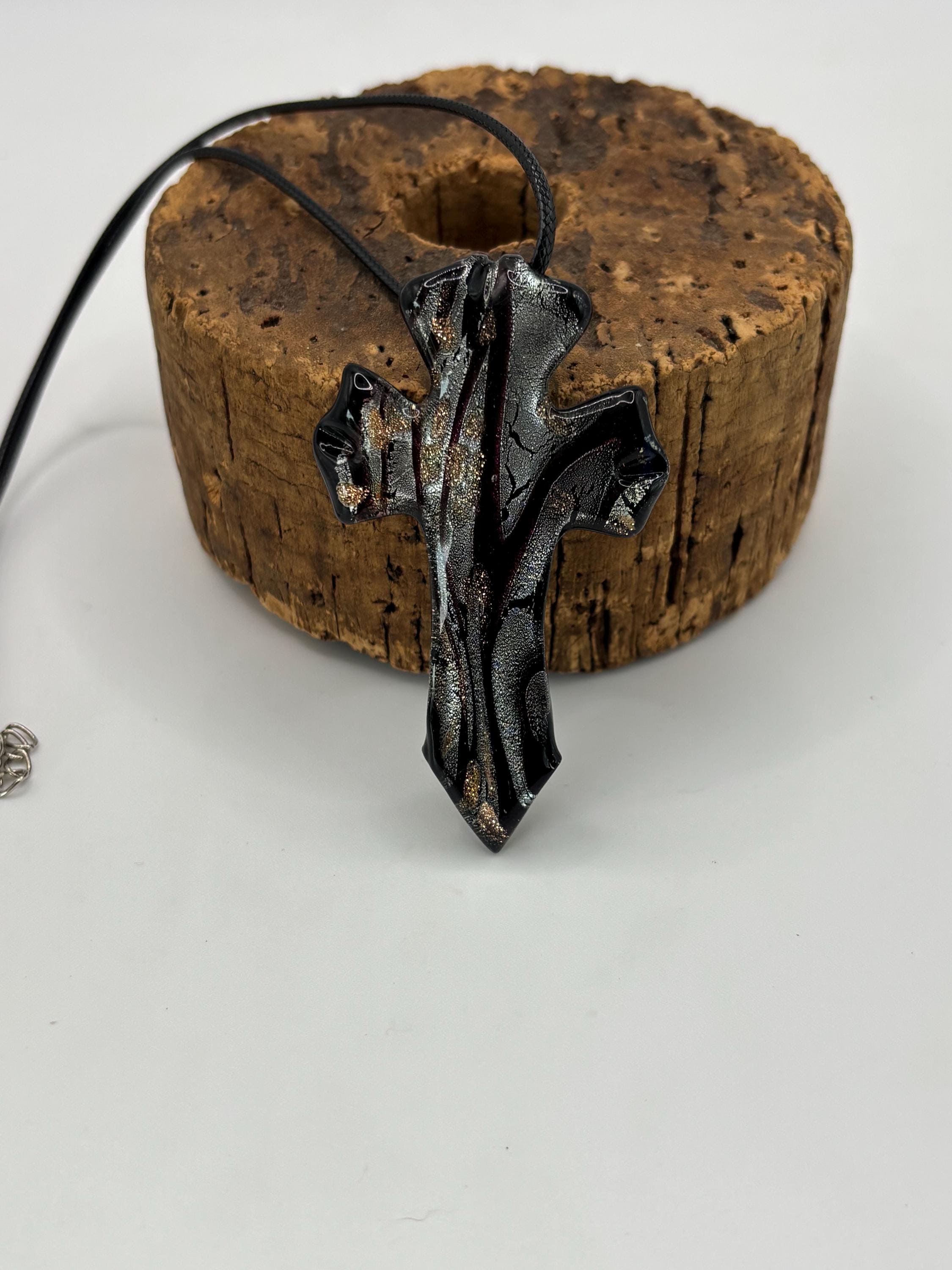 These necklaces are a Murano inspired glass crosses and are black with silver foil.