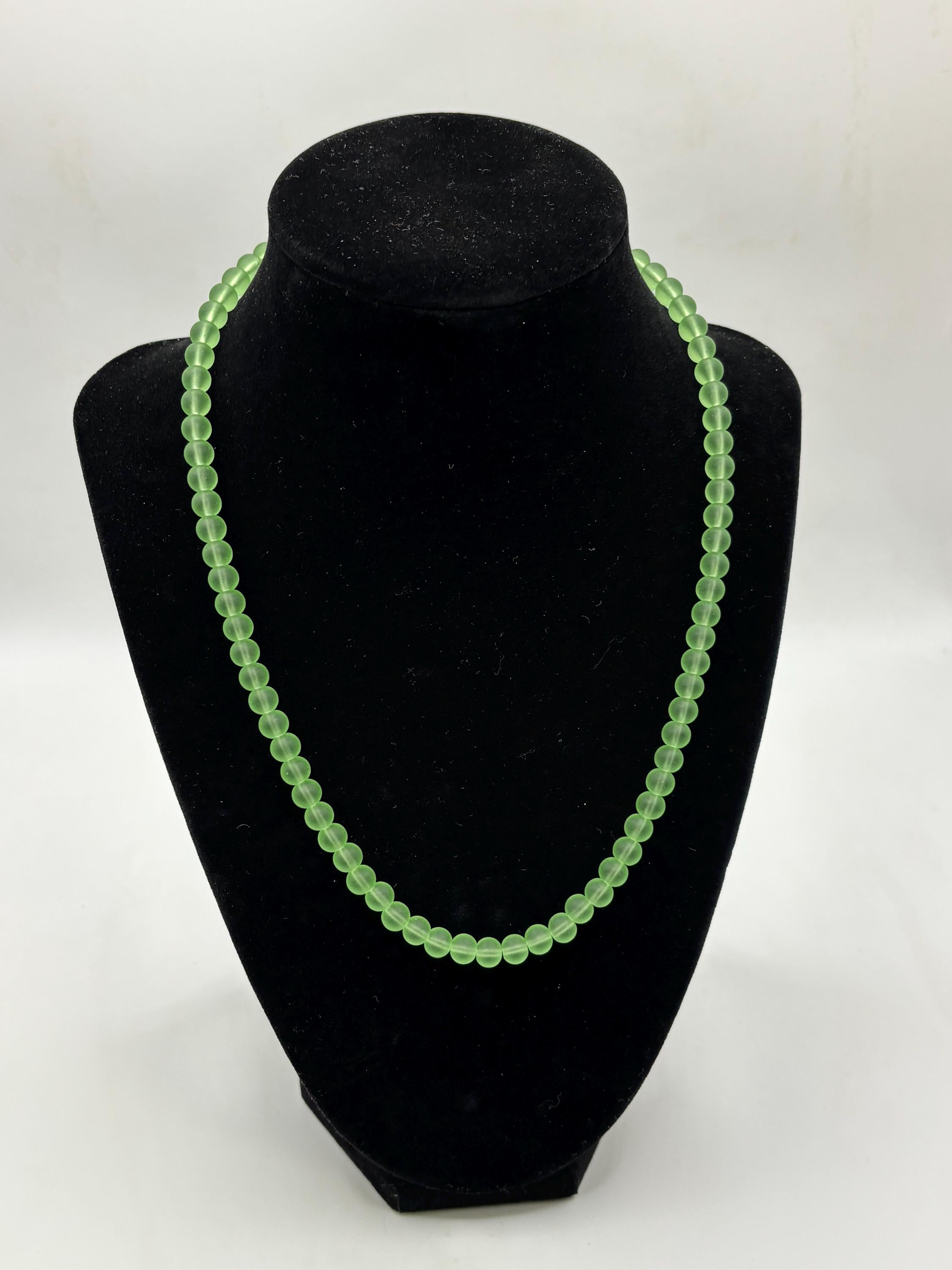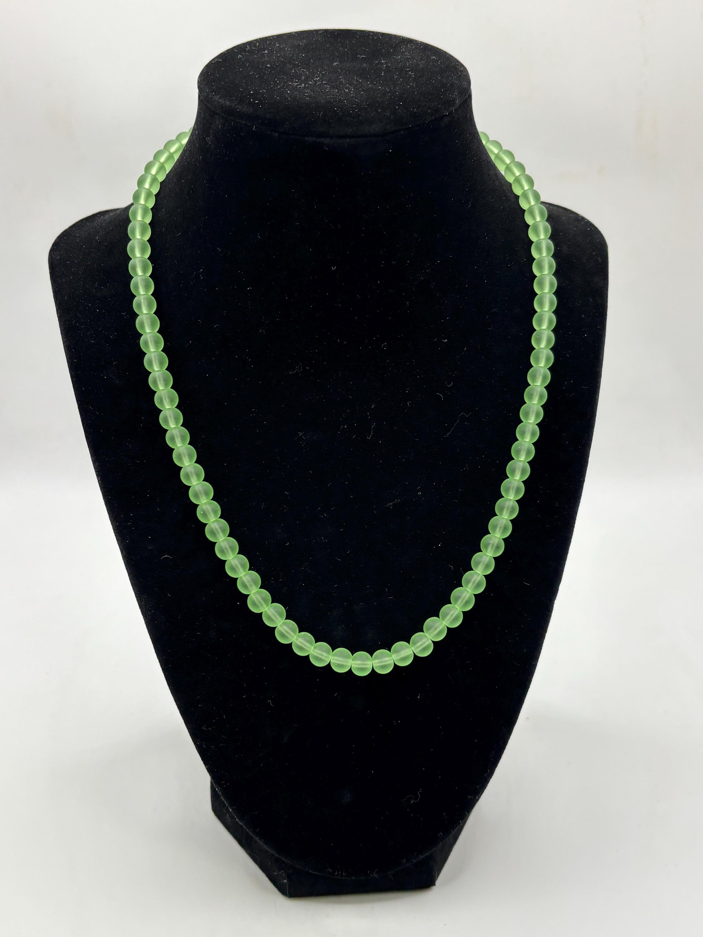 This is a simple yet beautiful Seaglass necklace made with Periot green Seaglass. The round Seaglass beads are 6mm. this necklace is making a statement for sure.