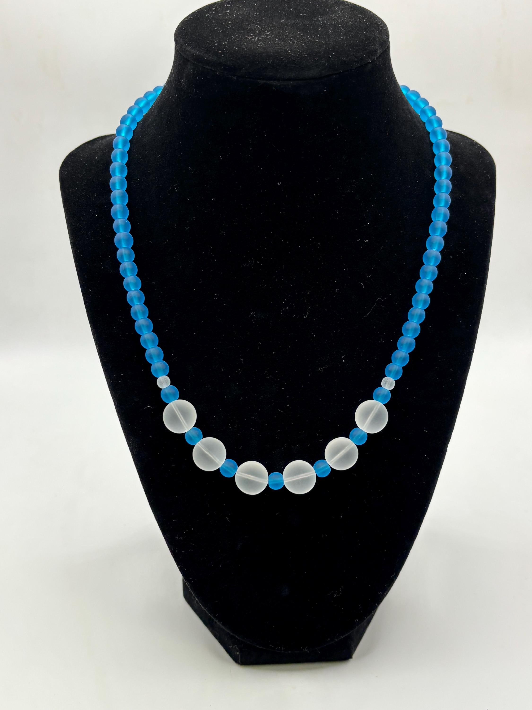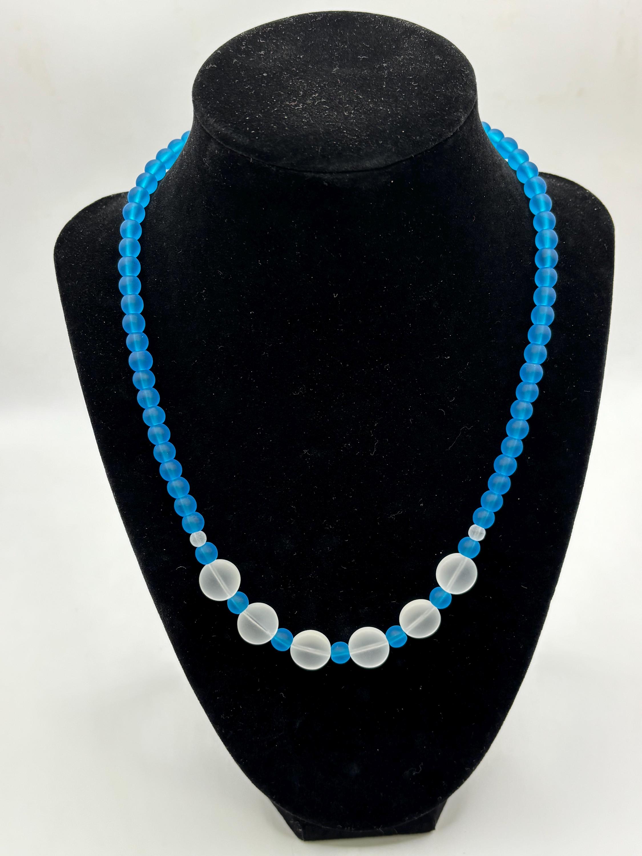 This is a simple yet beautiful Seaglass necklace made with peacock blue and white Seaglass. The round Seaglass beads are 6mm with larger white Seaglass rounds , so this necklace is making a statement for sure.