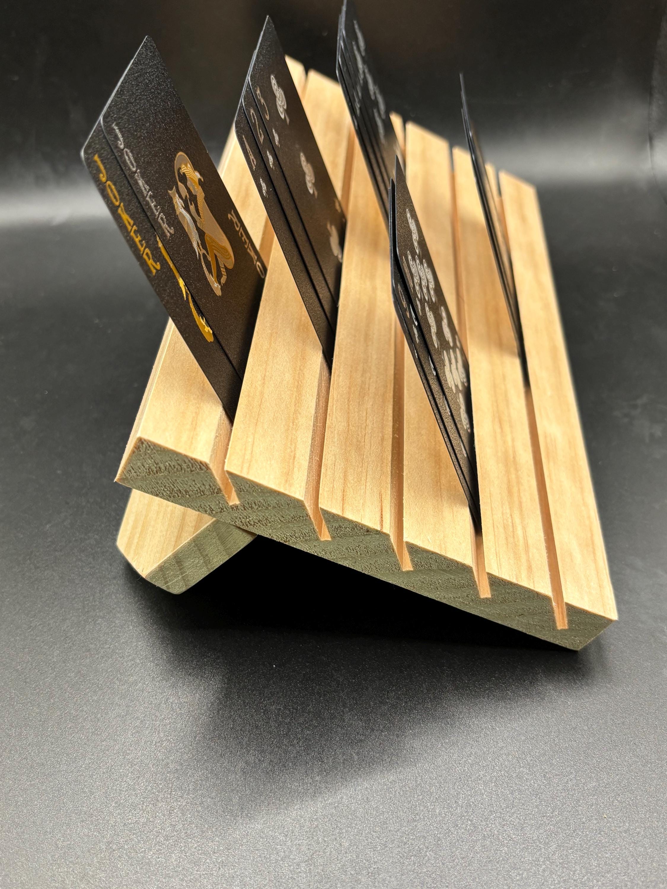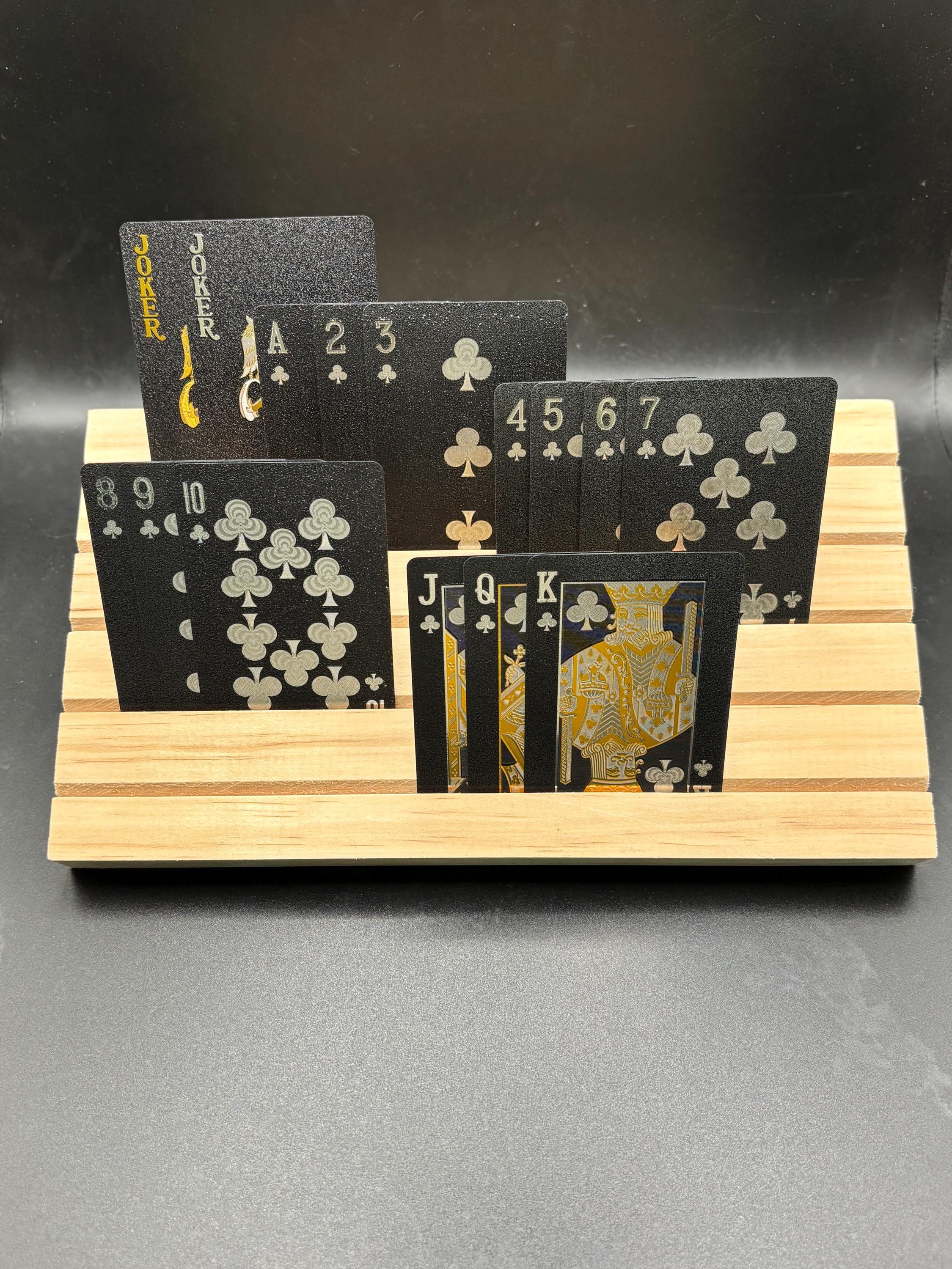 Let the games begin! We have been using these to play Hand and Foot and also Samba. we travel with them and they measure 10 inches in length and 5 1/2 inches high. The hinges and wood on the back create an angle so cards are easy to sort and see.