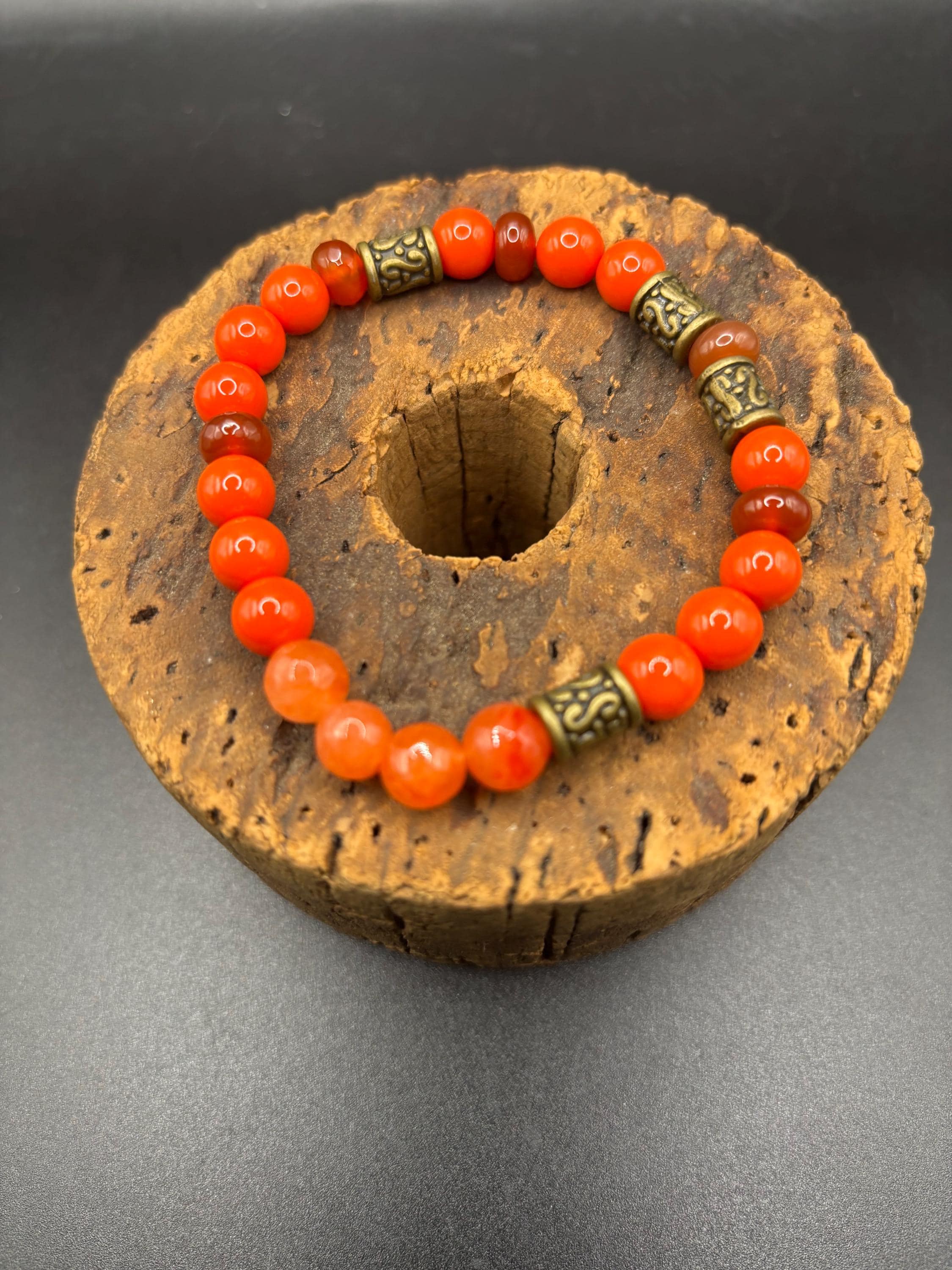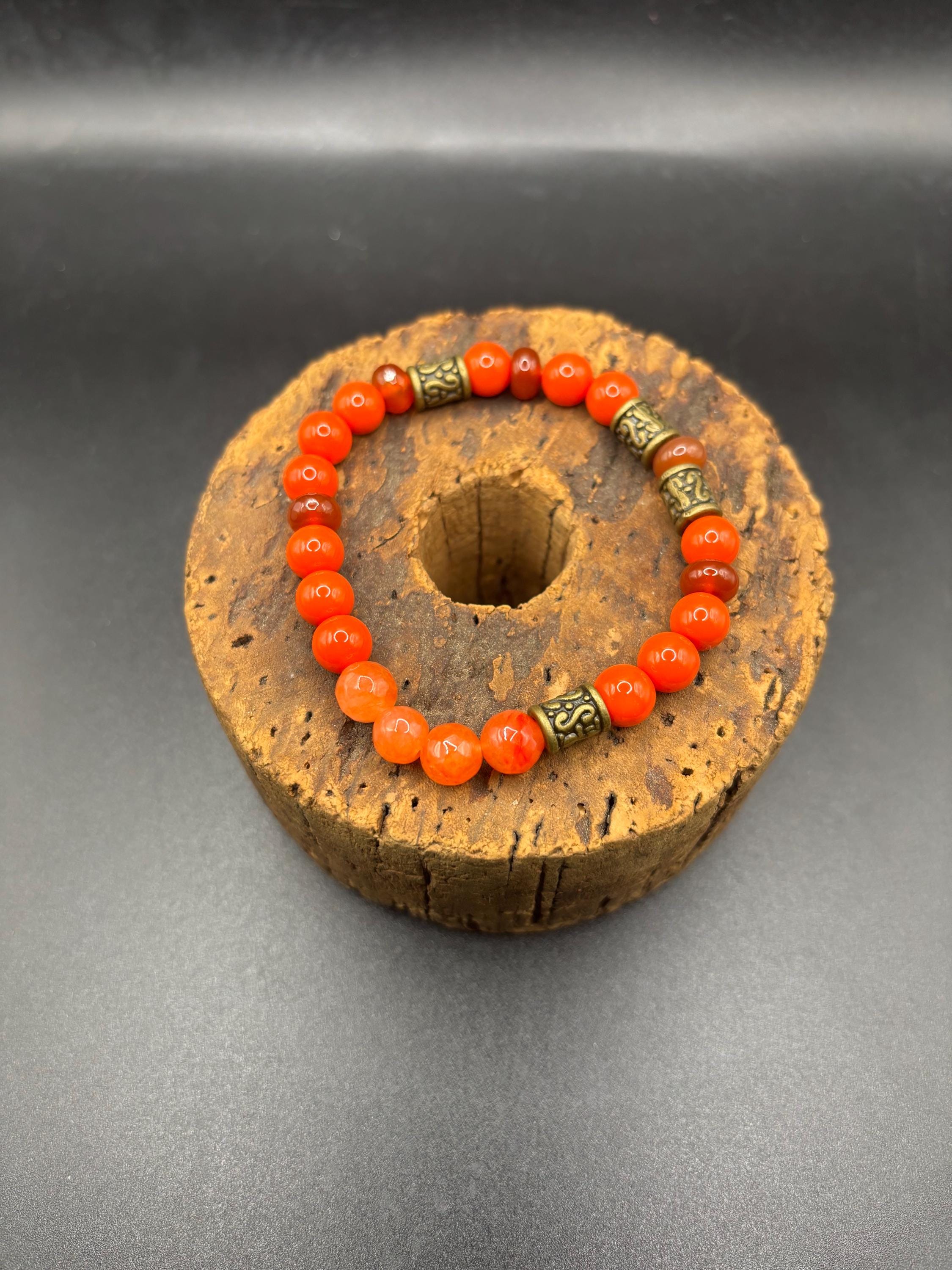 This stretch bracelet is created with orange coral and carnelian gemstones