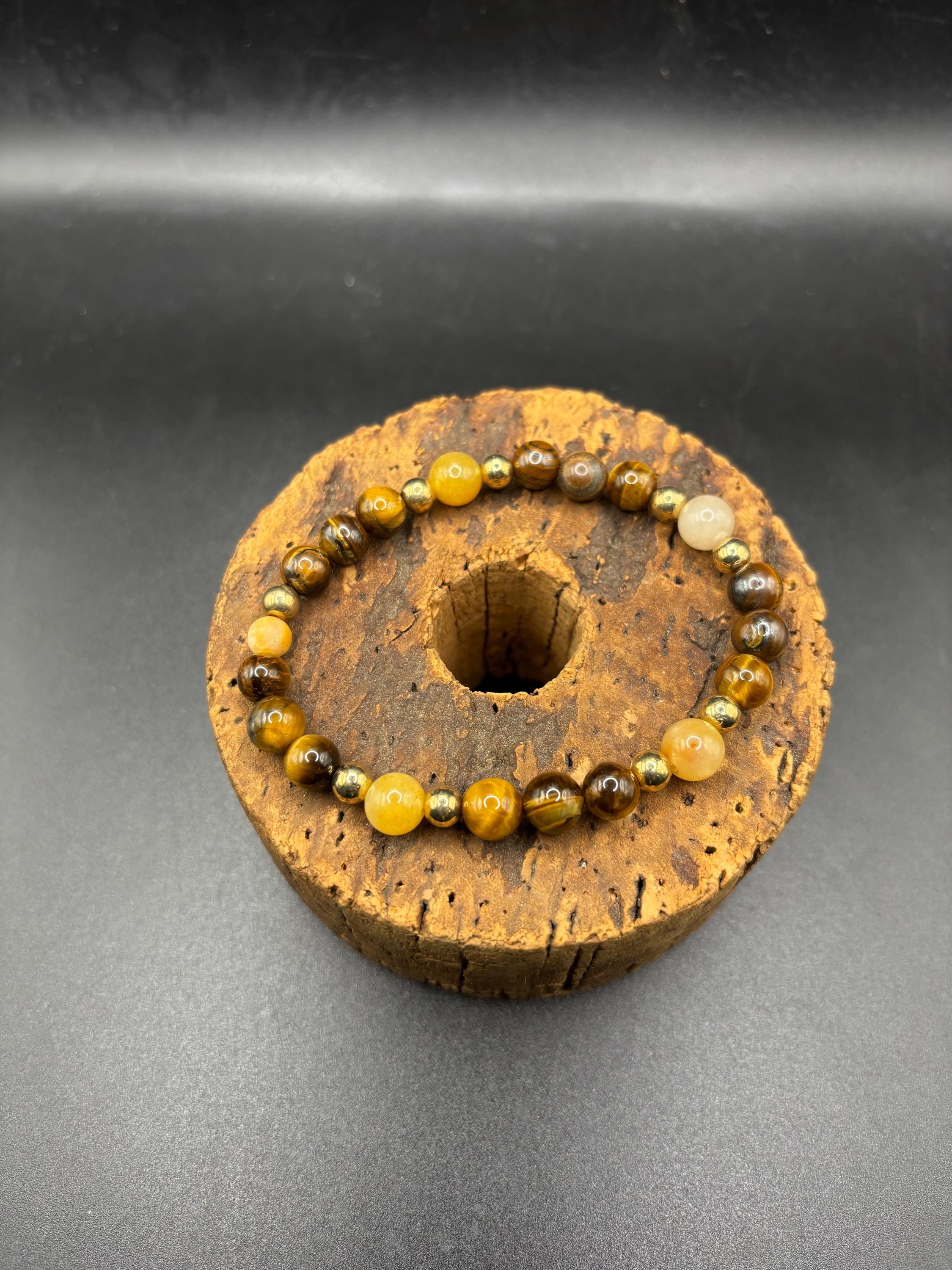 This stretch bracelet is created with brown tiger eye and yellow jade gemstones