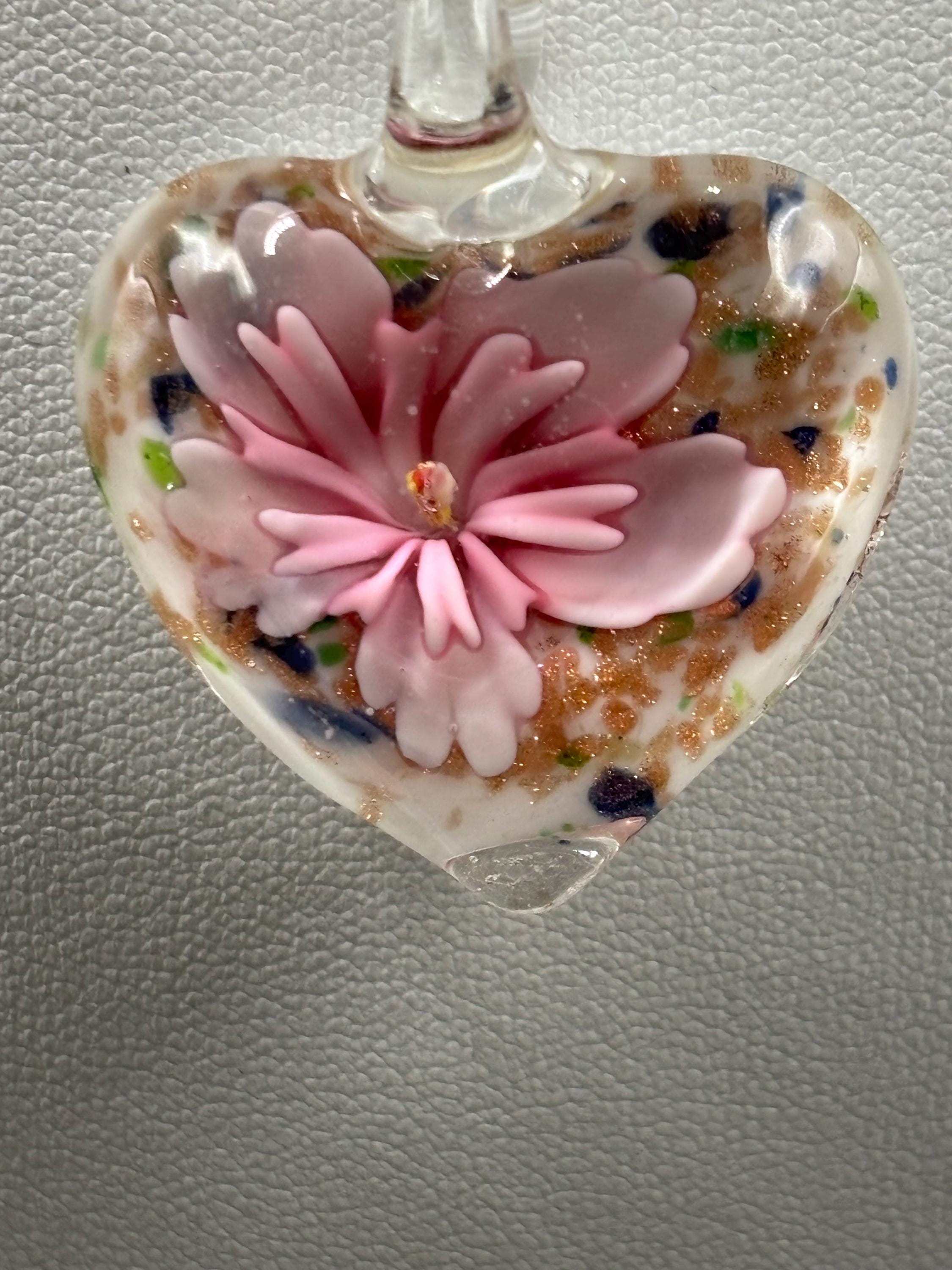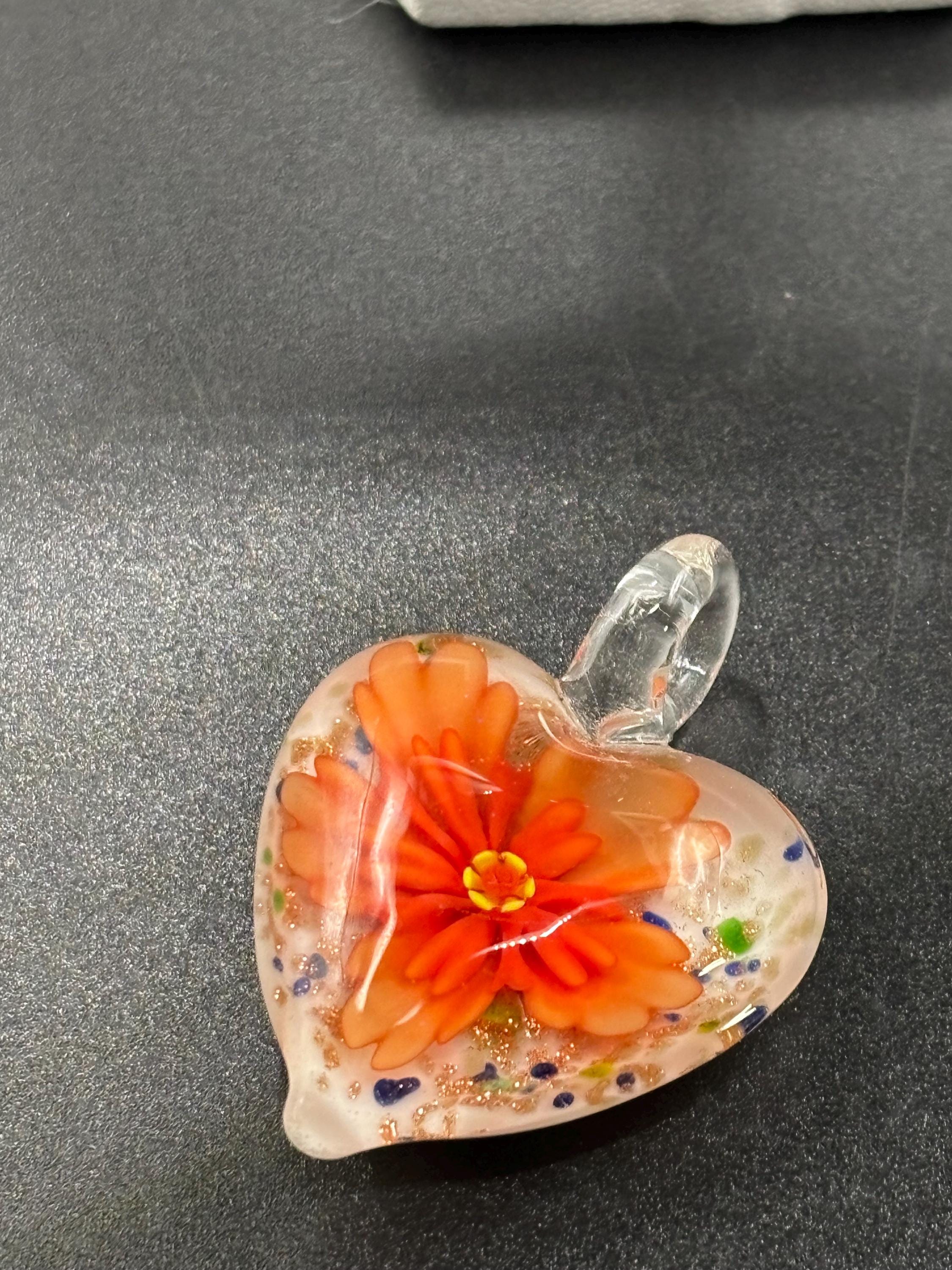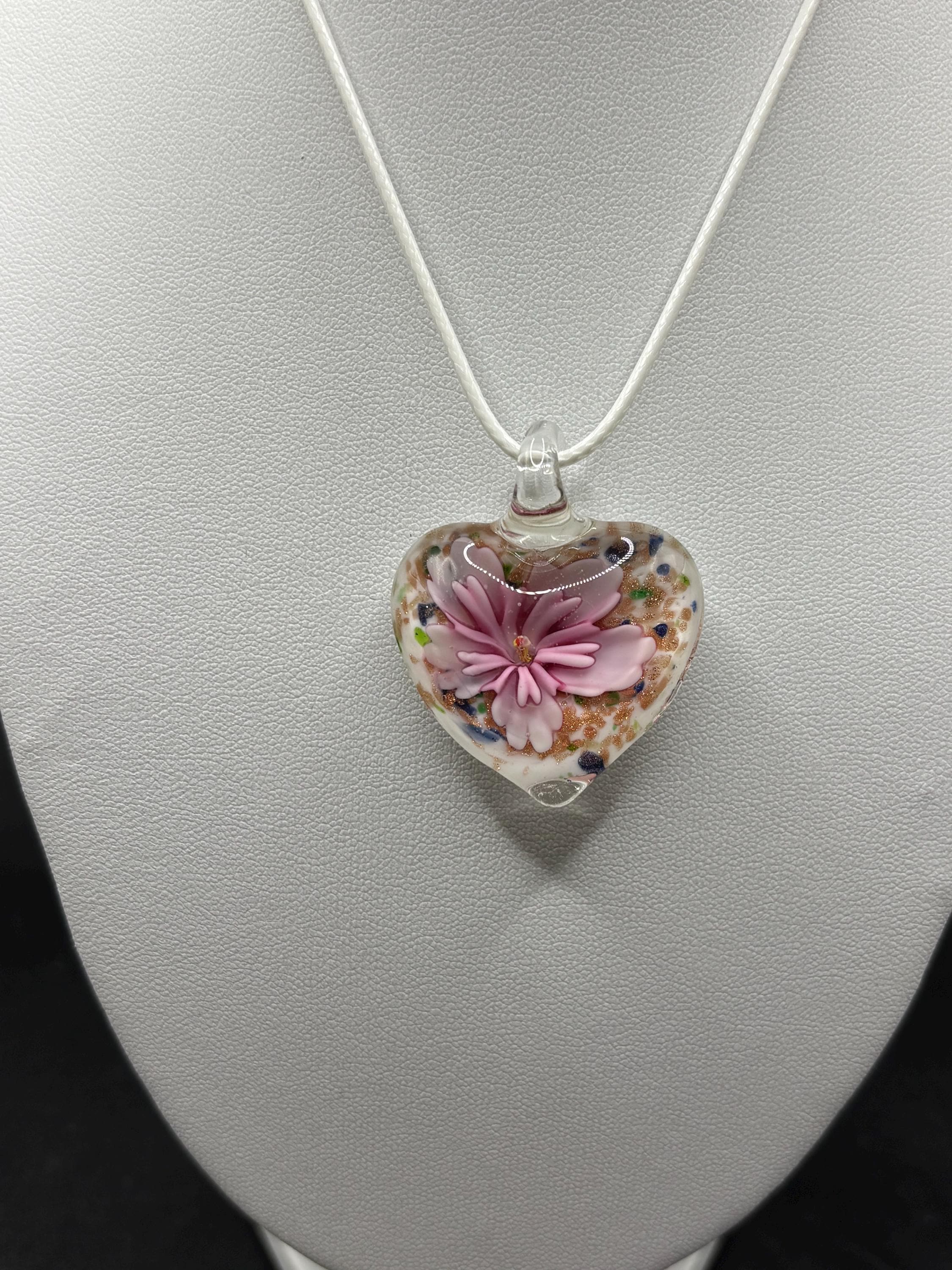 This necklace is made with in a Glass heart shape and has an inlaid flower in the middle. Lampwork Heart necklace, Murano inspired with colorful flowers .
