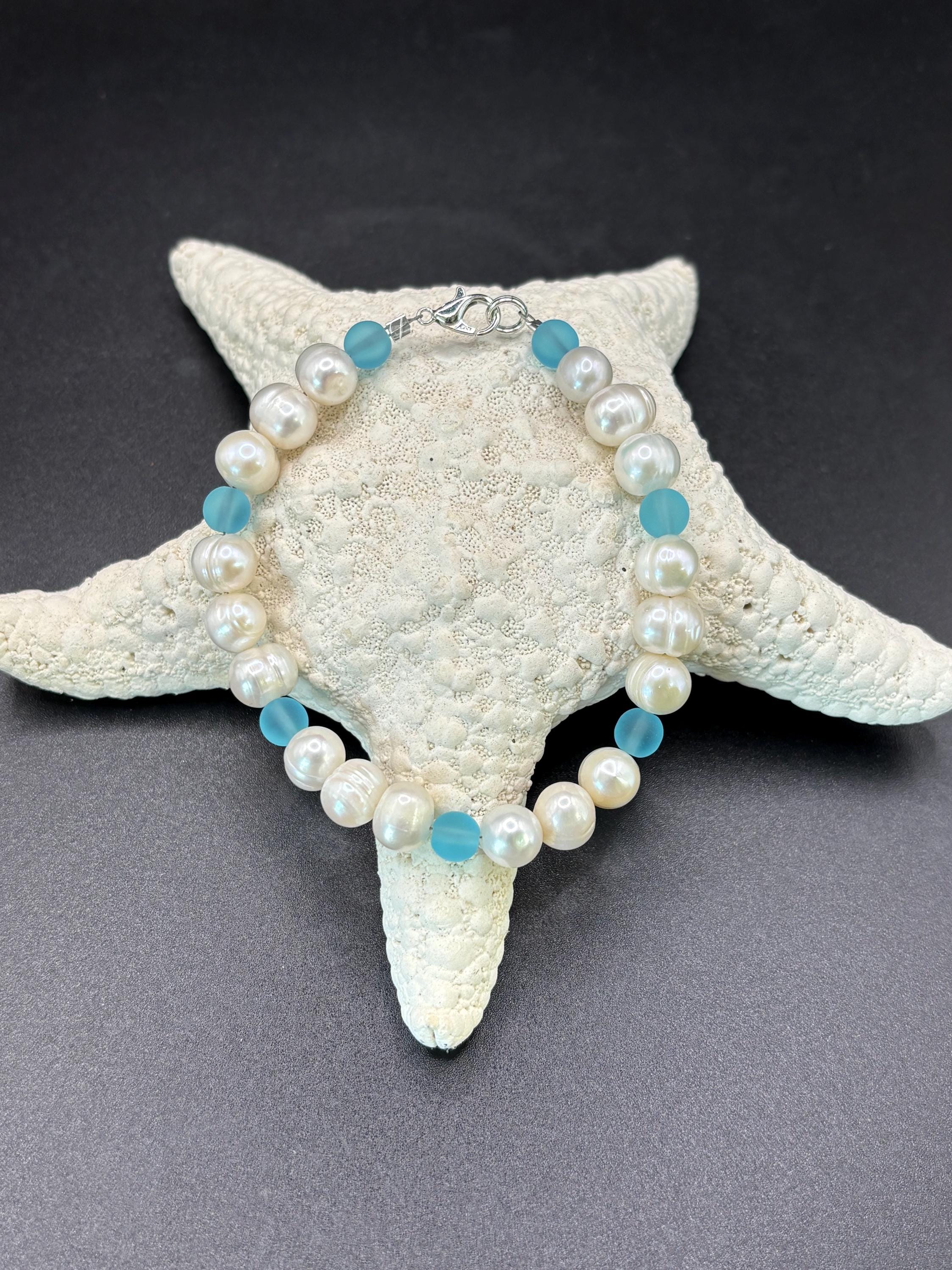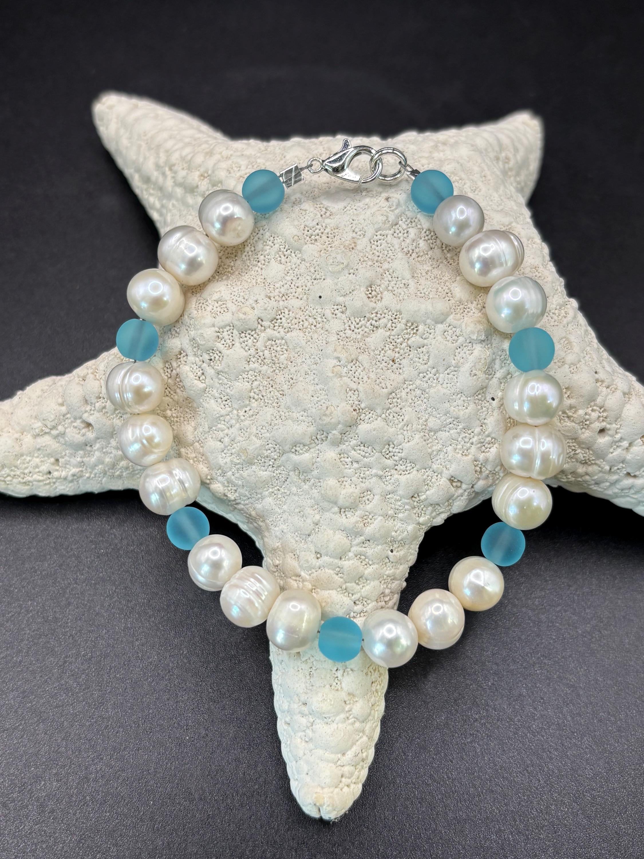 This beautiful Seaglass bracelet is made with turquoise blue Seaglass and freshwater pearls